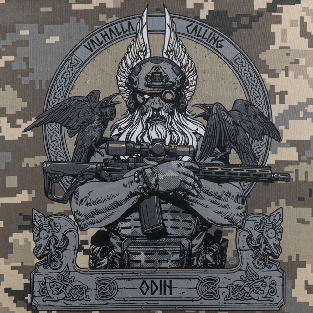 The print features a determined Odin, who has traded his traditional spear (Gungnir) for an AR-15 rifle. Wearing modern combat gear and a helmet with night-vision goggles, he is ready to lead his warriors into the final battle. Sitting on his shoulder are his faithful companions—Huginn (thought) and Muninn (memory)—ravens who fly across the Nine Realms and report everything they see to the Allfather.