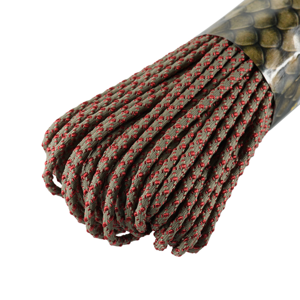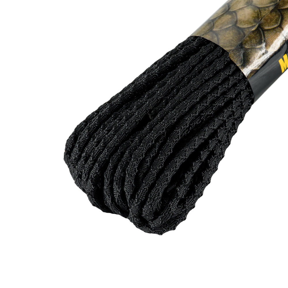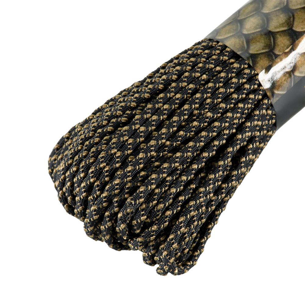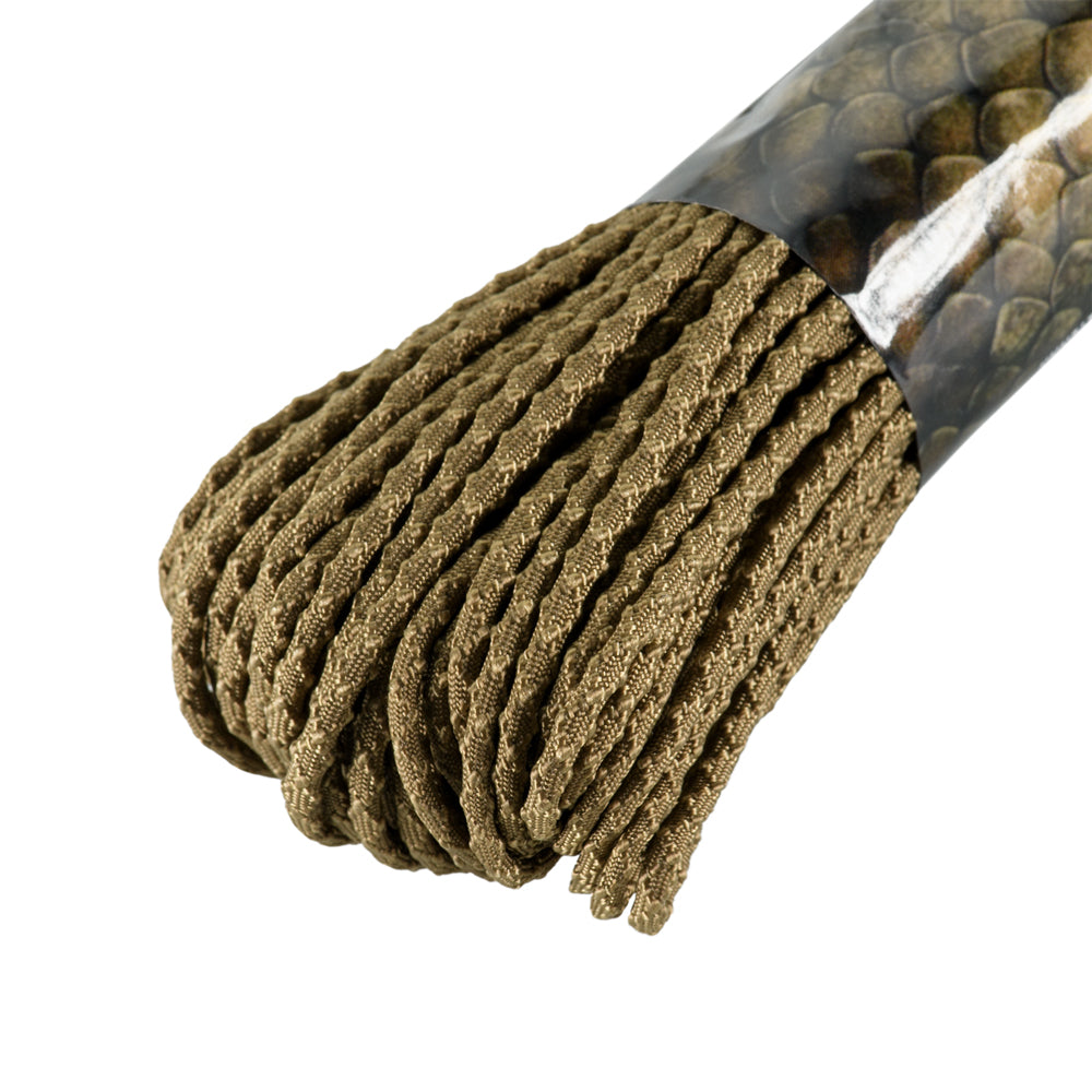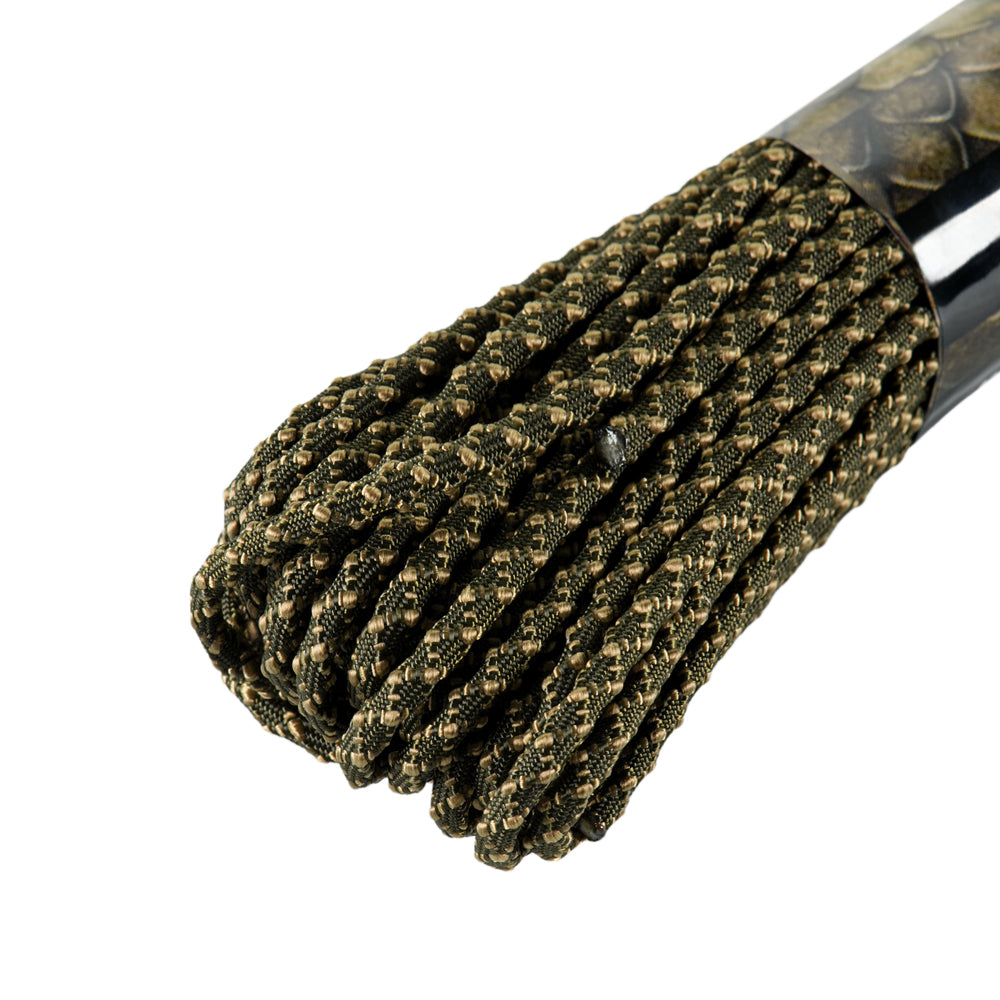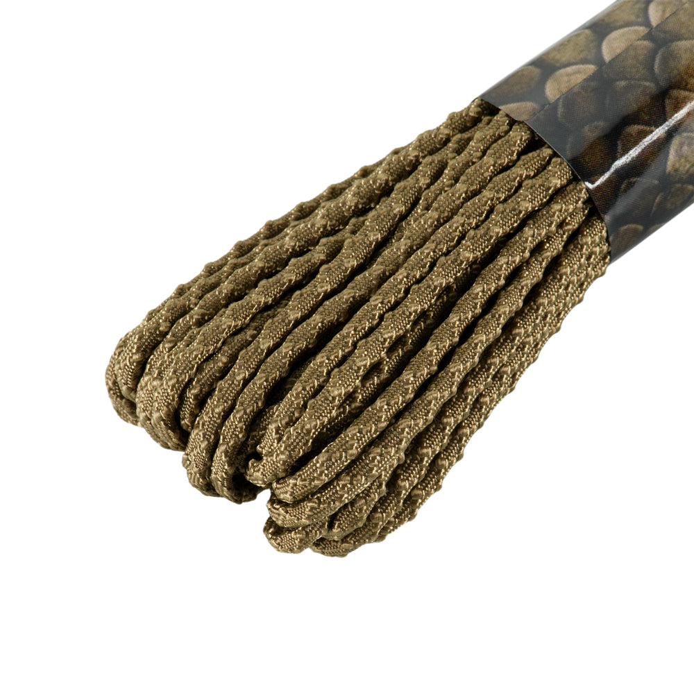 The paracord is made from 100% nylon, a lightweight yet highly durable material. It consists of an outer braided sheath and an inner core, providing high tensile strength while remaining light in weight.