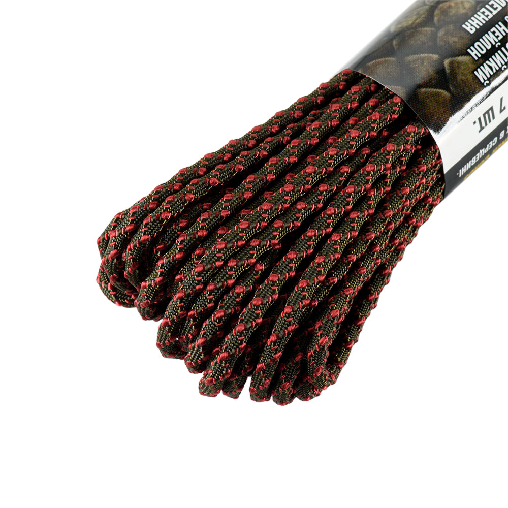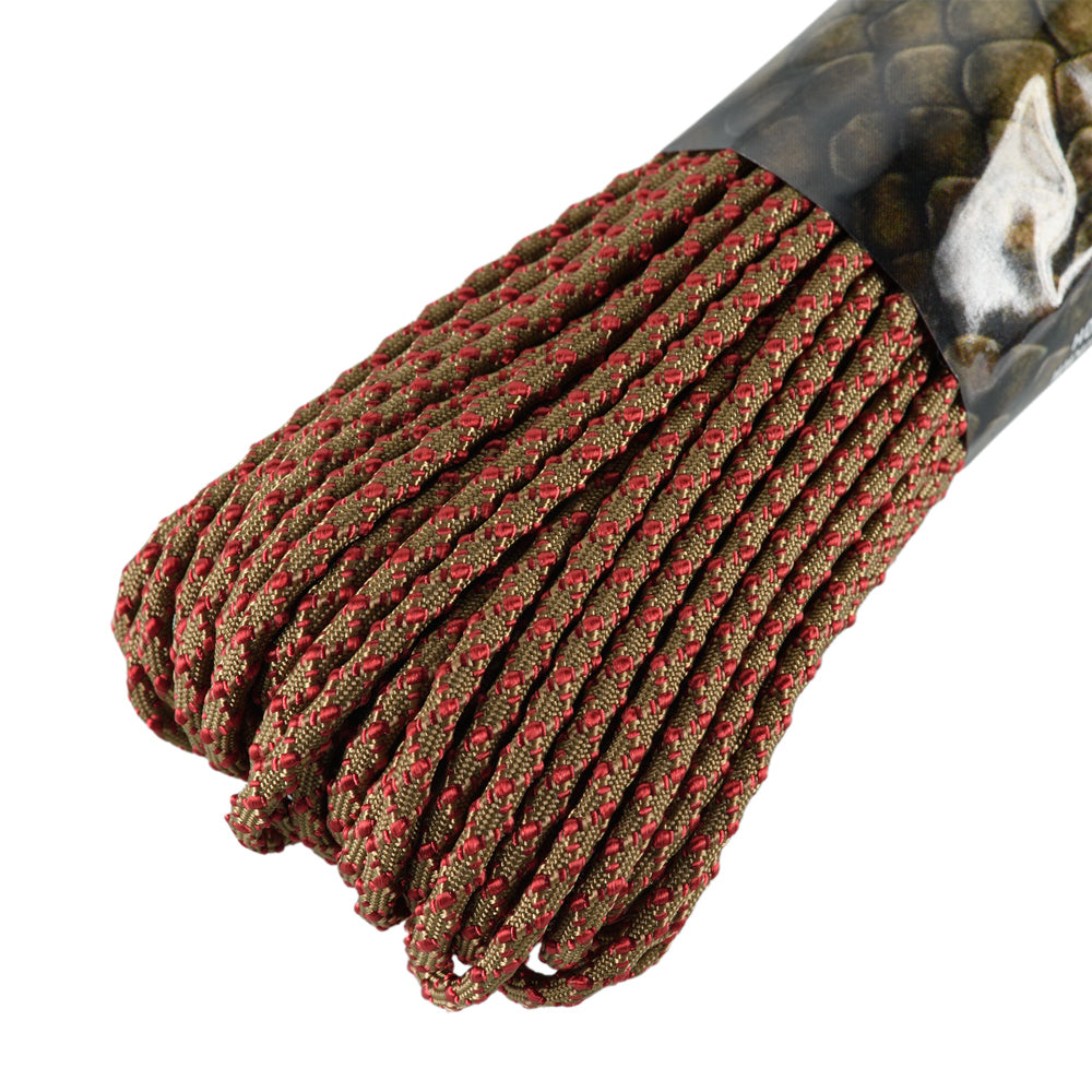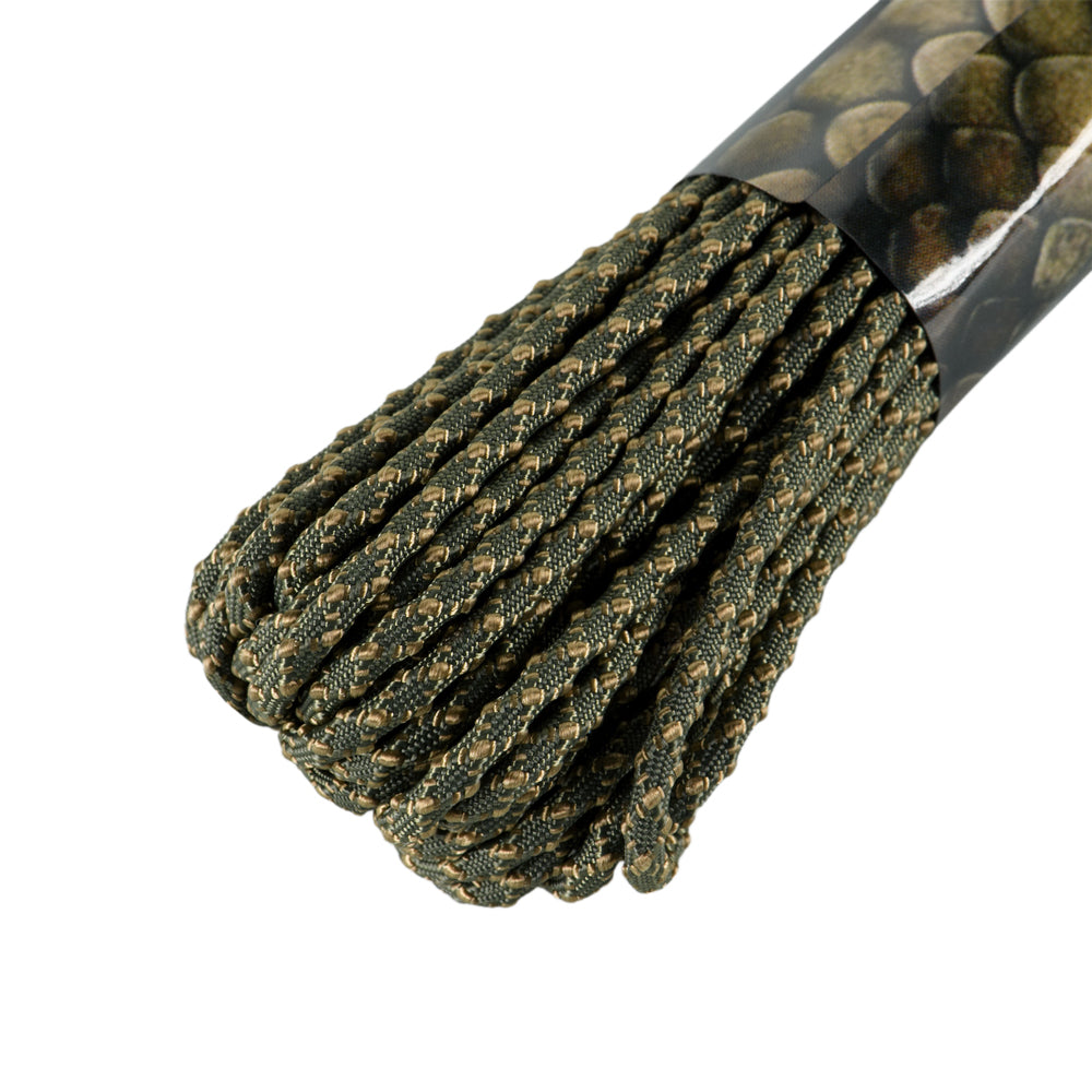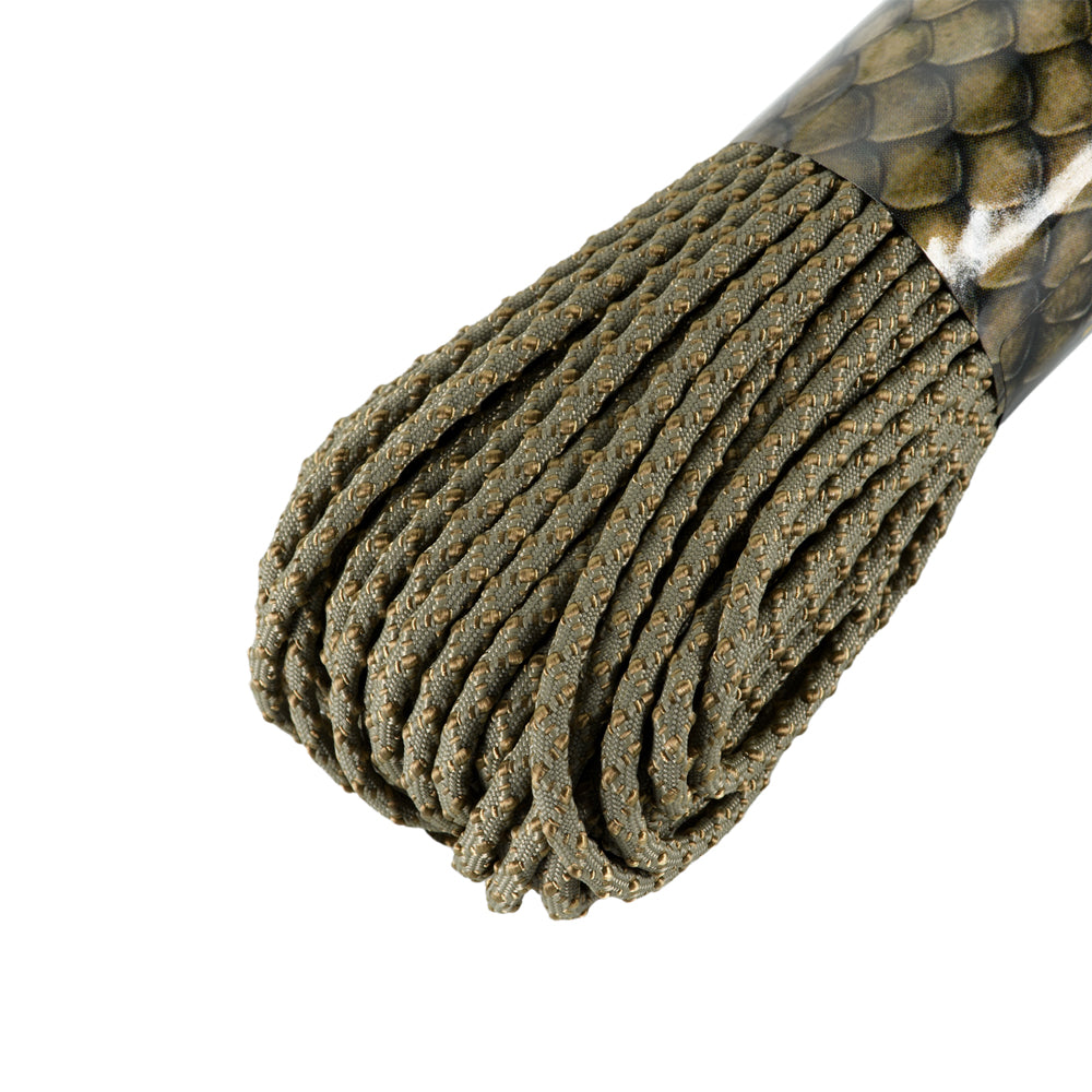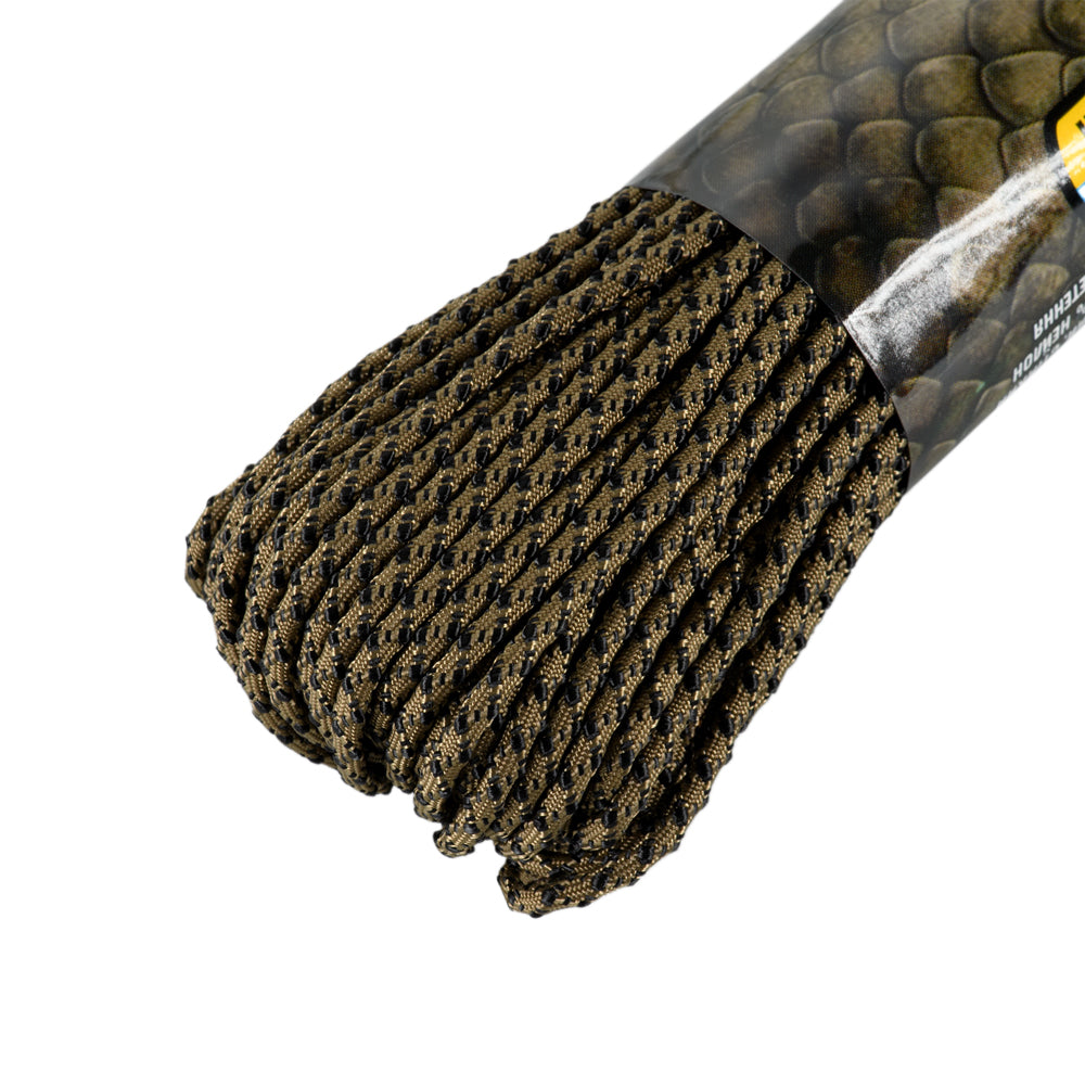 The paracord is made from 100% nylon, a lightweight yet highly durable material. It consists of an outer braided sheath and an inner core, providing high tensile strength while remaining light in weight.