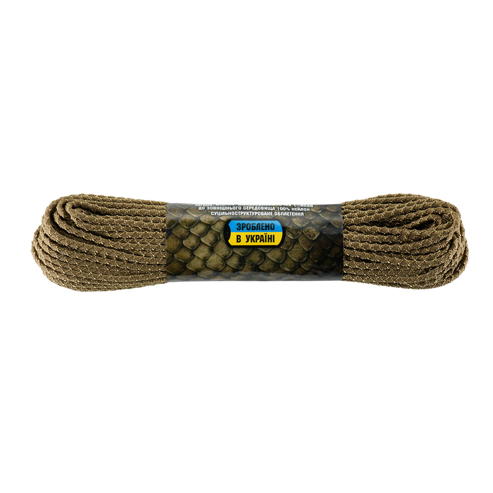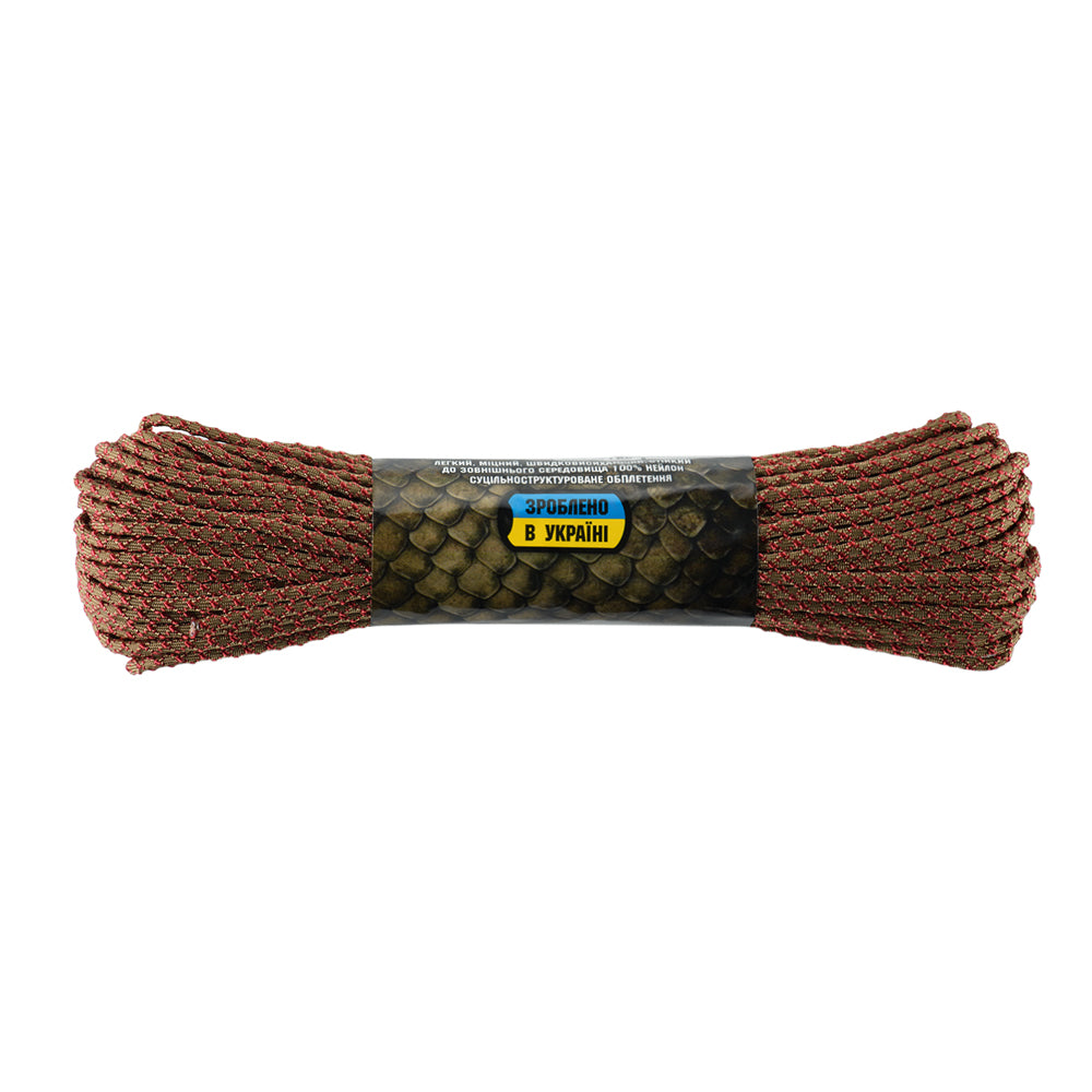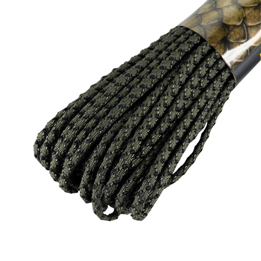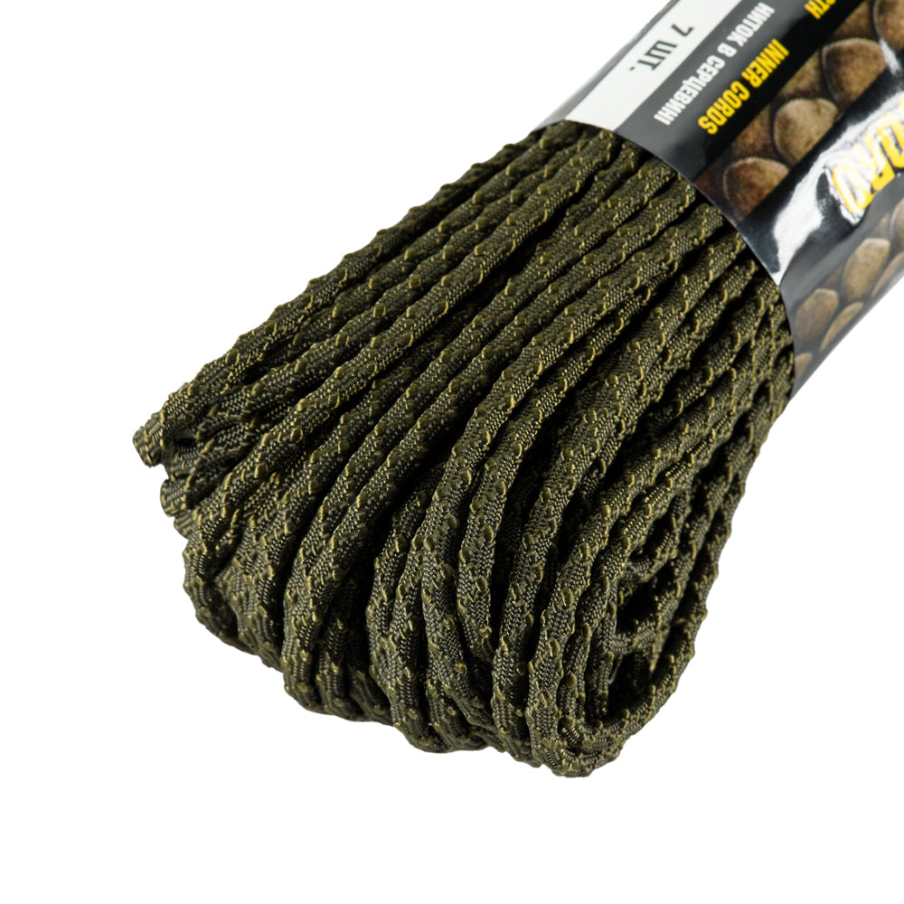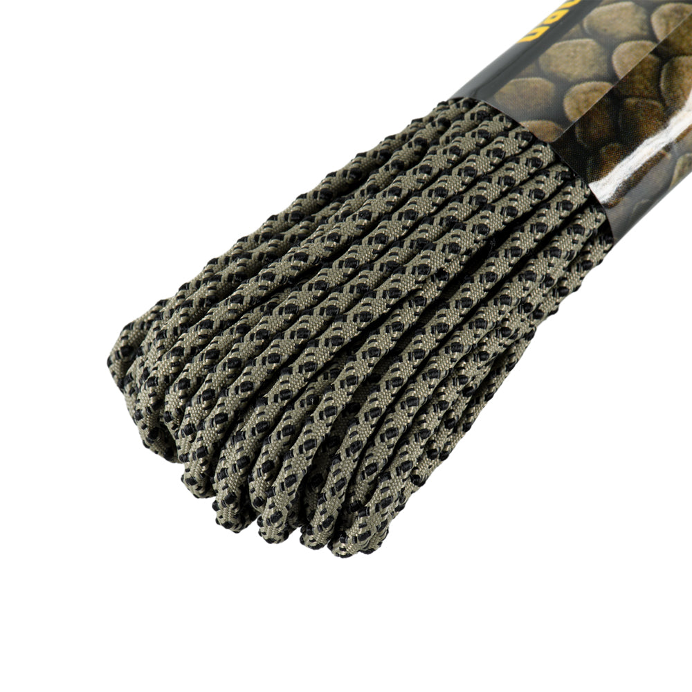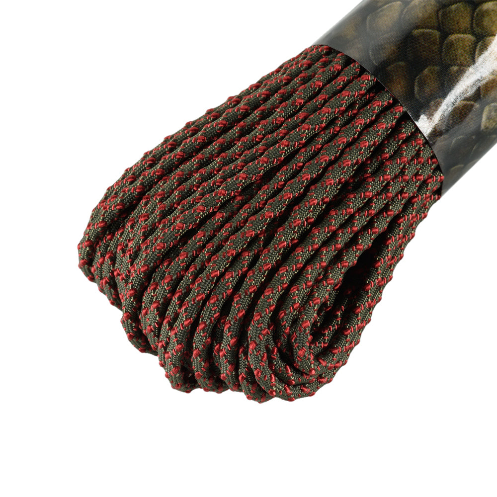 The paracord is made from 100% nylon, a lightweight yet highly durable material. It consists of an outer braided sheath and an inner core, providing high tensile strength while remaining light in weight.