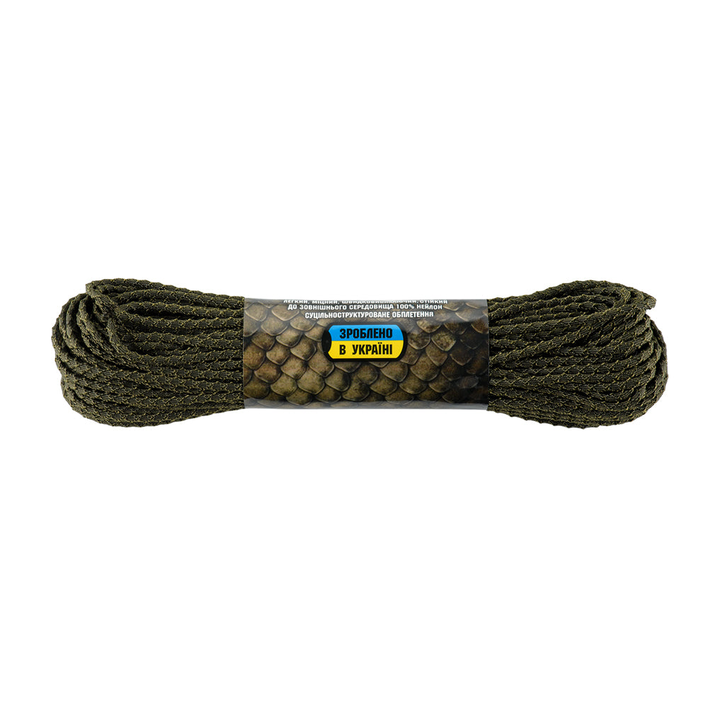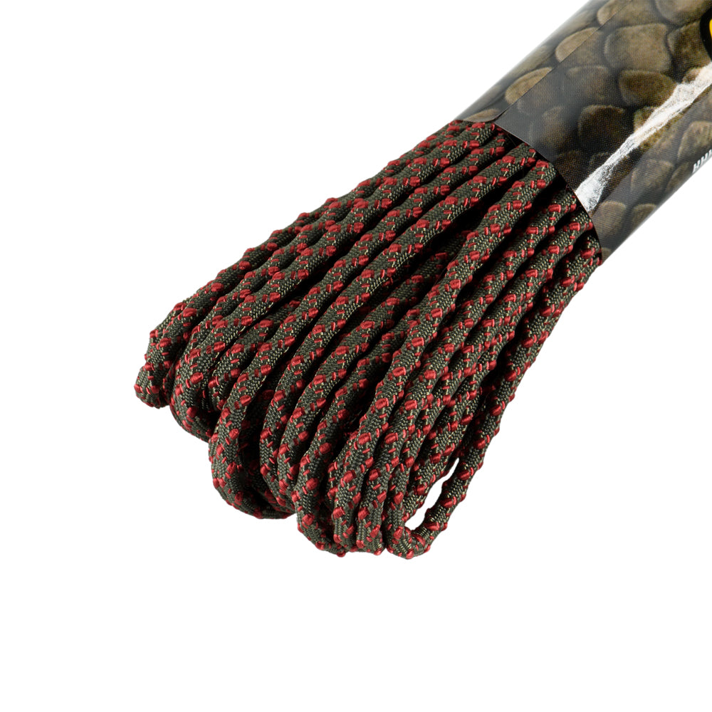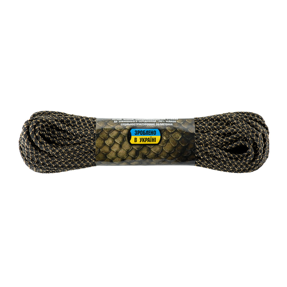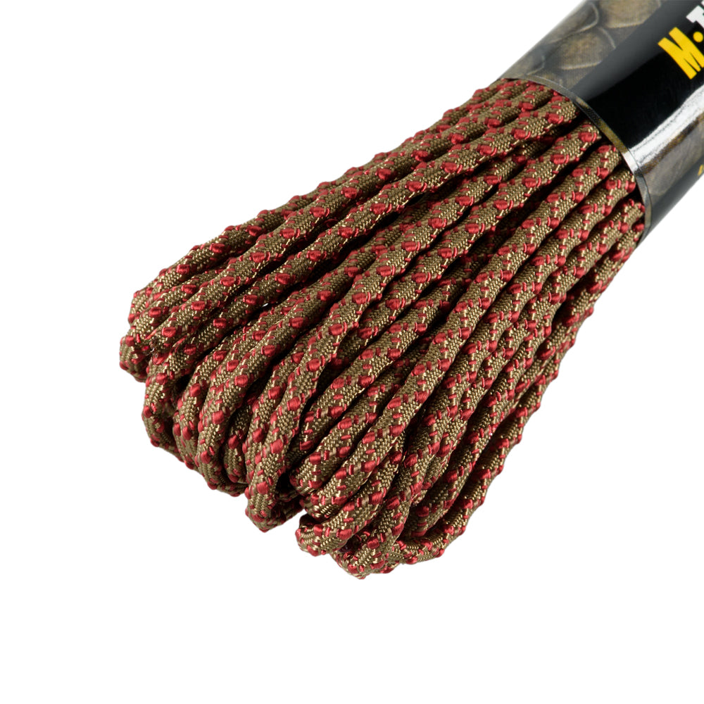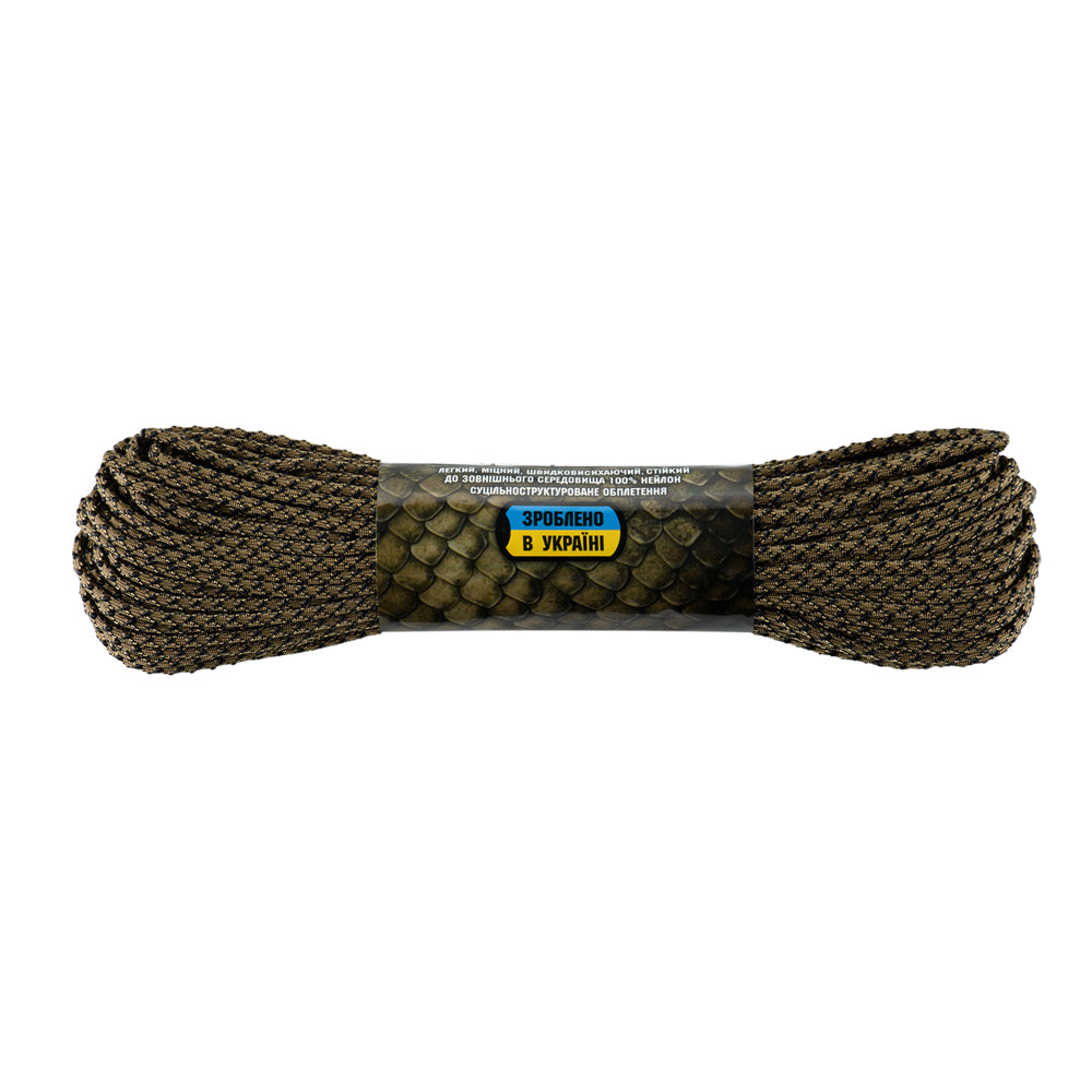 The paracord is made from 100% nylon, a lightweight yet highly durable material. It consists of an outer braided sheath and an inner core, providing high tensile strength while remaining light in weight.