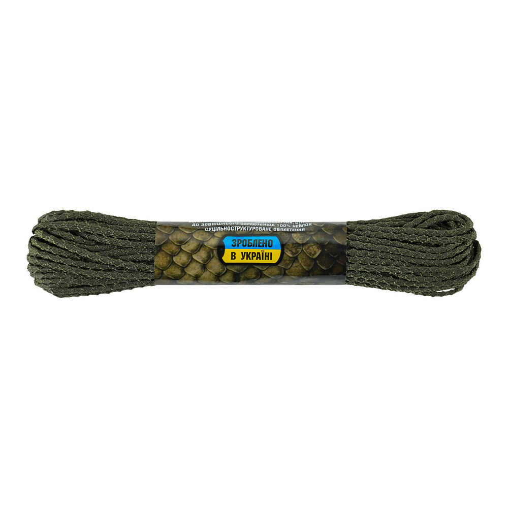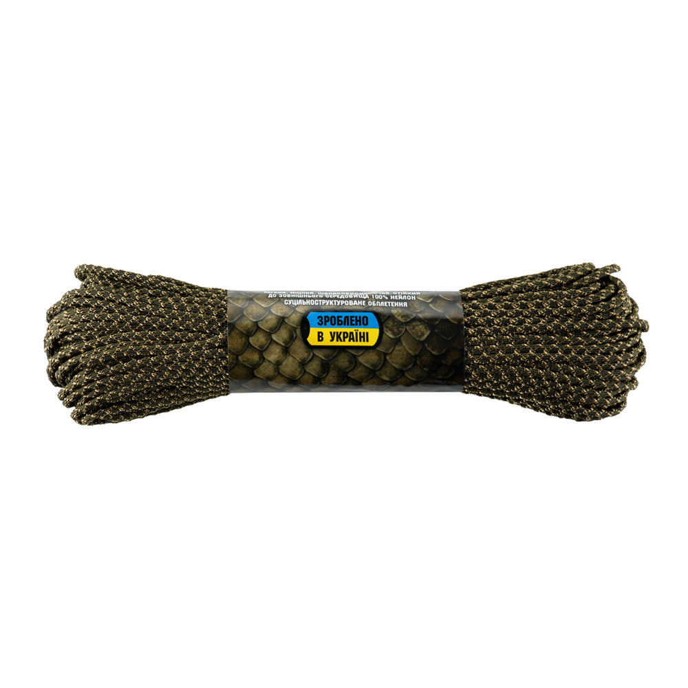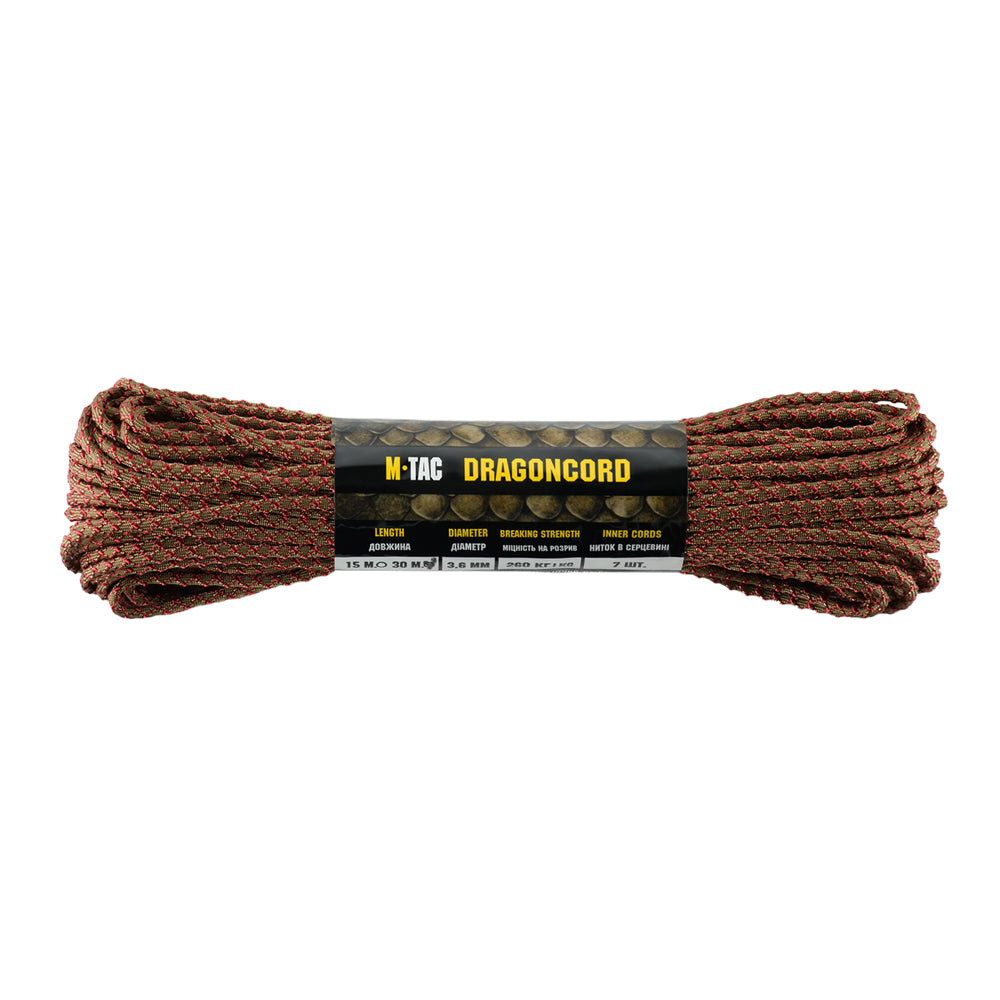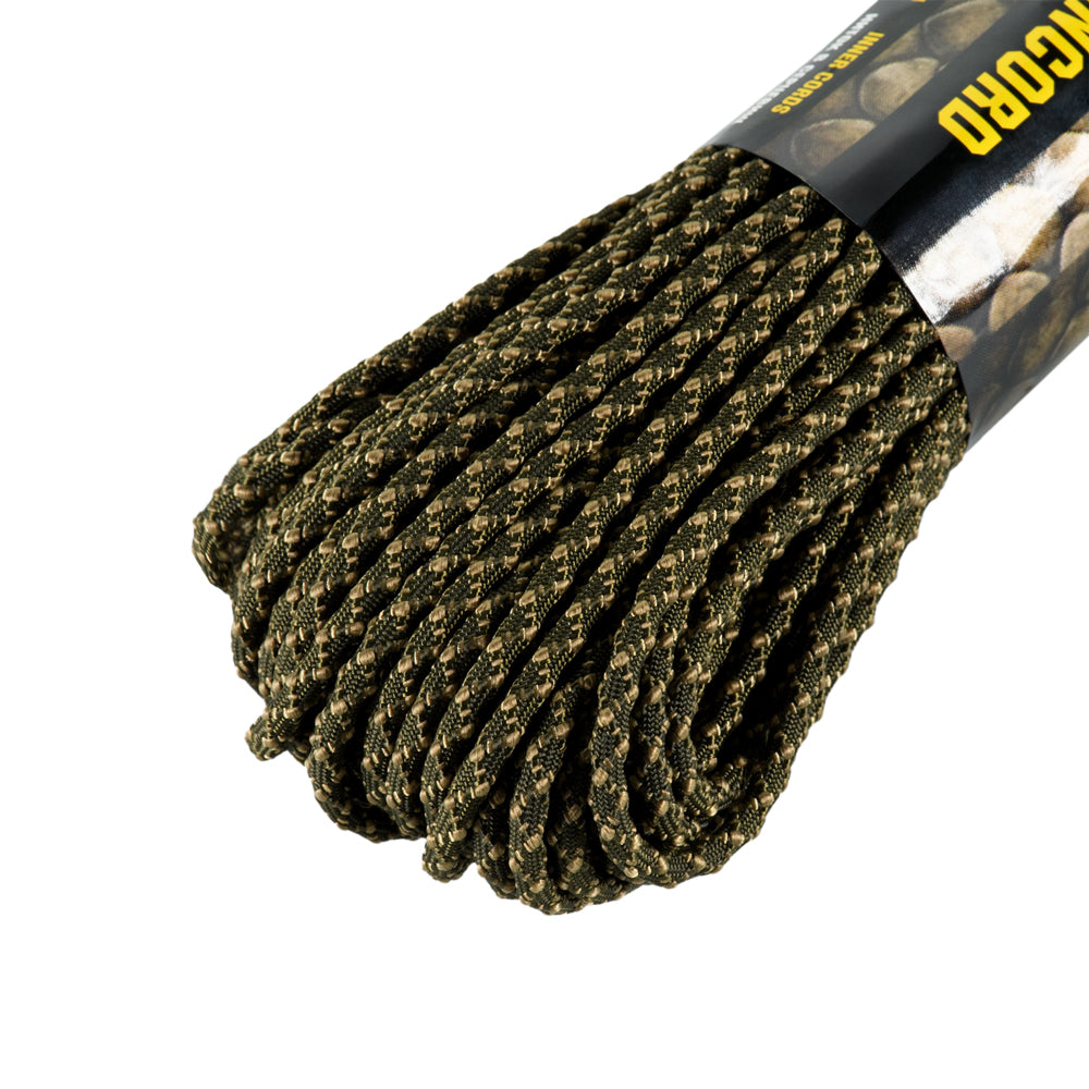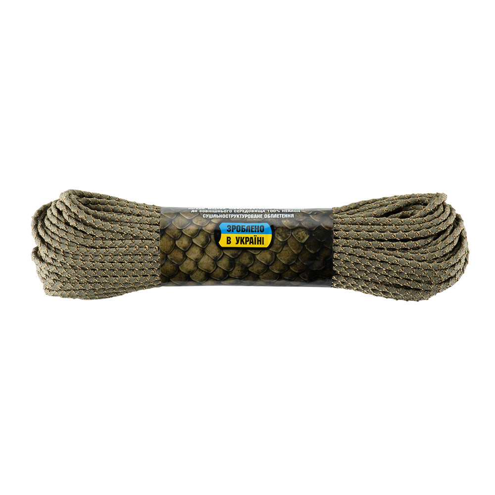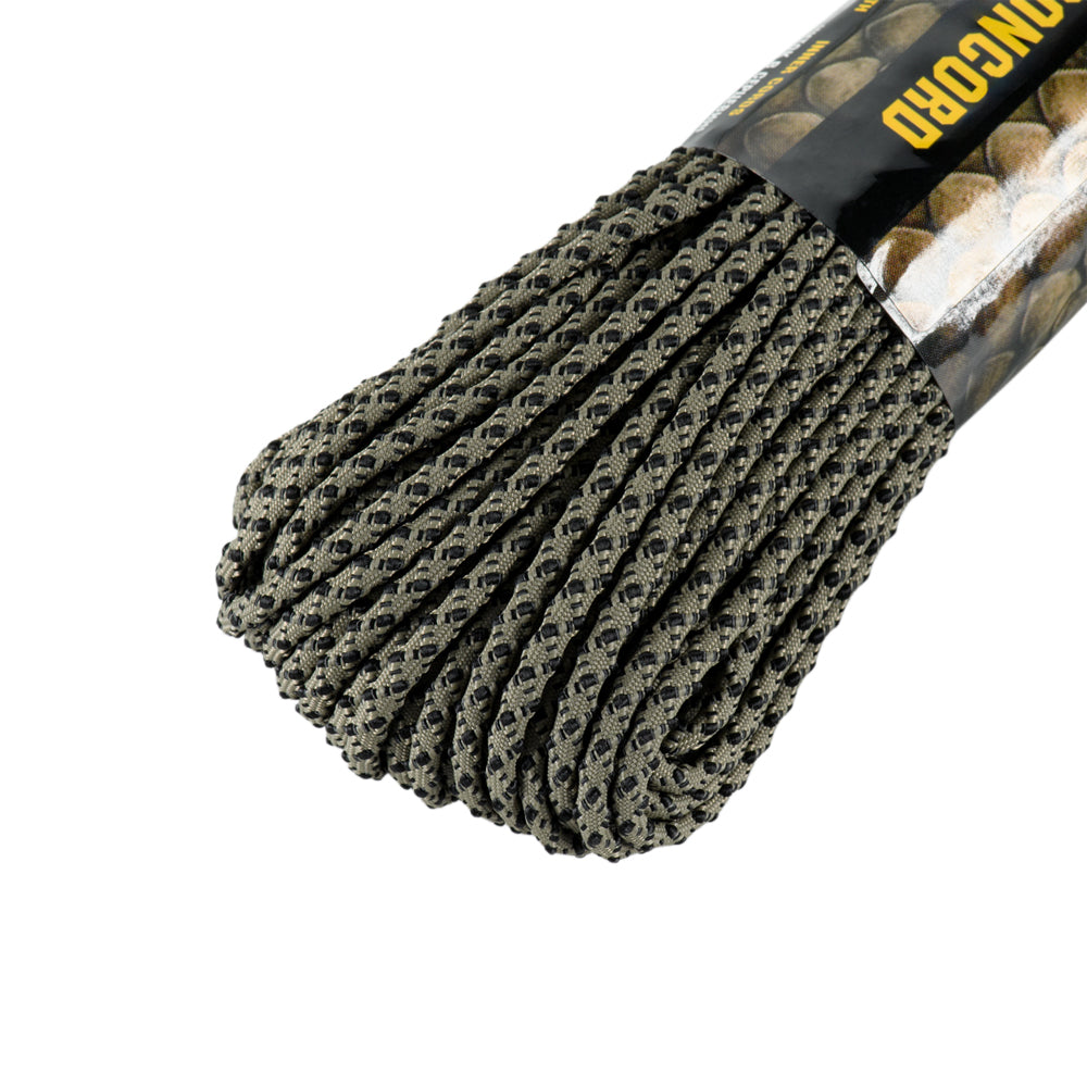 The paracord is made from 100% nylon, a lightweight yet highly durable material. It consists of an outer braided sheath and an inner core, providing high tensile strength while remaining light in weight.