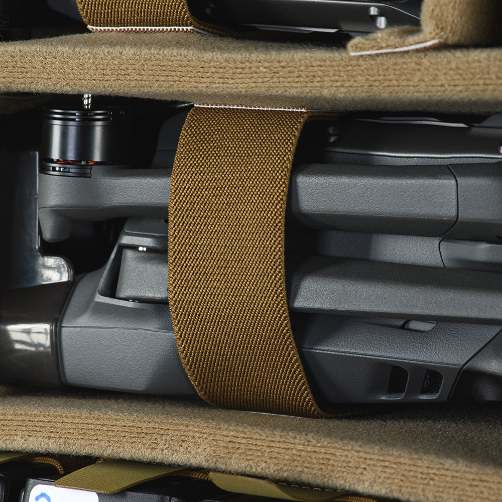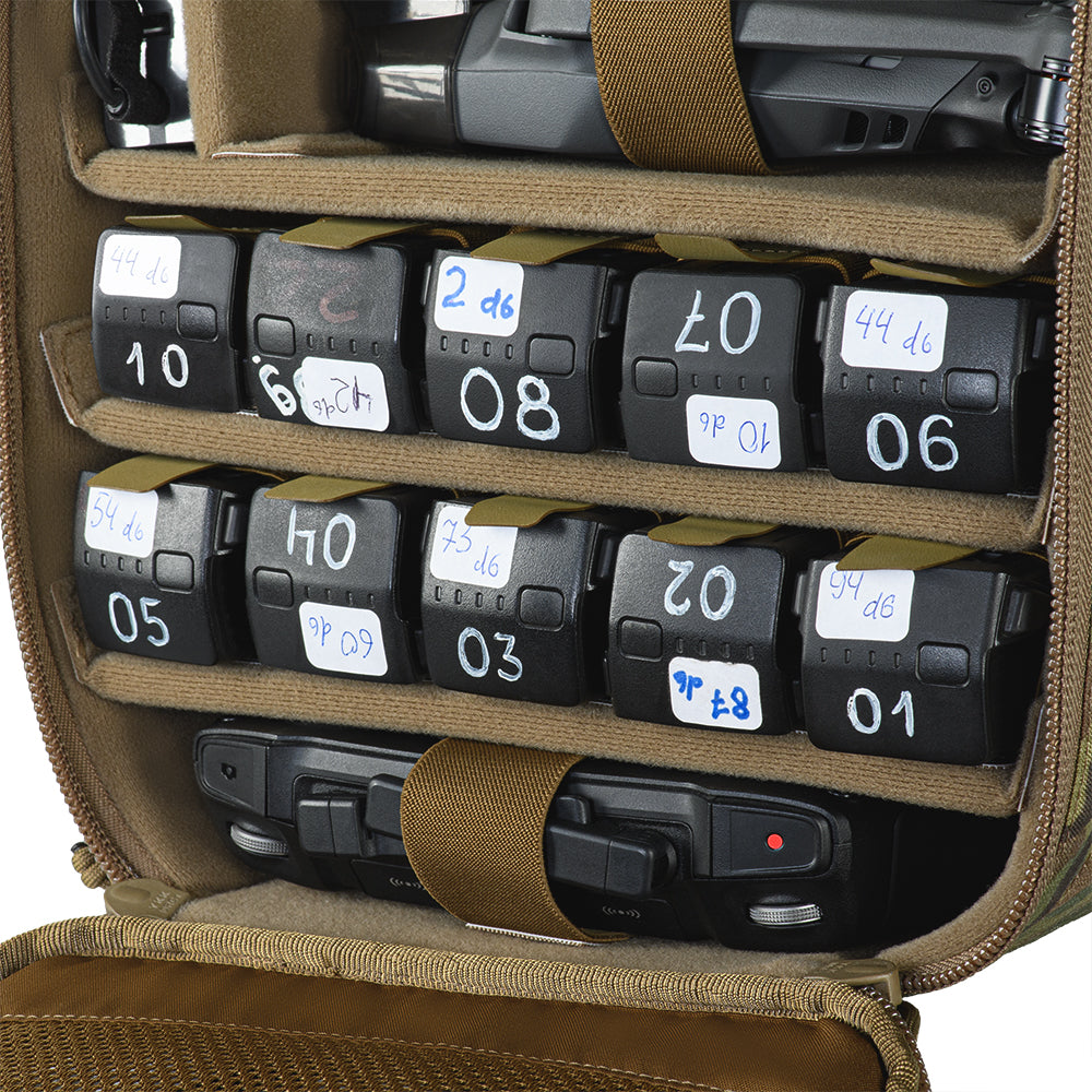 The backpack consists of two main compartments. The first compartment features a specialized organizer system for the convenient transport of drones, their charging blocks, batteries, and controllers. The organizer shelves (parts of the organizer) and the compartment walls are lined with Hook-and-Loop panels, allowing the shelves to be completely adjusted to suit your specific equipment needs. The top and bottom organizer shelves are designed for carrying controllers, the middle shelves for drones and their chargers, and the shelves with integrated compartments are designed for batteries. All parts of the organizer (except the battery shelf) include additional content fixation in the form of elastic bands with sewn-on VELCRO® Brand tabs.