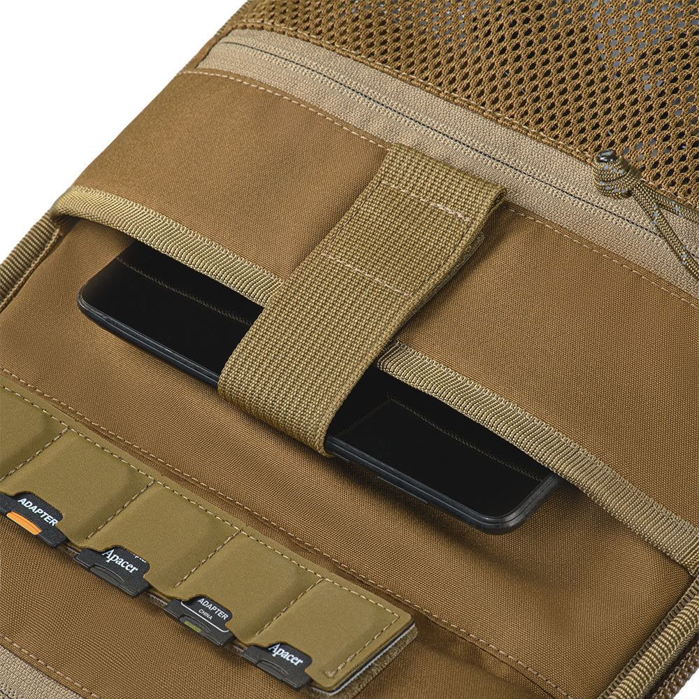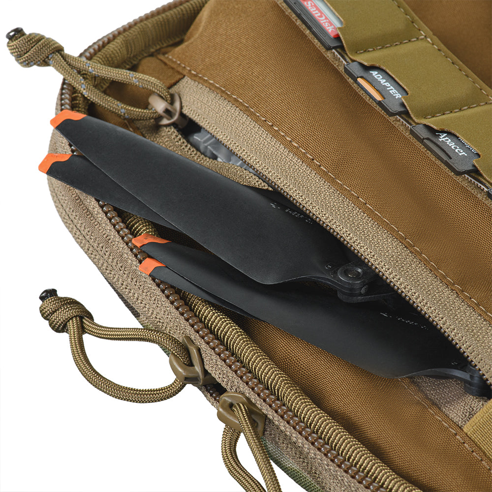 The flap of the first compartment features a pocket for a tablet, secured by a strap with a VELCRO® Brand tab. Above this is a zippered pocket for necessary small items. At the top of the flap, there is a card holder for storing five memory cards and a special pocket designed to hold drone propellers.
