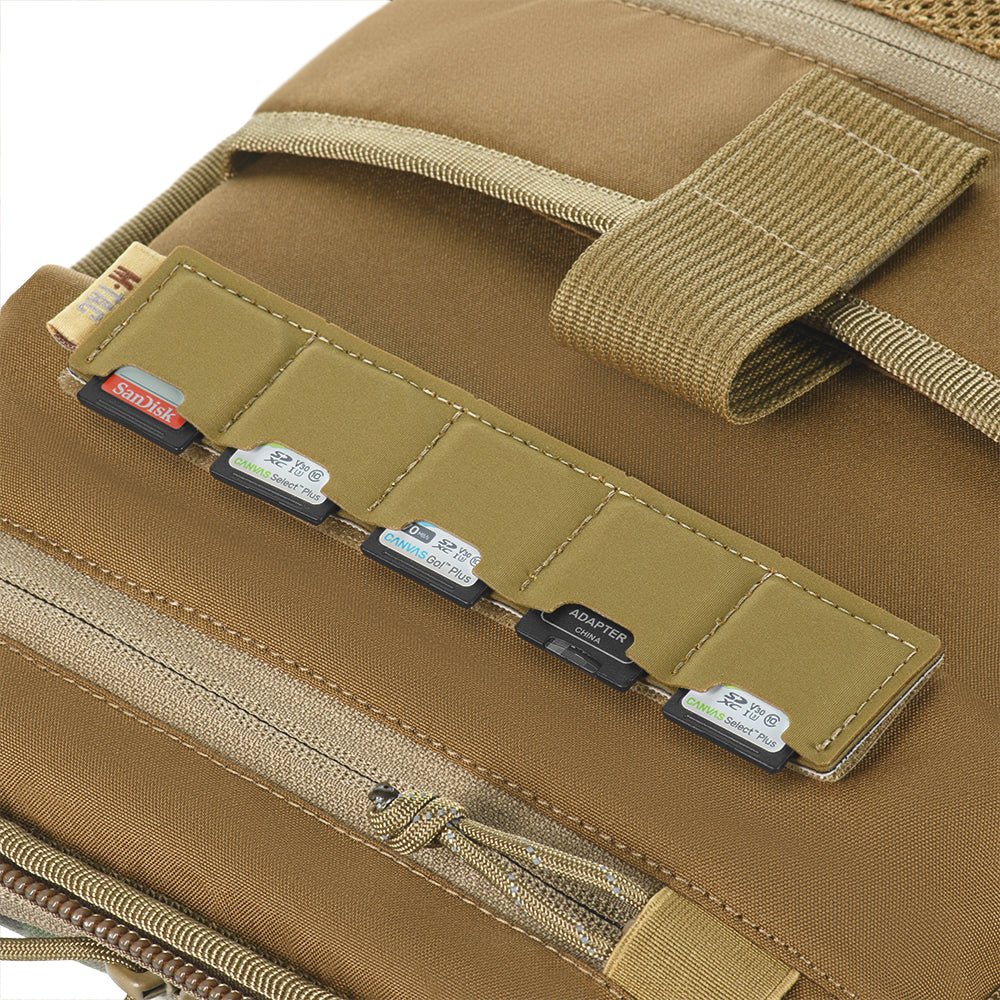 The second compartment also contains a card holder for storing five memory cards and an organizer designed for placing spare batteries, charging cables, and other items.