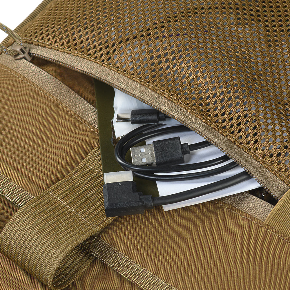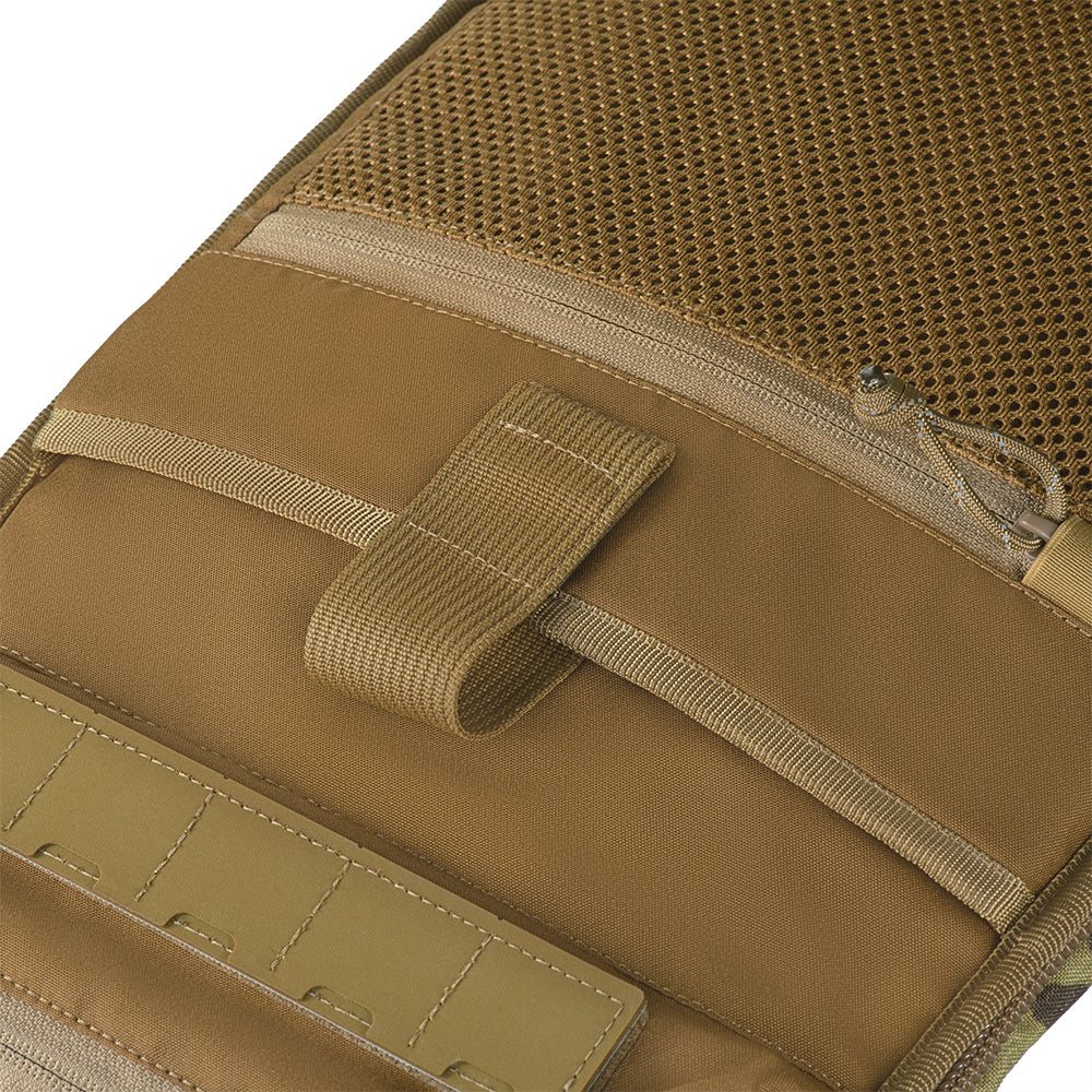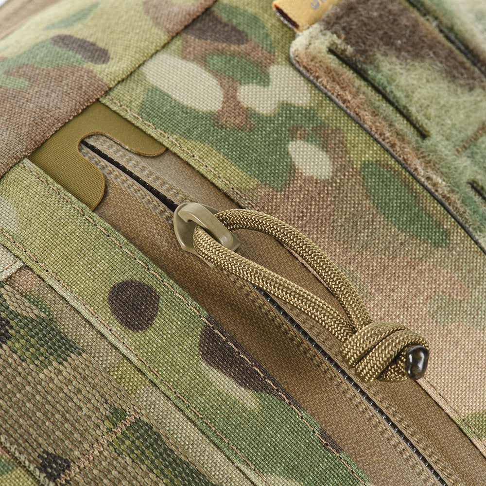 MOLLE systems are located on the front and side sections of the backpack, allowing for the attachment of supplementary gear as needed. The front panel also features a pocket with a water-resistant zipper and a VELCRO® Brand panel with slits for mounting extra equipment, identifiers, or patches.