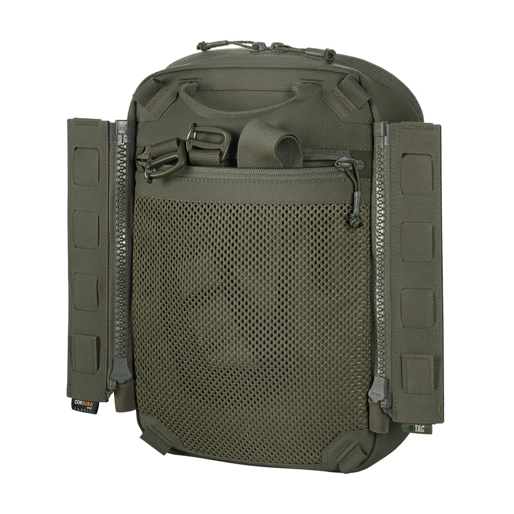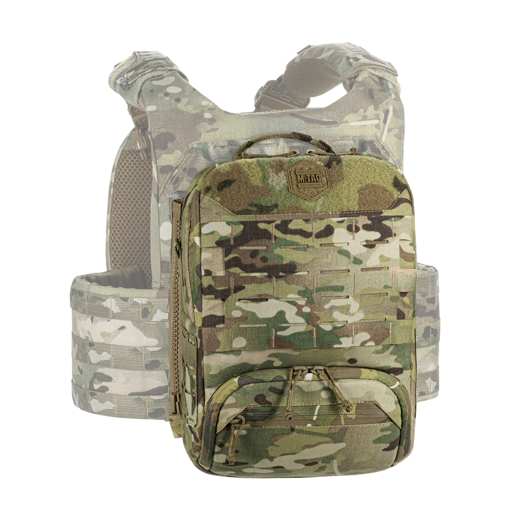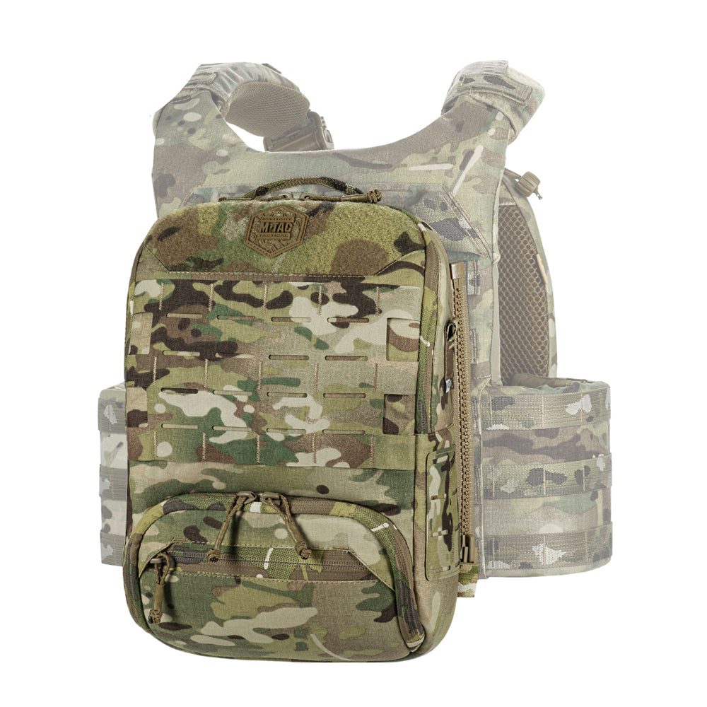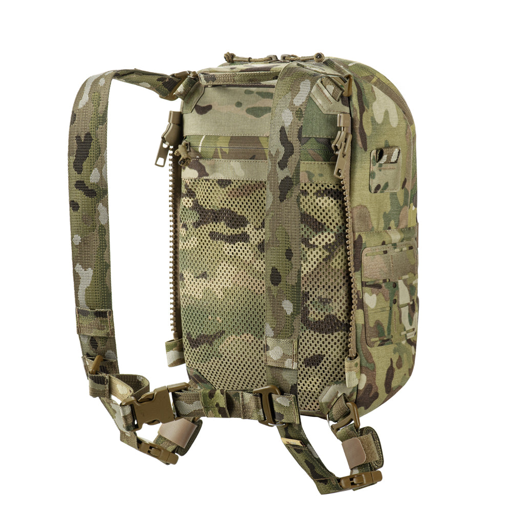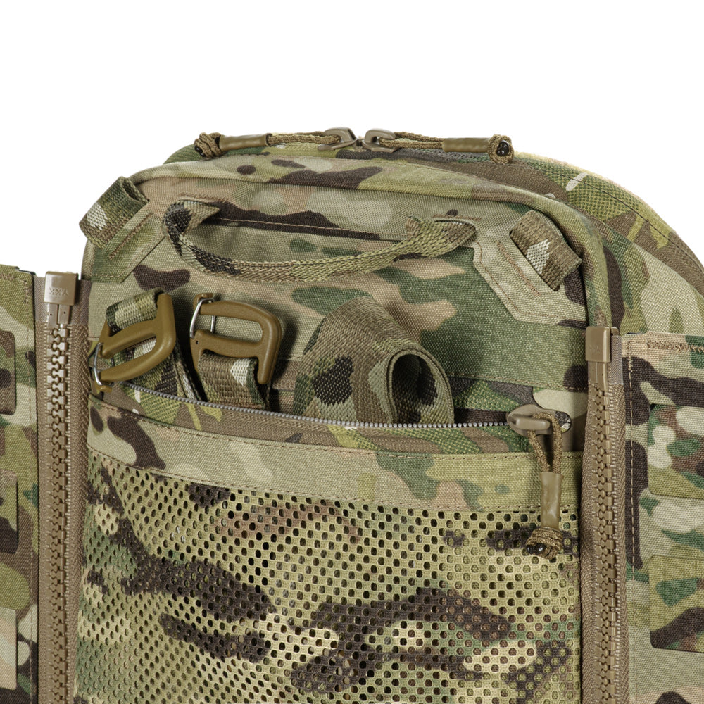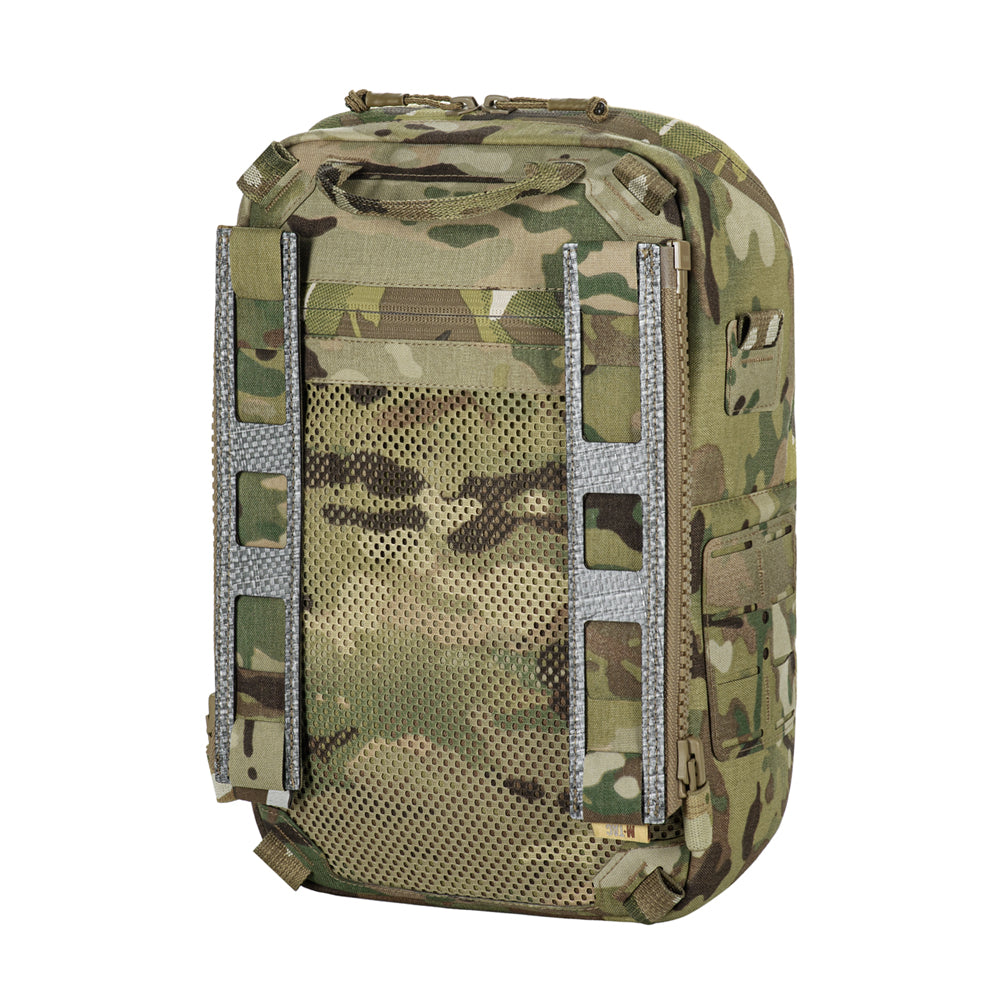 To use the bag-pack as a modular pouch, the back panel includes adapters with straps that weave into the MOLLE panel of a plate carrier. A quick-release mechanism is achieved via zippers.