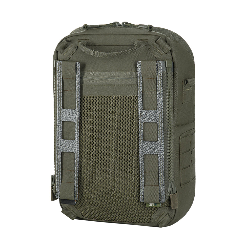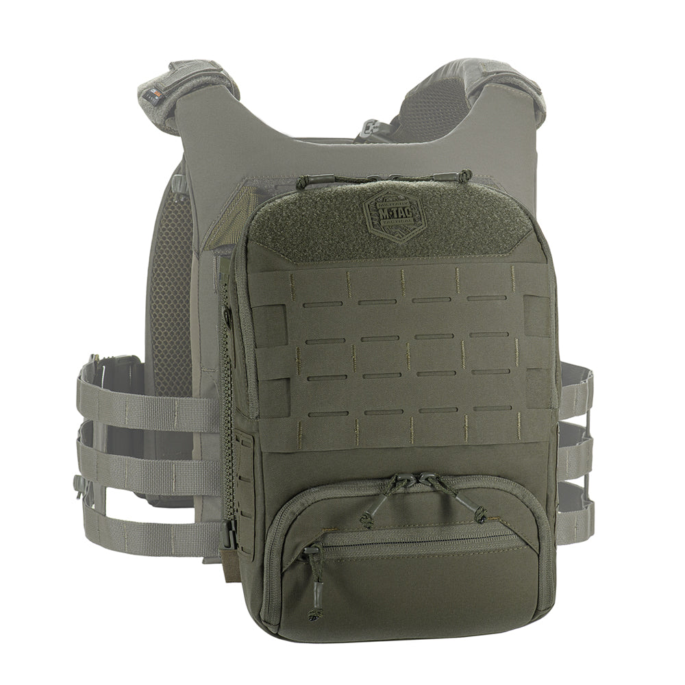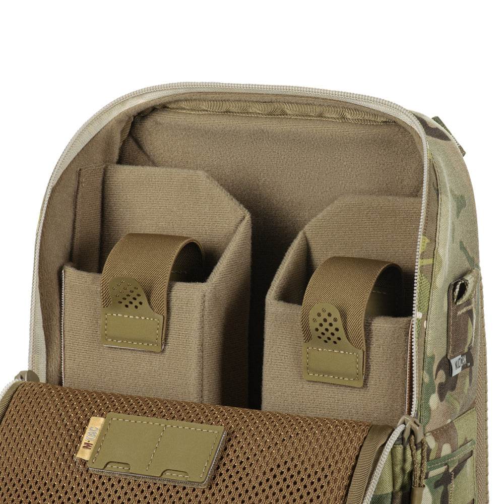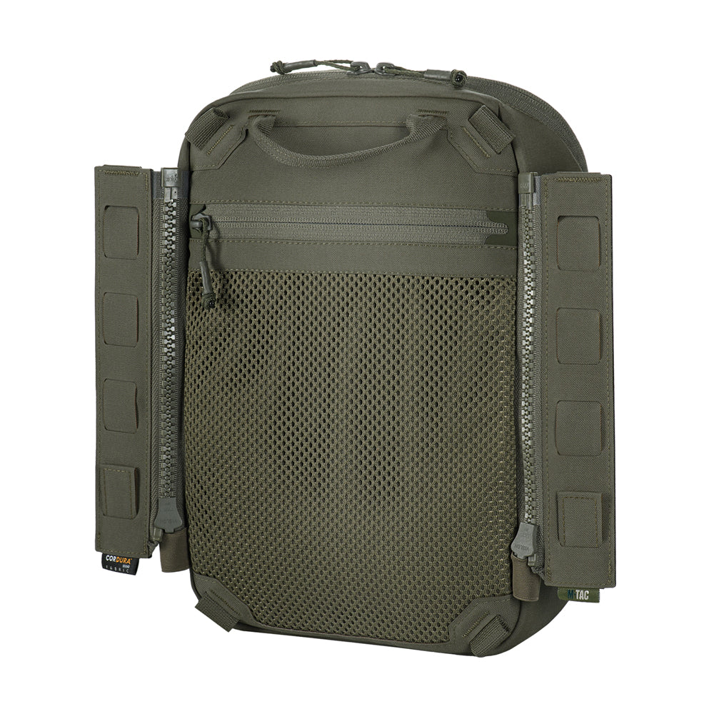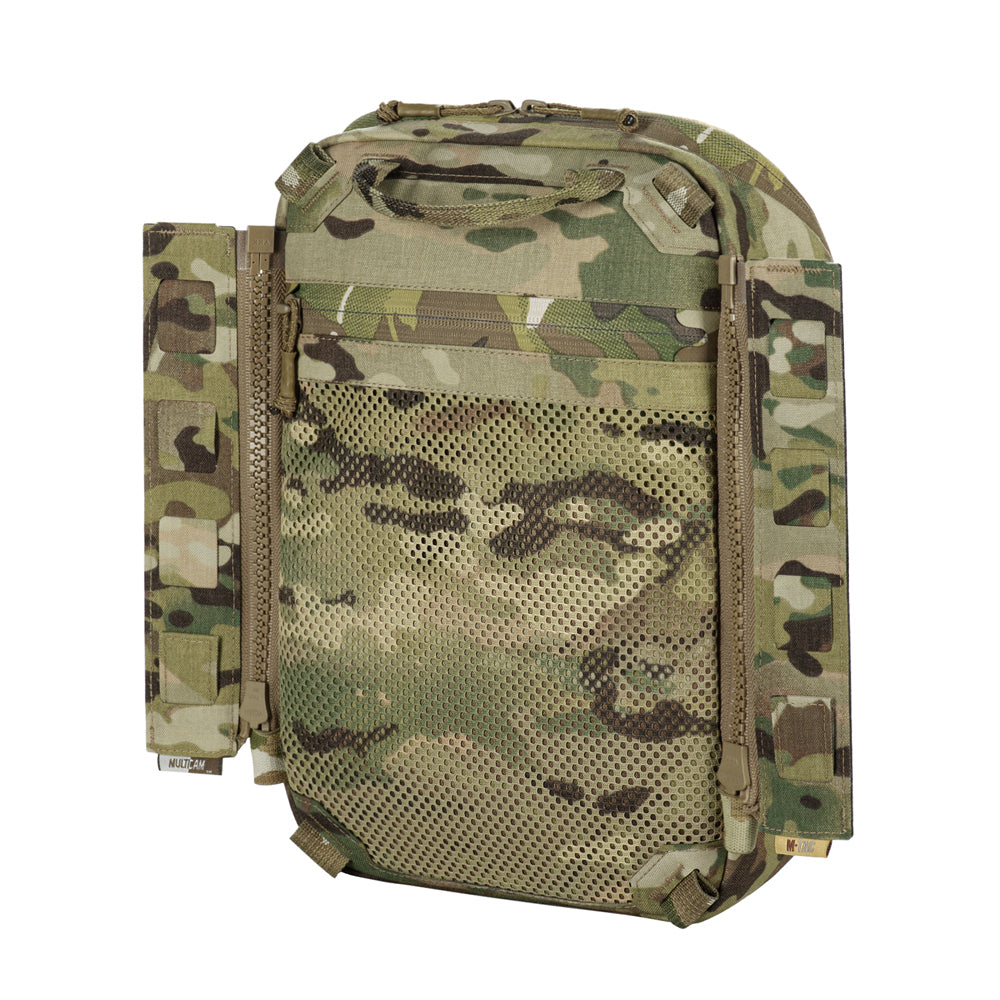 To use the bag-pack as a modular pouch, the back panel includes adapters with straps that weave into the MOLLE panel of a plate carrier. A quick-release mechanism is achieved via zippers.