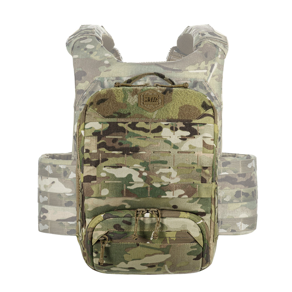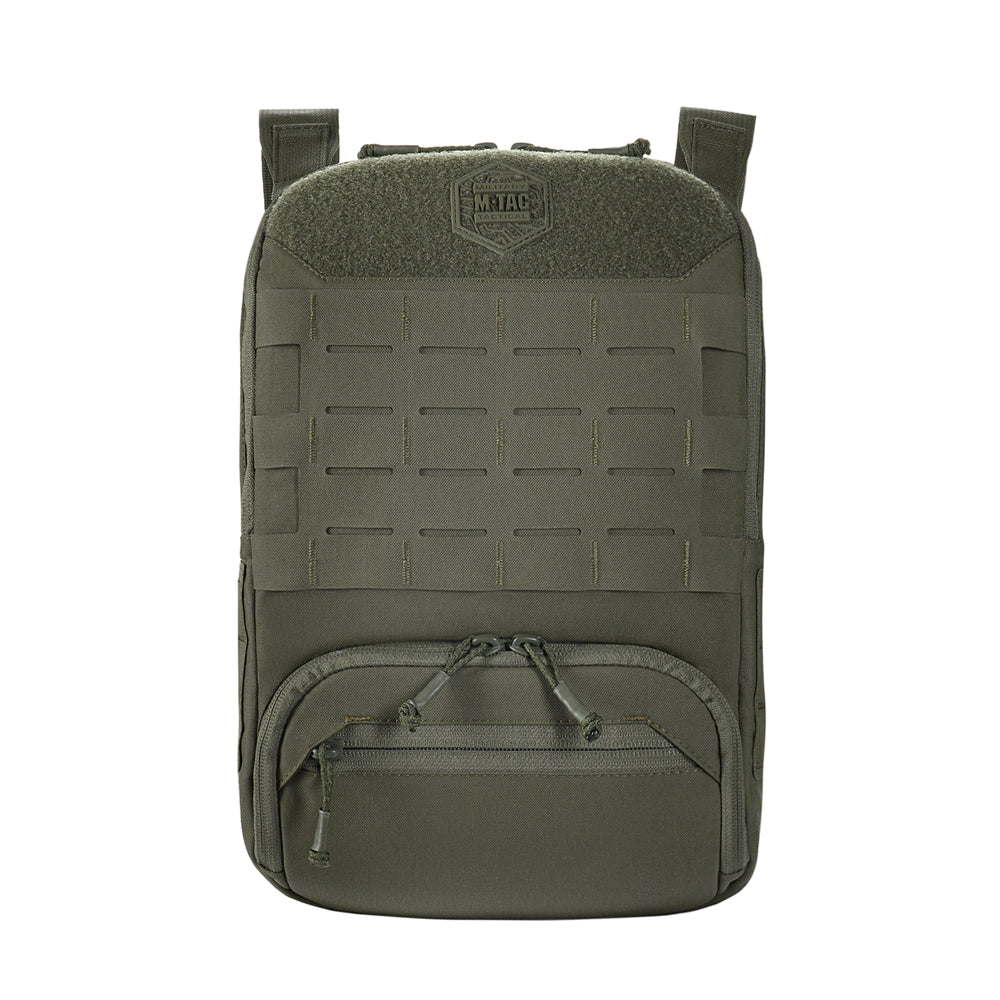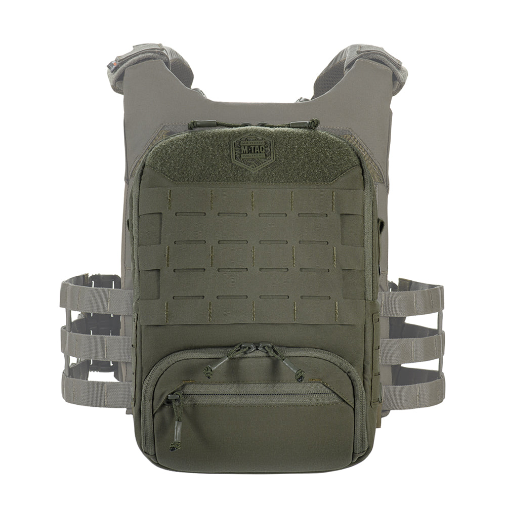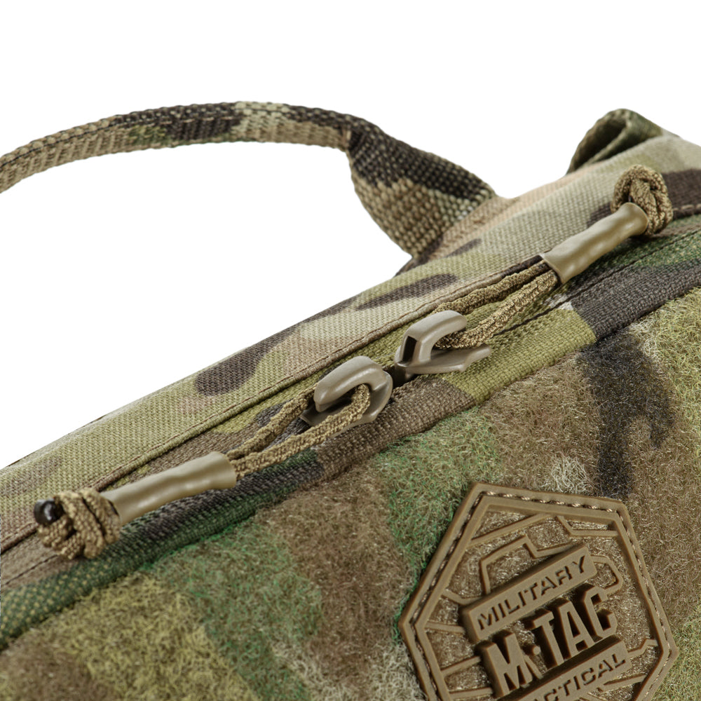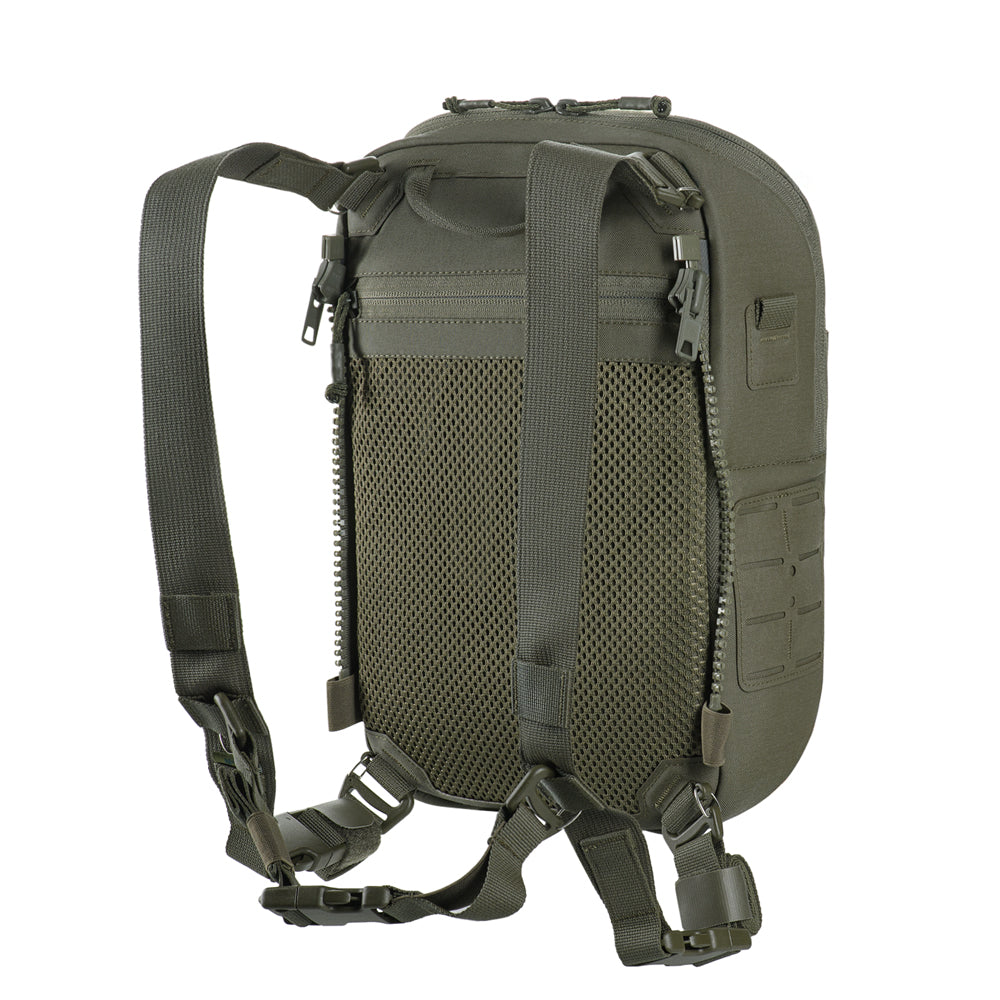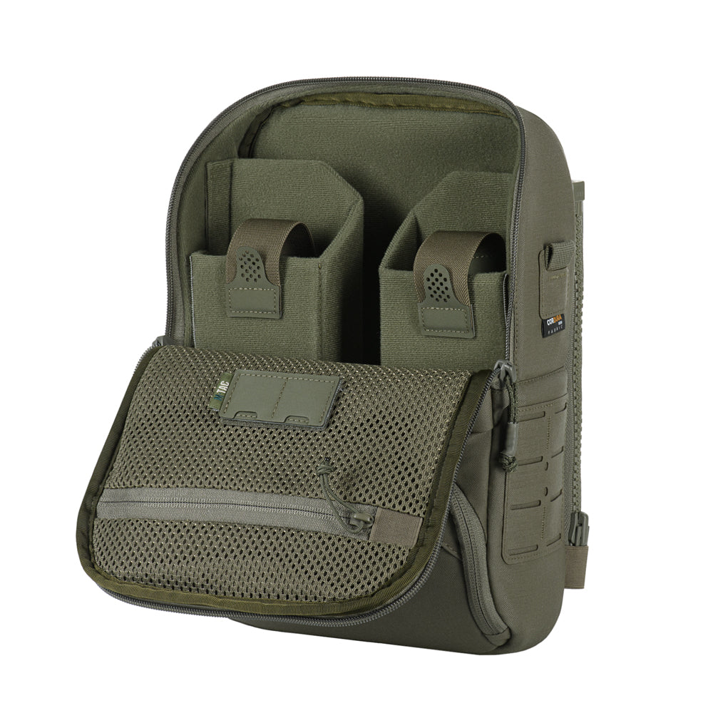 To use the bag-pack as a modular pouch, the back panel includes adapters with straps that weave into the MOLLE panel of a plate carrier. A quick-release mechanism is achieved via zippers.