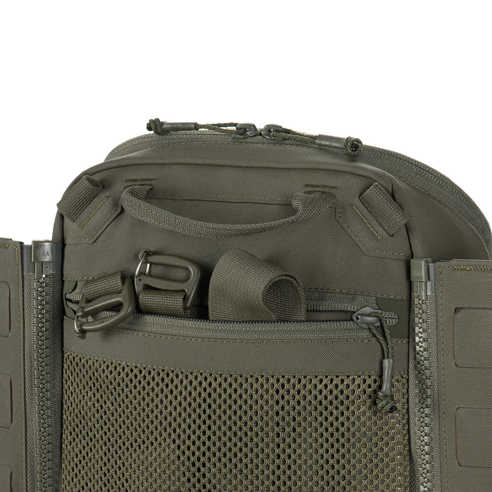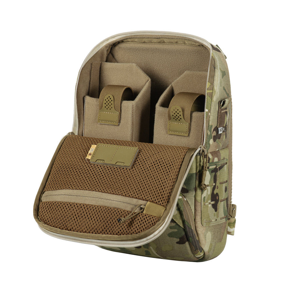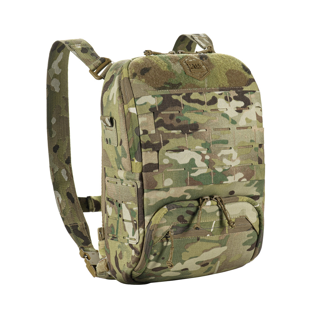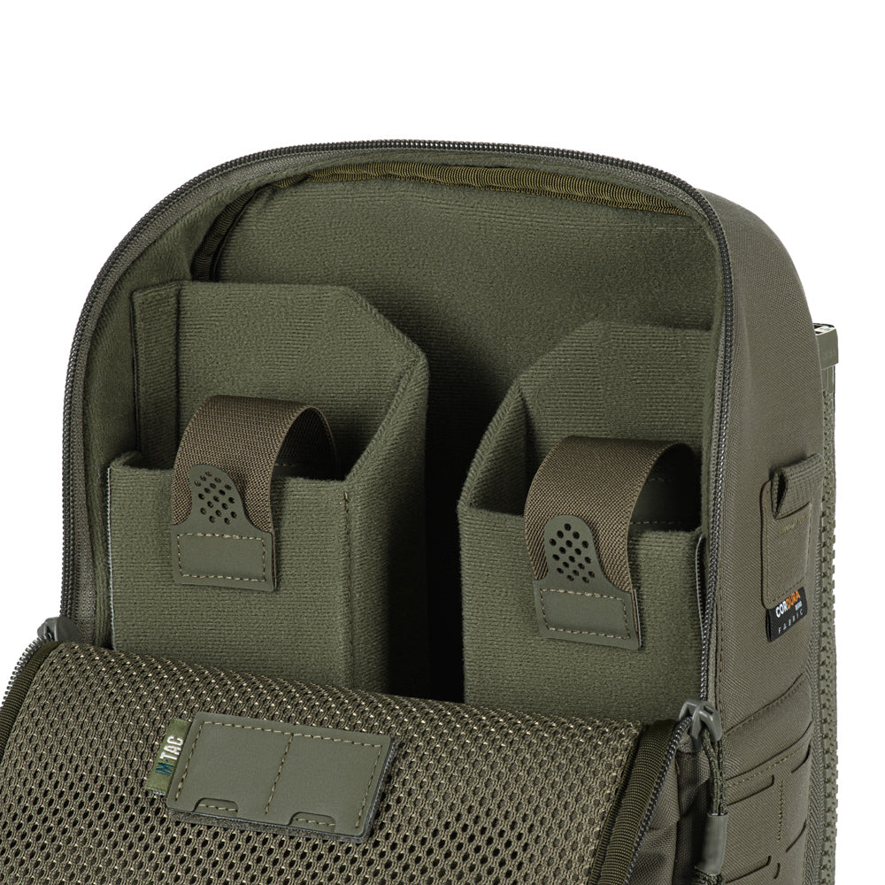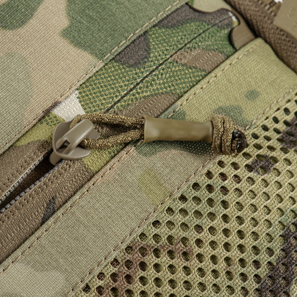 At the bottom of the bag-pack is a dedicated compartment for goggles with an elastic retention strap, as well as an additional external zippered pocket. The front and side panels are equipped with MOLLE Laser Cut panels for attaching additional gear. A large mesh pocket is located on the back panel.