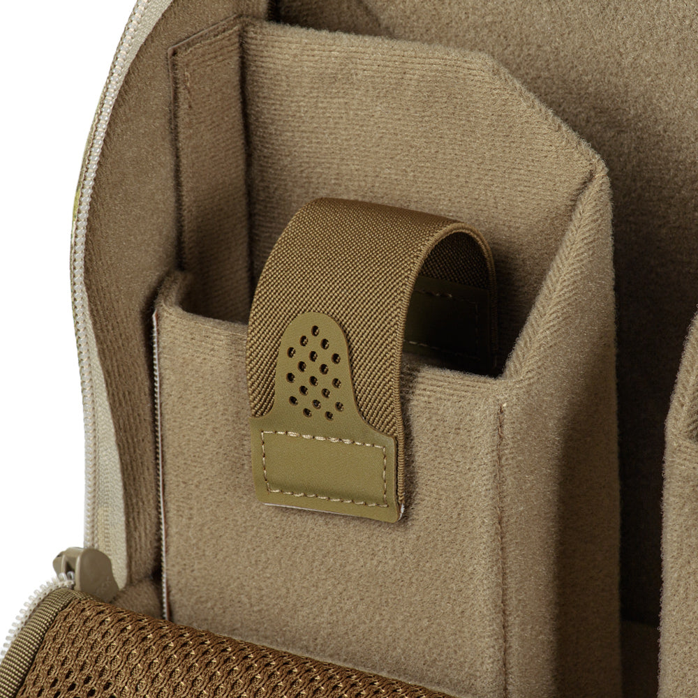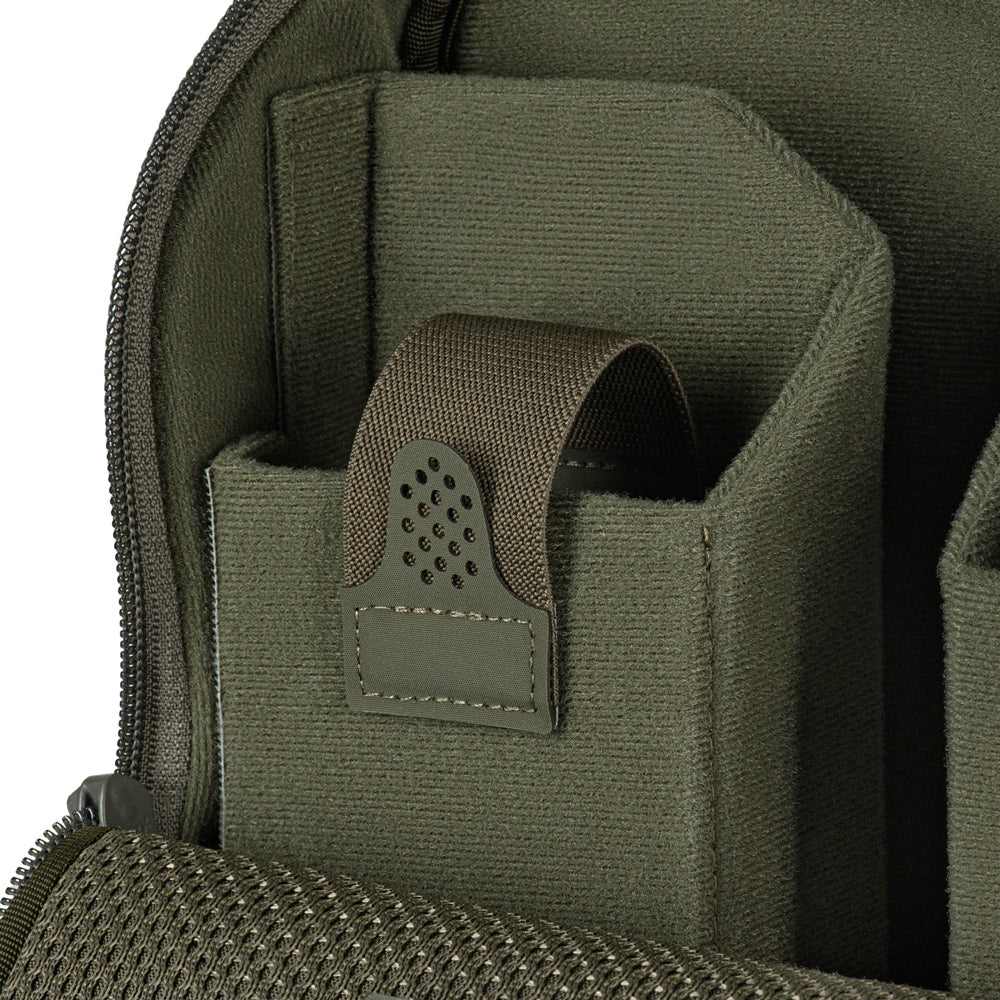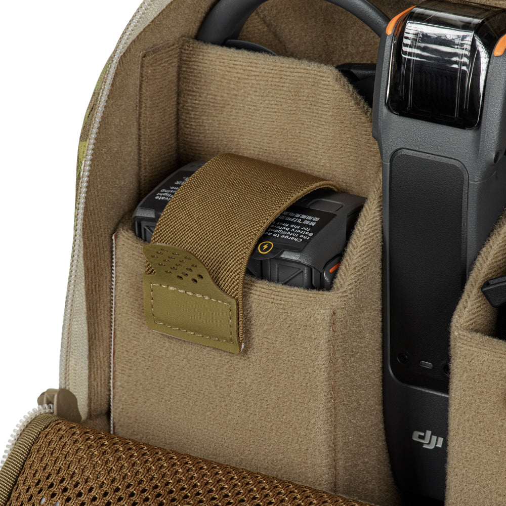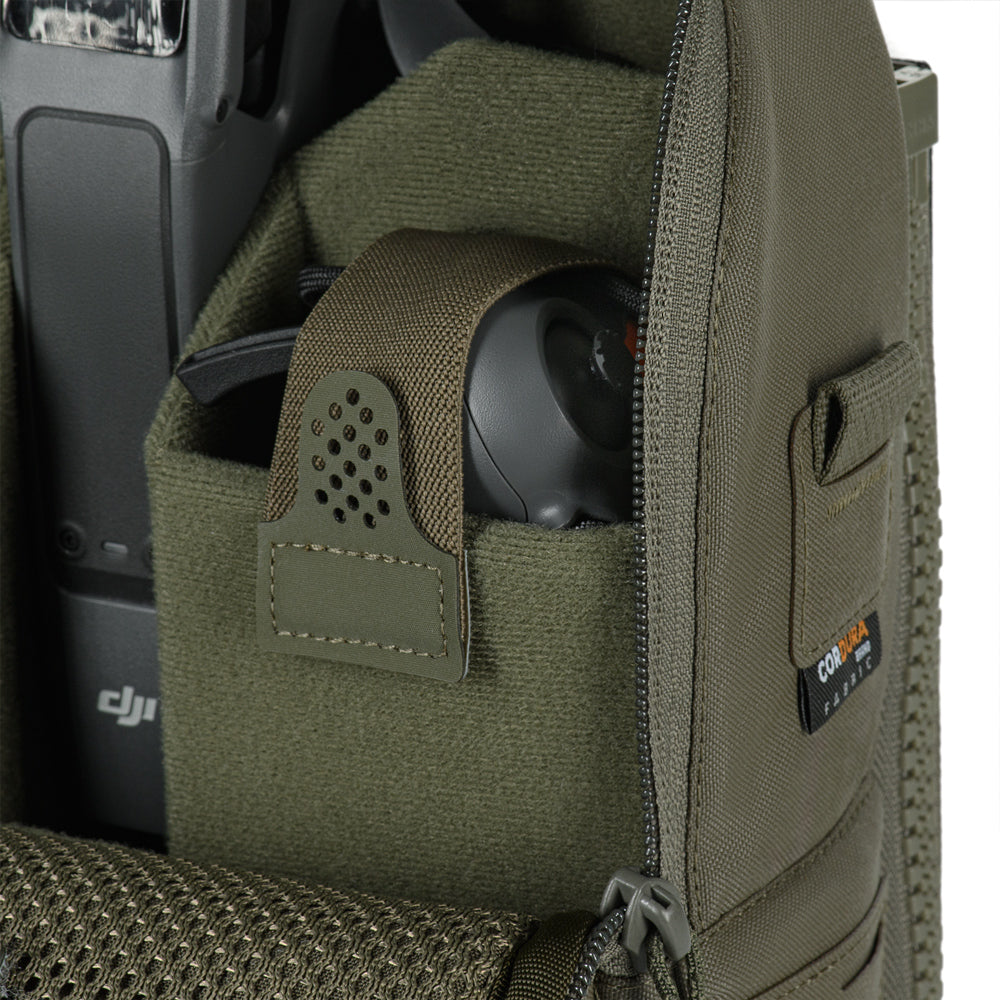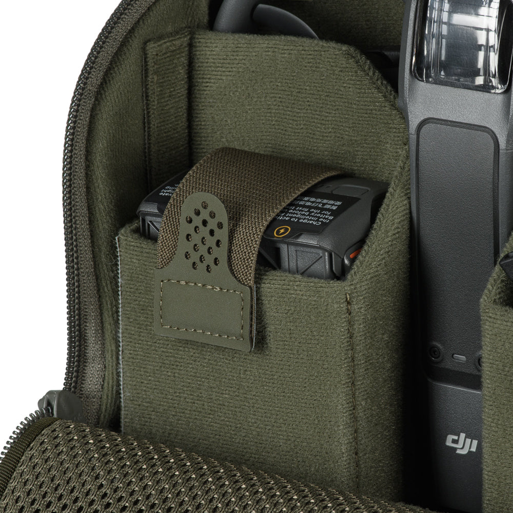 The main compartment is made of VELCRO® Brand fabric and includes a dedicated space for the drone, plus two compartments for the controller and batteries. Each compartment features elastic retention straps with loop-backed pull tabs for easy access.