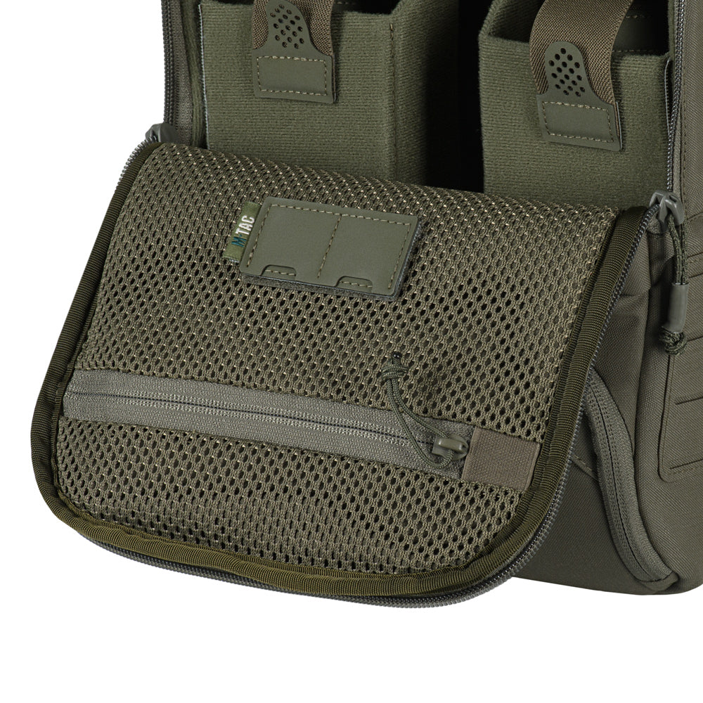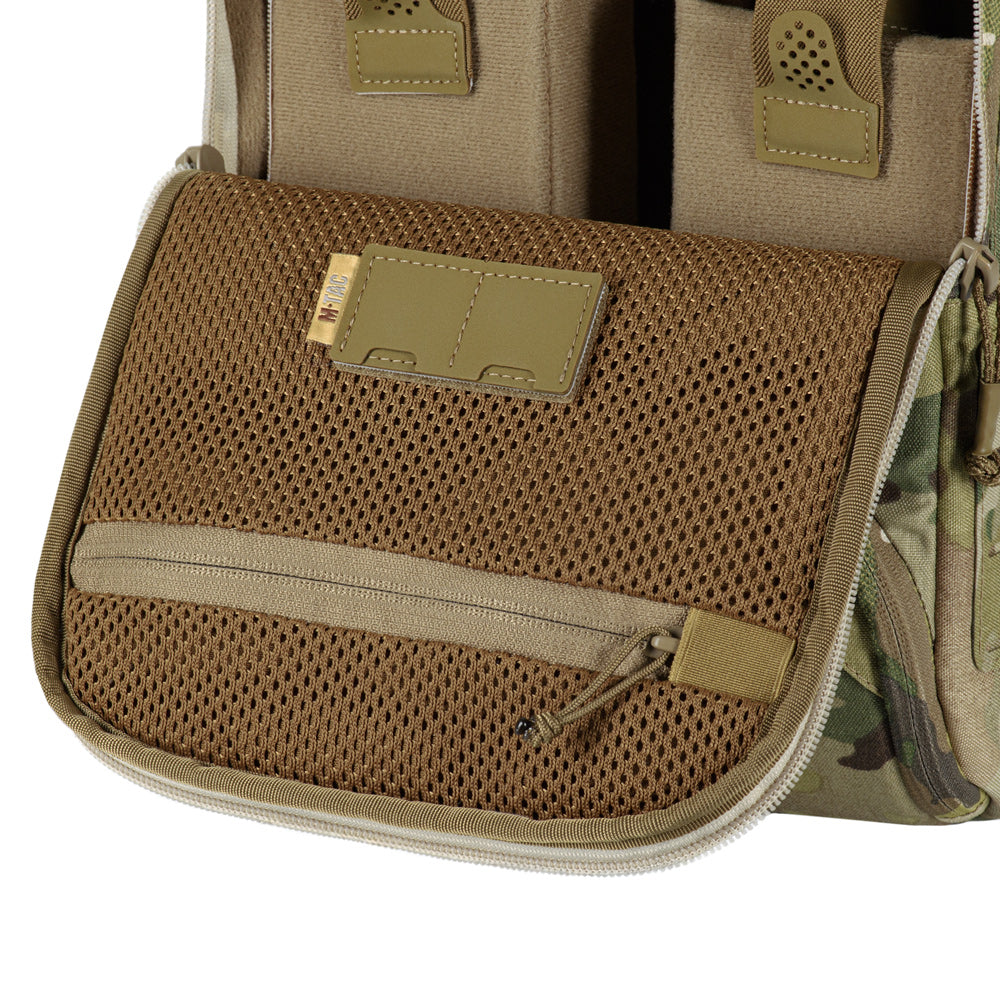 The lid of the main compartment contains a zippered mesh pocket for cables, chargers, documents, and other essentials. Above the pocket is a removable loop-backed card holder designed to store two memory cards.