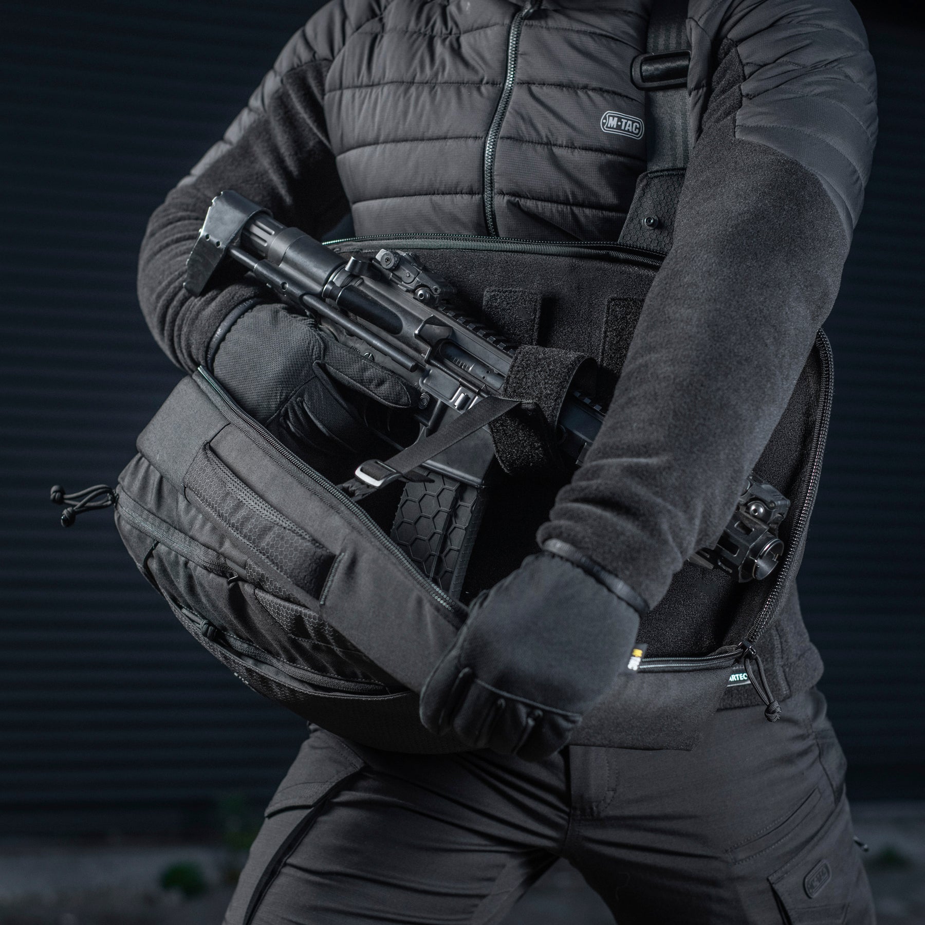 The M-Tac single-strap backpack Agent Elite Hex Black is an excellent choice for carrying short-barreled carbines and accessories for them. Made of Cordura Hex 1000D and Cordura 500D, high-quality and durable materials protect from mechanical damage and provide long life service. It is equipped with a system of quick access to weapons and a convenient shoulder strap. This rifle case has 2 way zippers on the main compartment, so you can open the bag up and lay it out flat. Also the compartment is equipped with a loop panel over the entire area and a removable insert-holder for rifle. It is very suitable for field sports, training, hiking, and extreme challenge sports.