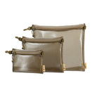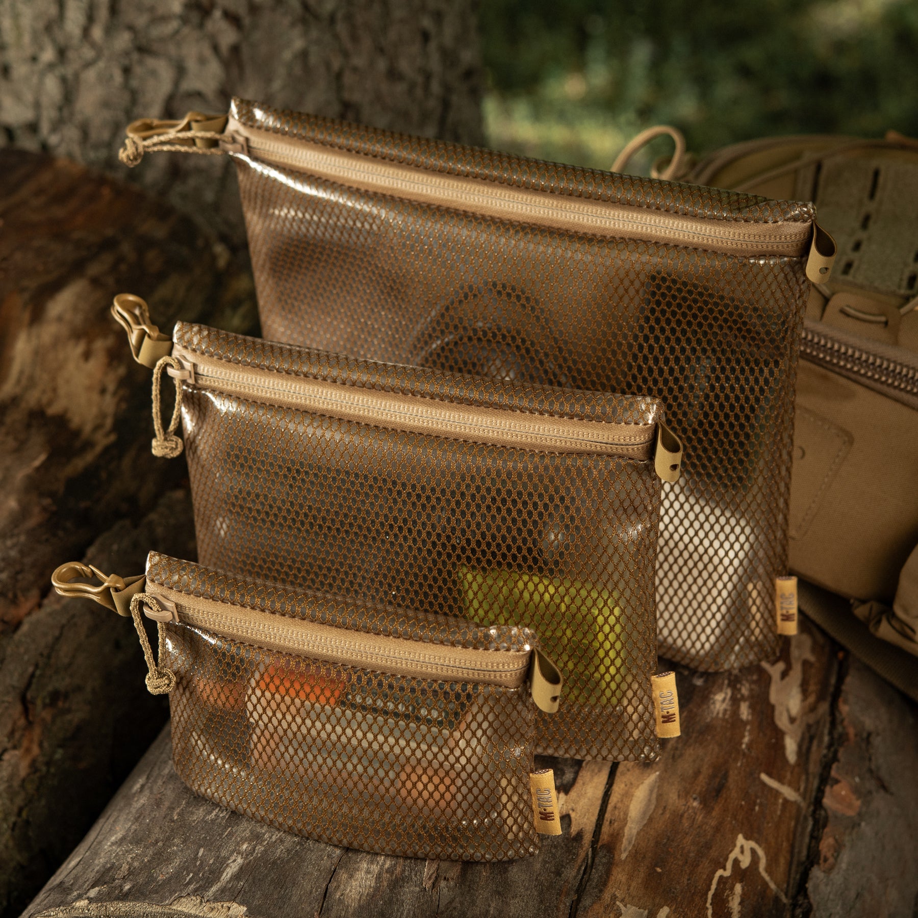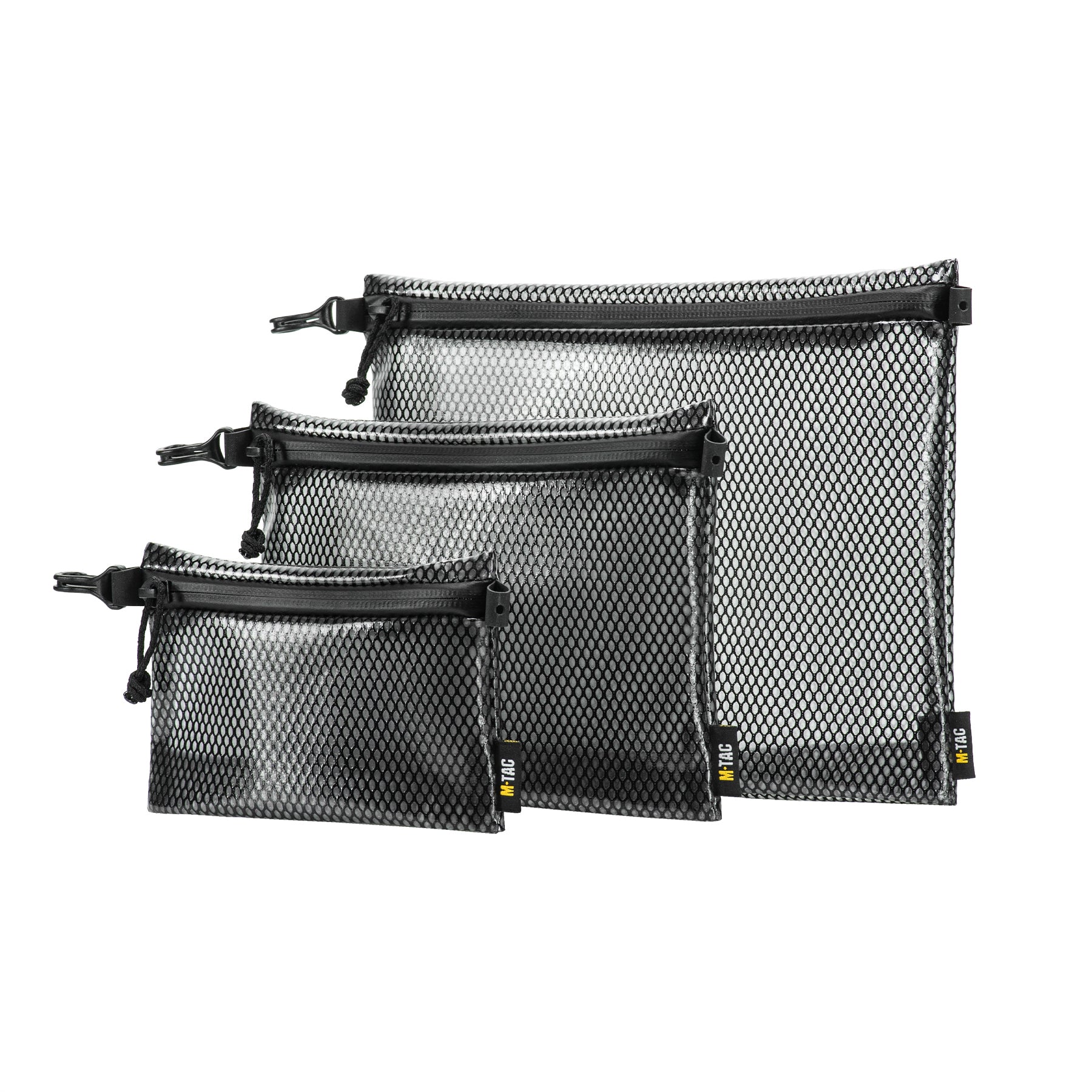 The set includes 3 organizers of different sizes: S (10 x 15 cm), M (15 x 20 cm), and L (20 x 25 cm). They are made of laminated mesh (PVC), which is durable, waterproof, and resistant to deformation.