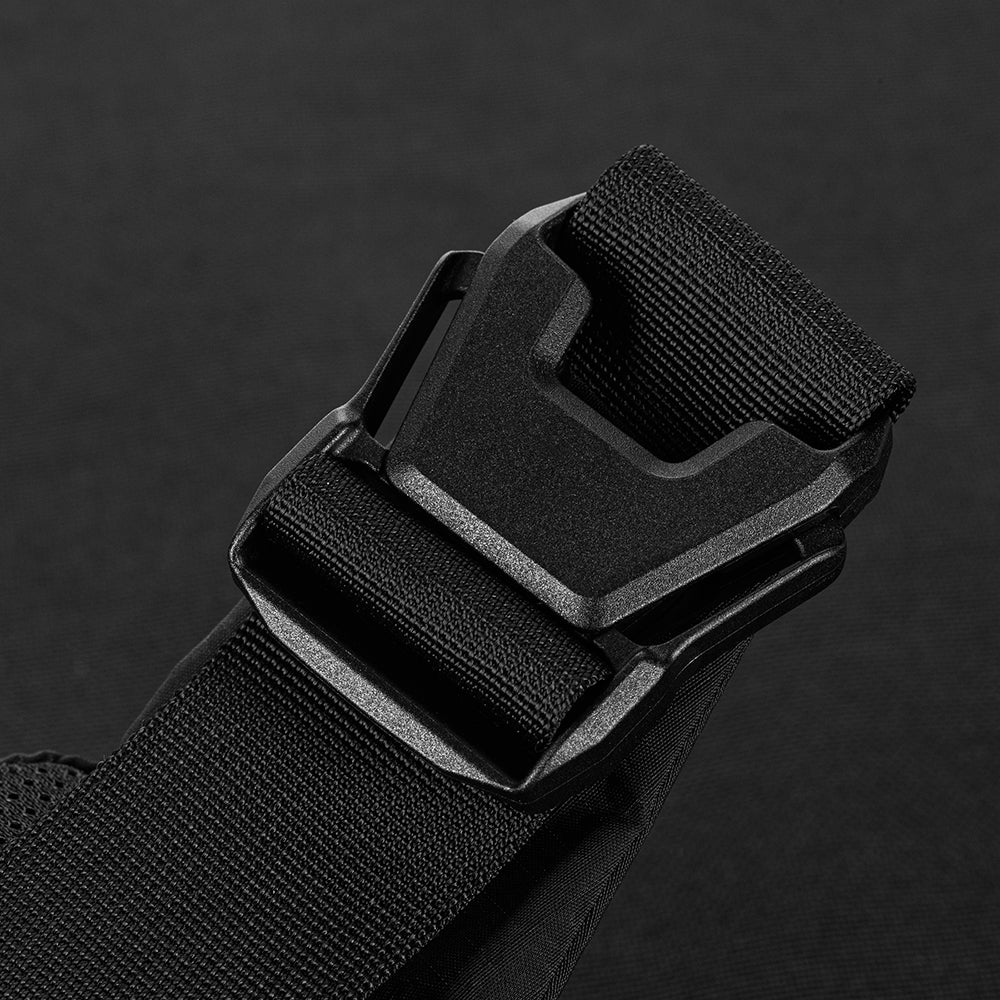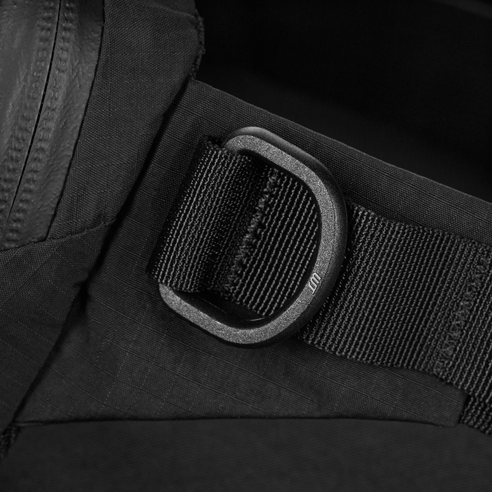 Nylon webbing is sewn on the lower front section and the right side of the bag for attaching additional gear. A D-ring on the right side allows attaching a carabiner or other equipment. The adjustable strap with a Woojin buckle allows the bag to be worn as a crossbody or on the waist.