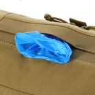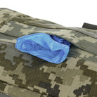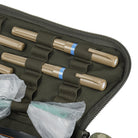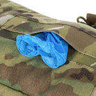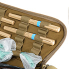 On the front panel, there is a dedicated shears holder, secured with webbing and a buckle. Each side of the bag includes four integrated tourniquet pouches, while elastic webbing inside ensures both reliable fixation and quick access to contents. The top flap integrates a pouch for medical gloves (optimized for up to 5 pairs). Front and rear compartments are designed to hold immobilization splints.