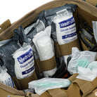 The medical bag features a single main compartment equipped with an organizer specifically adapted to the MARCH algorithm (used in the TCCC – Tactical Combat Casualty Care concept, applied at the second stage of care: Tactical Field Care, or in the yellow/green zone). The back and side sections of the organizer are designed to store first-level medical supplies related to “M” (Massive bleeding), while the flap and front sections are intended for second and third levels — “A” (Airway Management) and “R” (Respiration). A large inner mesh pocket provides additional space for essential medical equipment.