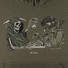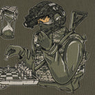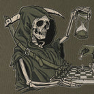 The print depicts a fatal duel between a warrior and death, metaphorically shown as a chess game — each move representing completed missions, while the skeletal figure’s hourglass reminds that every decision counts. In this battle, skill, mastery, and luck determine the outcome.