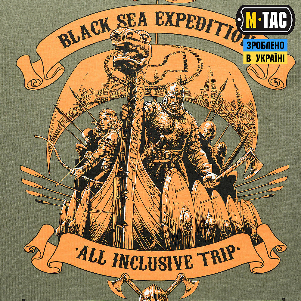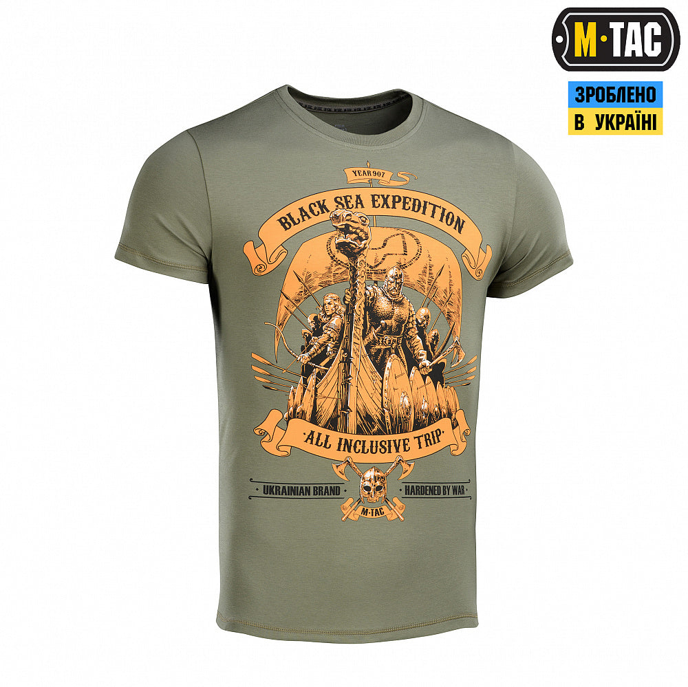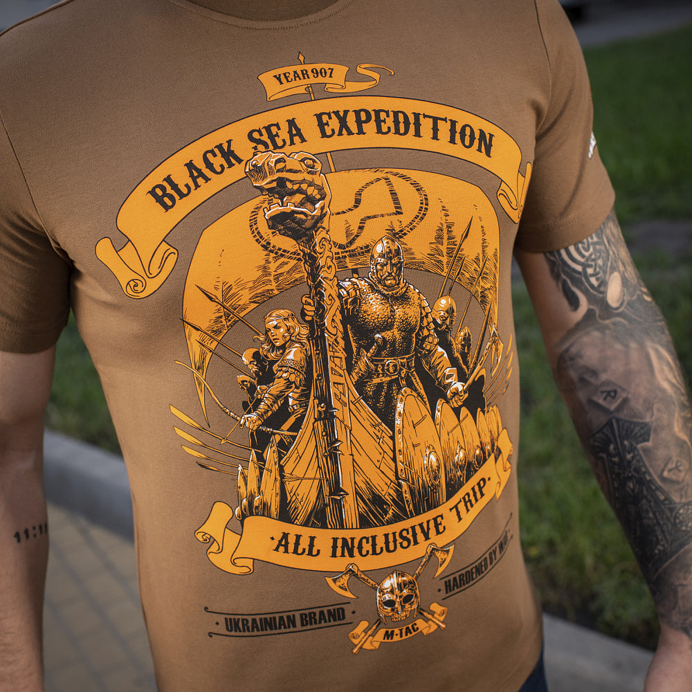 The M-Tac short-sleeve T-shirt, sewn from 93% Cotton and 7% Elastane with a "Black Sea Expedition" print. Ensures maximum comfort and freedom of movement.Bright and stylish print on the theme of Slavic sea trips.Raise your morale and feel the admiration and courage of the sea journey!The print is made by MagnaColours® (Premium inks resist fading) technology.Thanks to this, the T-shirt can withstand a lot of washes and does not lose its shape.An excellent choice for people who lead an active lifestyle and like hunting, fishing, sports, tourism. Thin, elastic, and high-quality knitwear successfully emphasizes the relief of the muscles and gives a complete feeling of comfort.