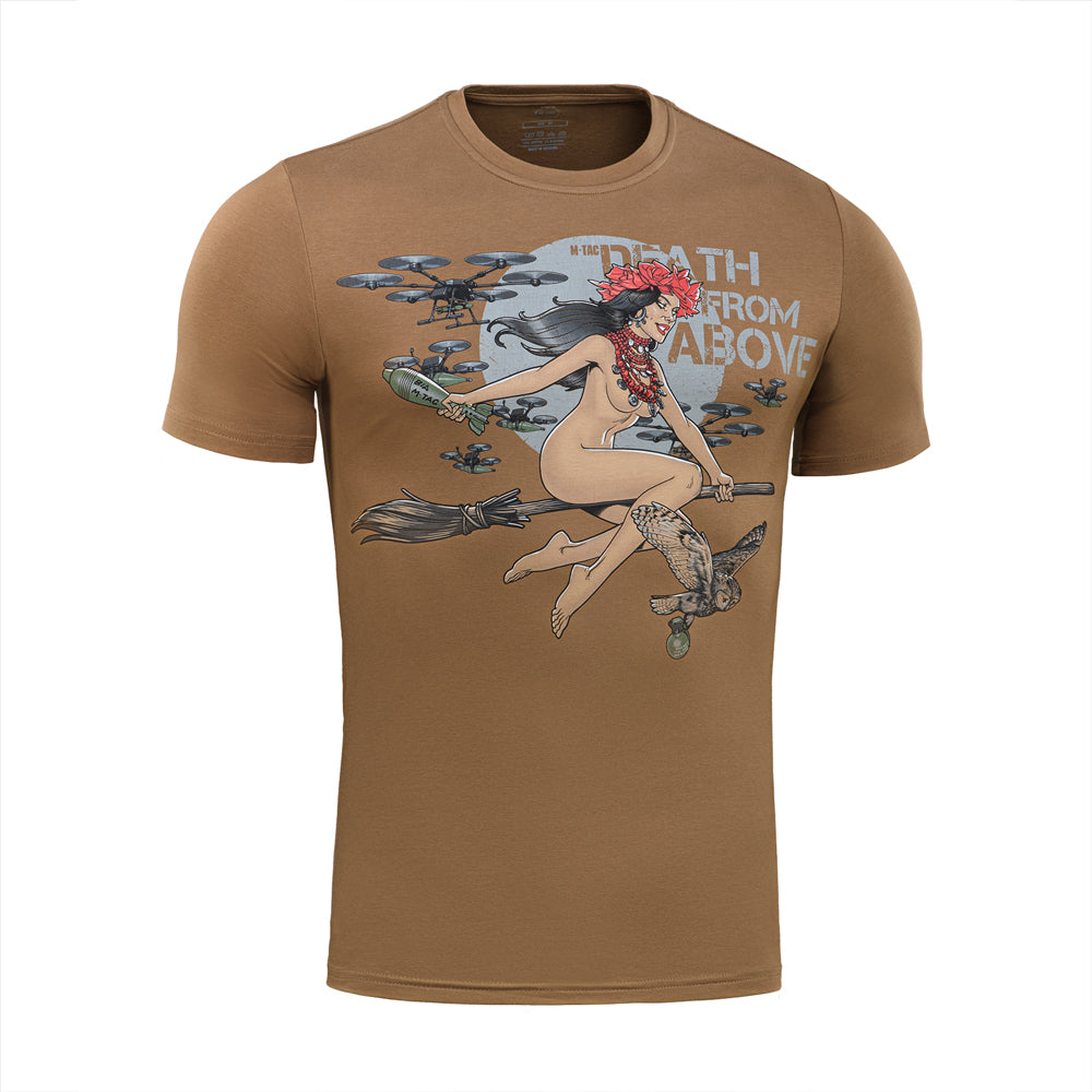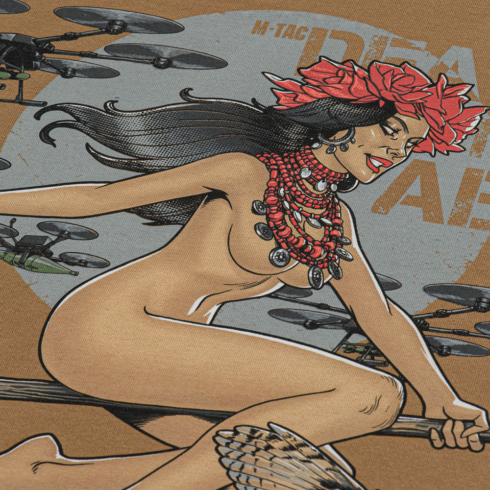Having invaded, bringing war to our land, the enemy condemned himself to be cursed to the seventh generation. Now, an easy death will seem like a blessing to him, and he will have to beg higher powers for hell. All of Ukraine stands for one goal: from courageous warriors with their modern weapons to the forces of nature and folklore. So the enemy should look up until death blinds his eyes. The M-Tac designers have created a new thematic DEATH FROM ABOVE T-SHIRT, which combines the origins of Ukrainian culture and the present. The print depicts one of the most famous representatives of Ukrainian folklore - a witch. She swapped her usual entertainment, the seduction of men tor something more useful - the elimination of the occupiers. Next to it, a deadly swarm of Ukrainian iron birds is depicted, as well as an owl, which has long been considered the personification of wisdom, and today is a symbol of military intelligence.