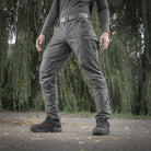 The M-Tac Conquistador Gen I Flex tactical pants will accompany you in any outdoor activities. Wear them to work, to a shooting range, on a hiking or camping trip, or a combat mission. Sewn from Rip-Stop Flex material, these cargo pants are abrasion resistant and are not prone to parching, so they will last you for many years to come. This highly breathable fabric also features dirt- and water-resistant Teflon coating to protect your legs from the outside world. These work pants have elastic inserts in the waist and on the thighs that ensure that you have complete freedom of movement. The pants have 8 pockets, so you can carry and evenly distribute all your gear and kit. The pockets are also additionally enforced on the upper seems, so you can clip your knife or flashlight without damaging the fabric. There are two D-rings sewn to the beltline, so you can attach even more gear. The back pockets have zippers to protect whatever is inside. The cargo pocket has a pouch on top of it that fill house an AK or an M4 magazine. The main cargo pocket can be closed with a hook and loop fastener and with a zipper. Pockets on the knees allow for dampers to be inserted to further protect your knee joints from impact. The bottom cuffs of the trousers come with elastic strings, so they can be either tightened or loosened.