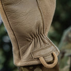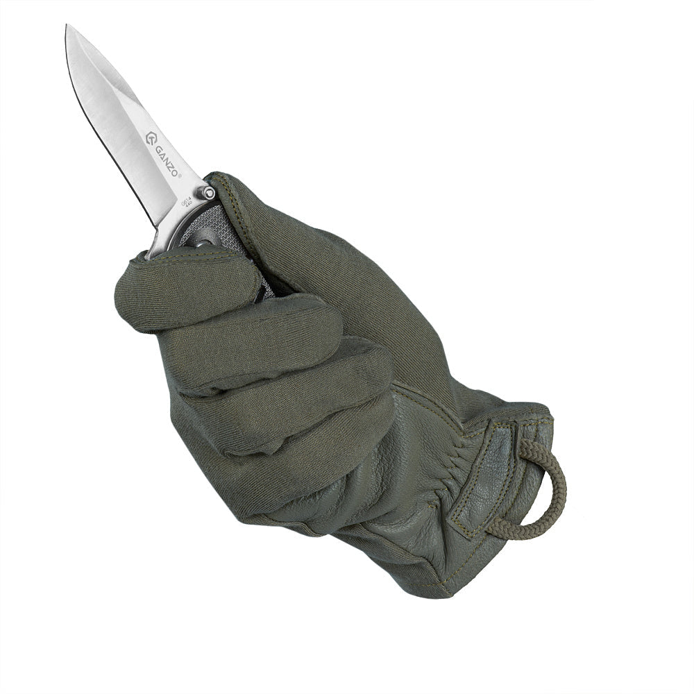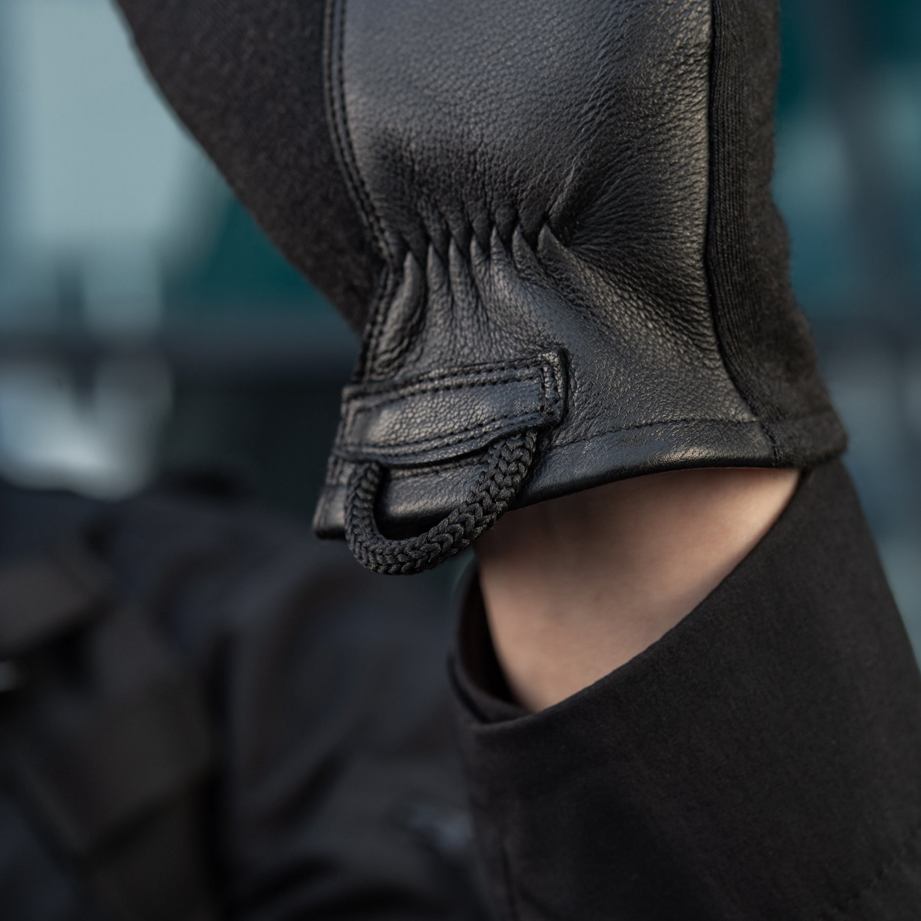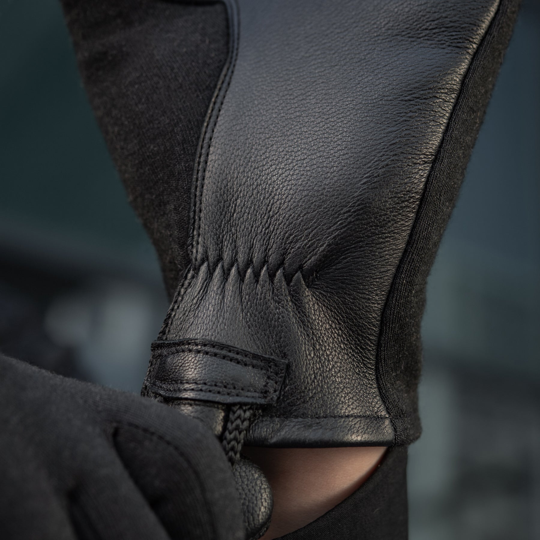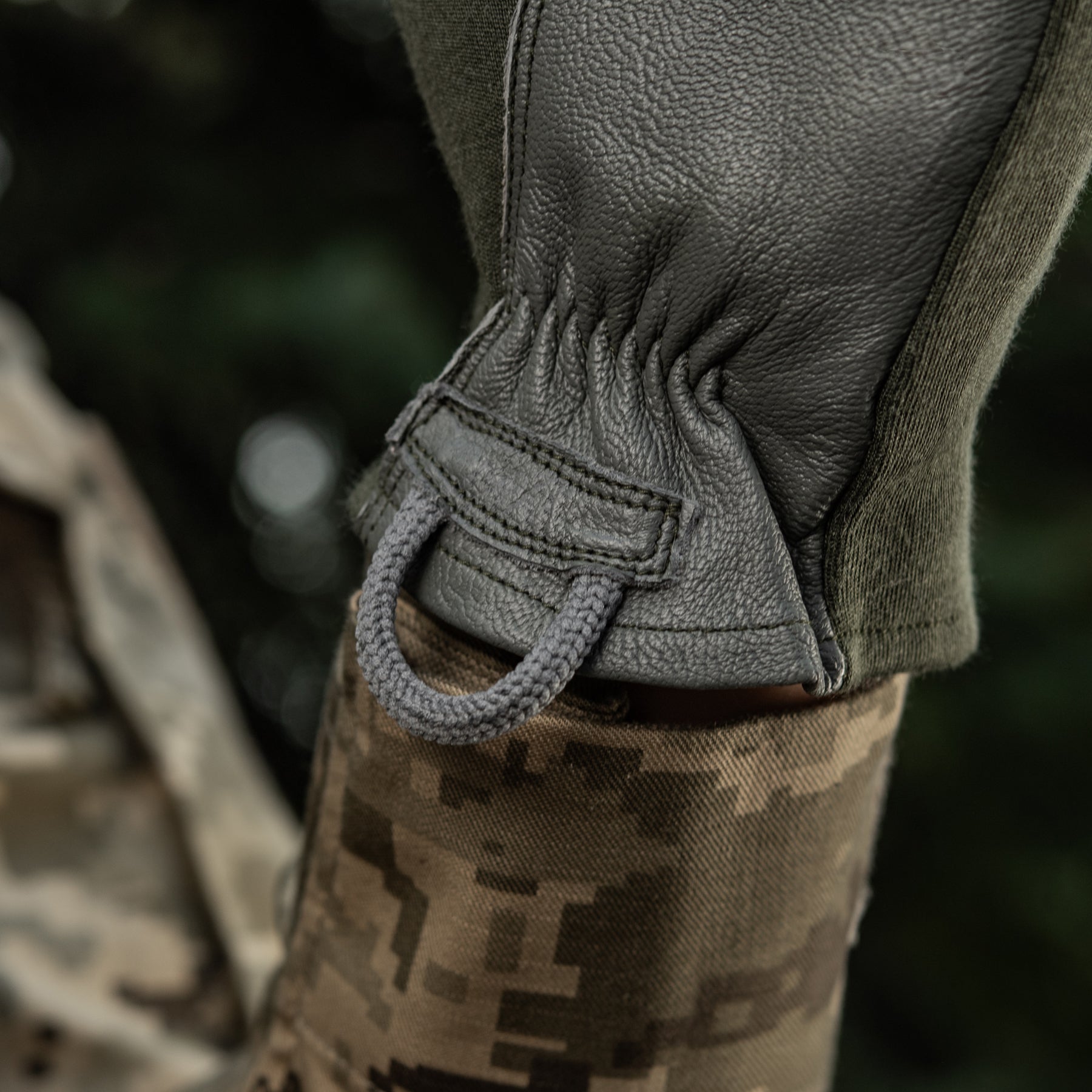 The lower part (palm and inner fingers) is made from genuine leather, offering excellent grip, thermal insulation, and natural breathability. An elastic wrist cuff ensures a secure fit, while a built-in cord loop allows attaching the gloves to your backpack, belt, or gear for quick access.