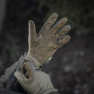 The M-Tac's Scout Tactical Gloves have a continuous stretch panel between the fingers and the elastic cuffs that provides a snug fit and flexible don & doffing of the gloves. Genuine leather wrapped around the palm and thumb with the index finger provides increased protection and better wear when handling the tools. Hands' skin stay cool and dry with sweat-wicking technology around the wrist and fingers.
