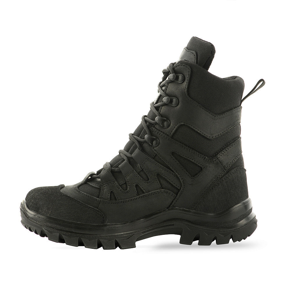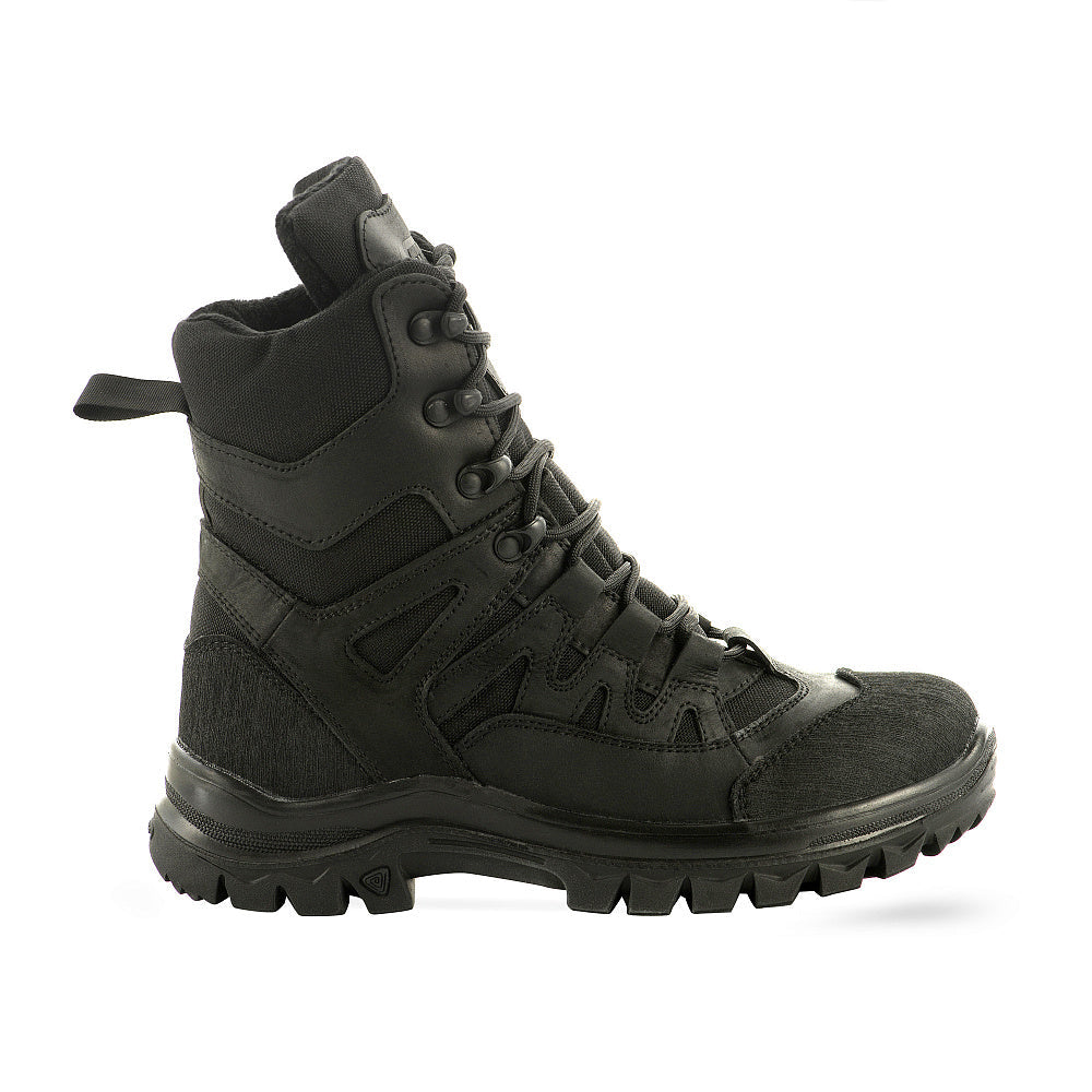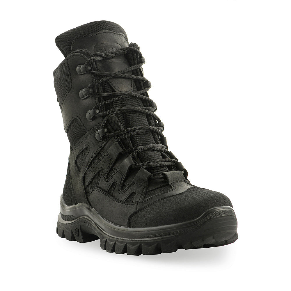 The M-Tac Field Boots with Insulation Mk.2W R Gen.II are a versatile, combined boot model designed for reliable performance in various weather conditions. These boots are constructed from natural leather combined with durable 1000D Nylon inserts, all in a uniform black color. The upper is treated with a water-repellent impregnation that ensures foot comfort in any weather, without compromising the material's ability to breathe.