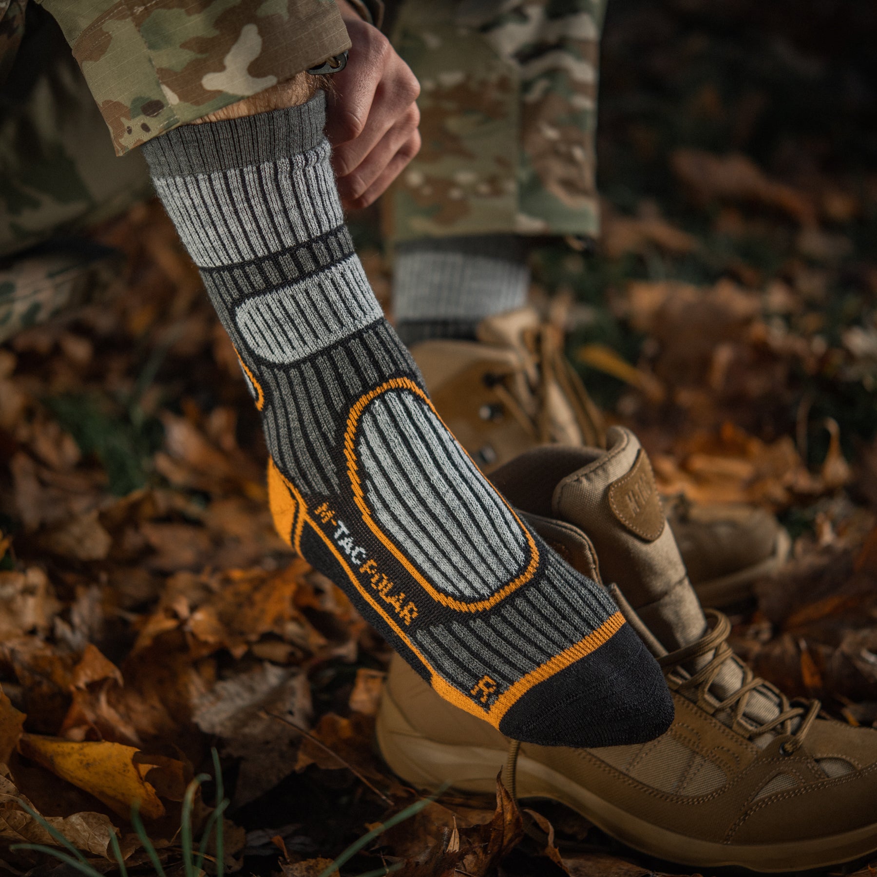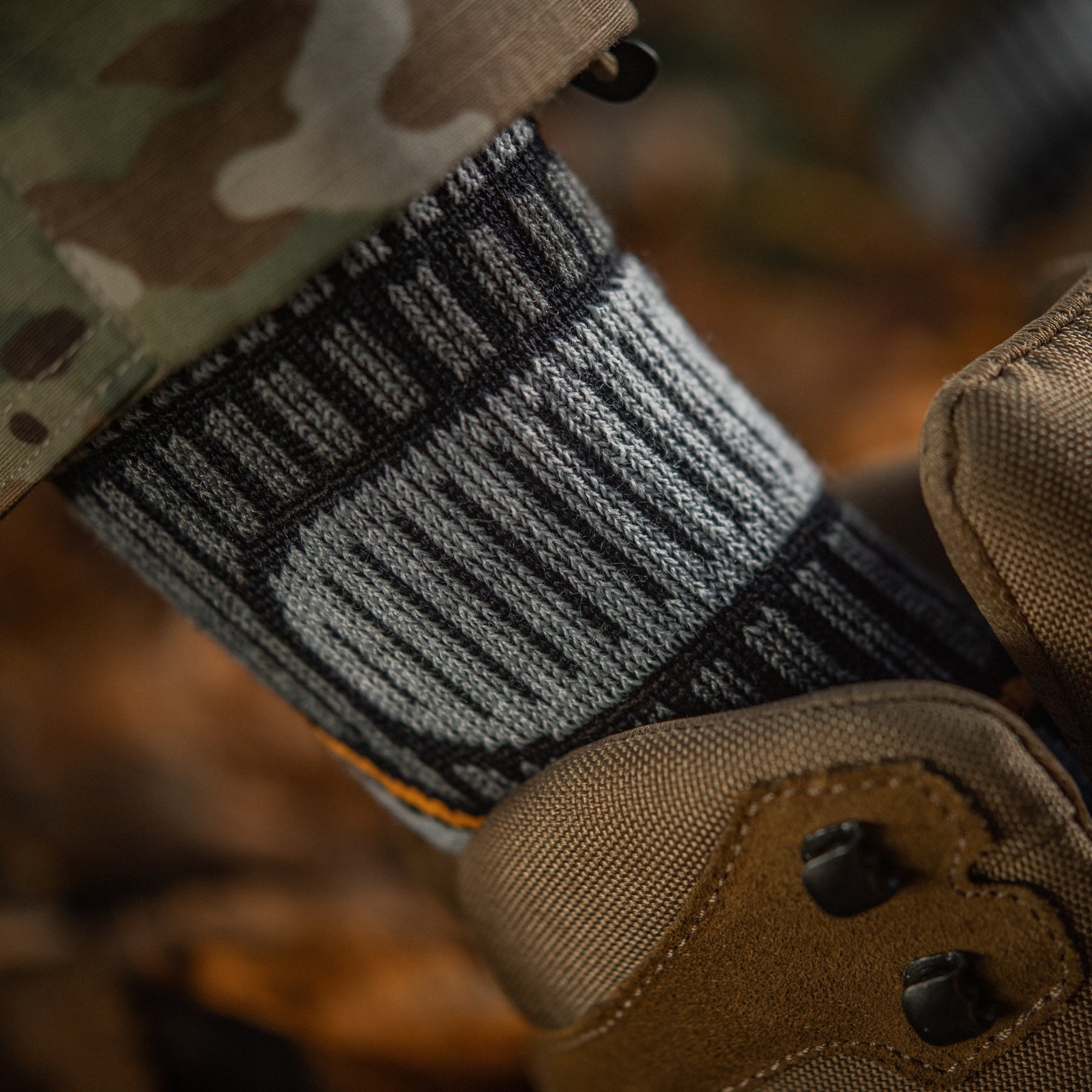 M-Tac Merino 40% socks - wool socks for outdoor activities. A woolen fiber (Merino Wool) is suitable for making socks due to its ability to transport moisture, absorbency, thermal insulation, mechanical resistance, elasticity, and environmental friendliness.