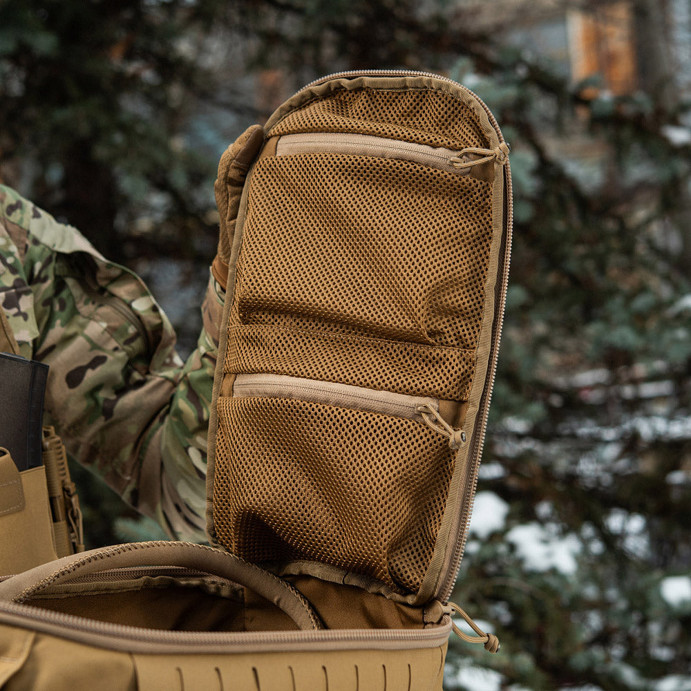 Made from Cordura 500D and 1000D, this backpack ensures exceptional durability, abrasion resistance, and protection against mechanical damage. The main compartment opens like a suitcase for easy access and organization, featuring a hydration bladder sleeve and a top port for the hydration tube.