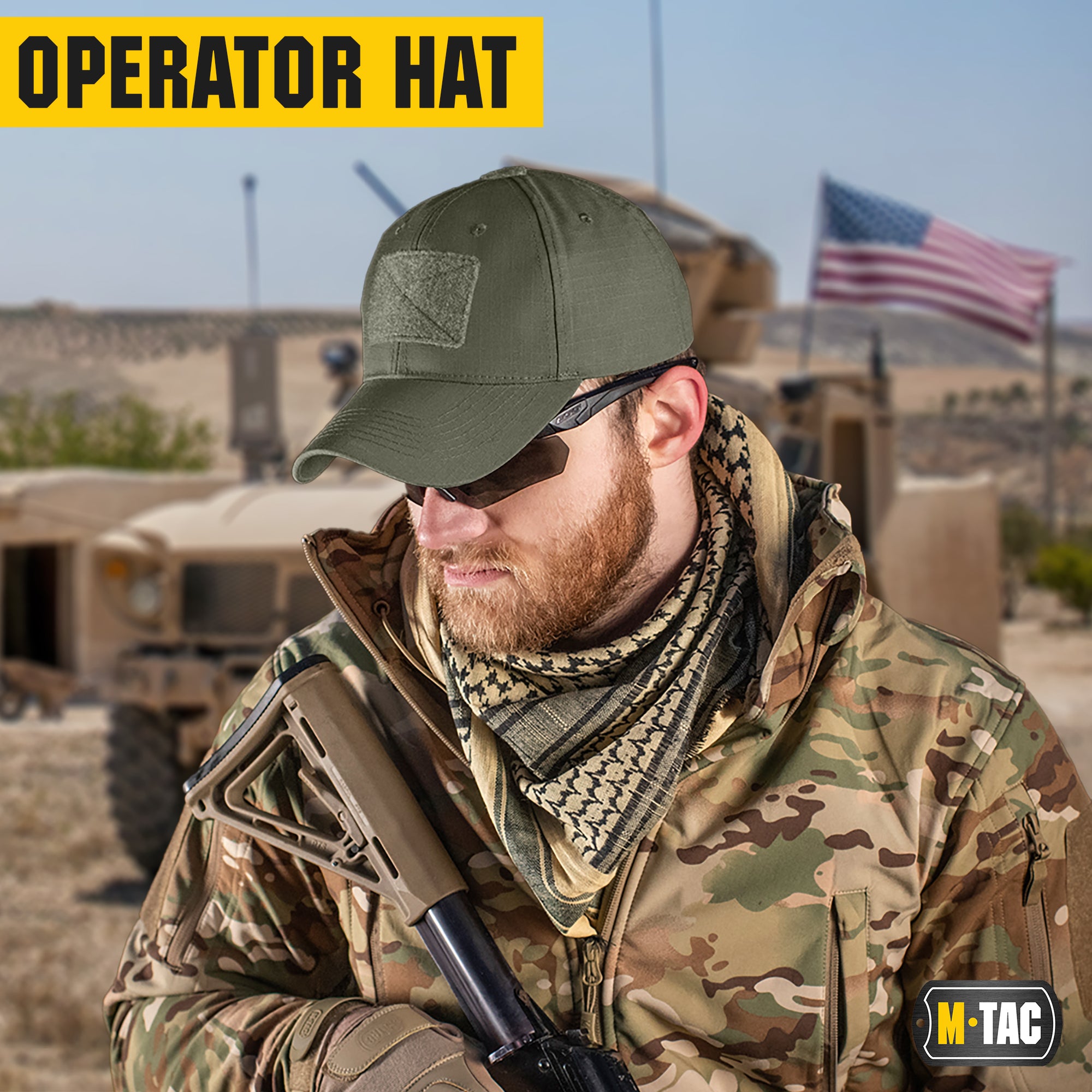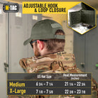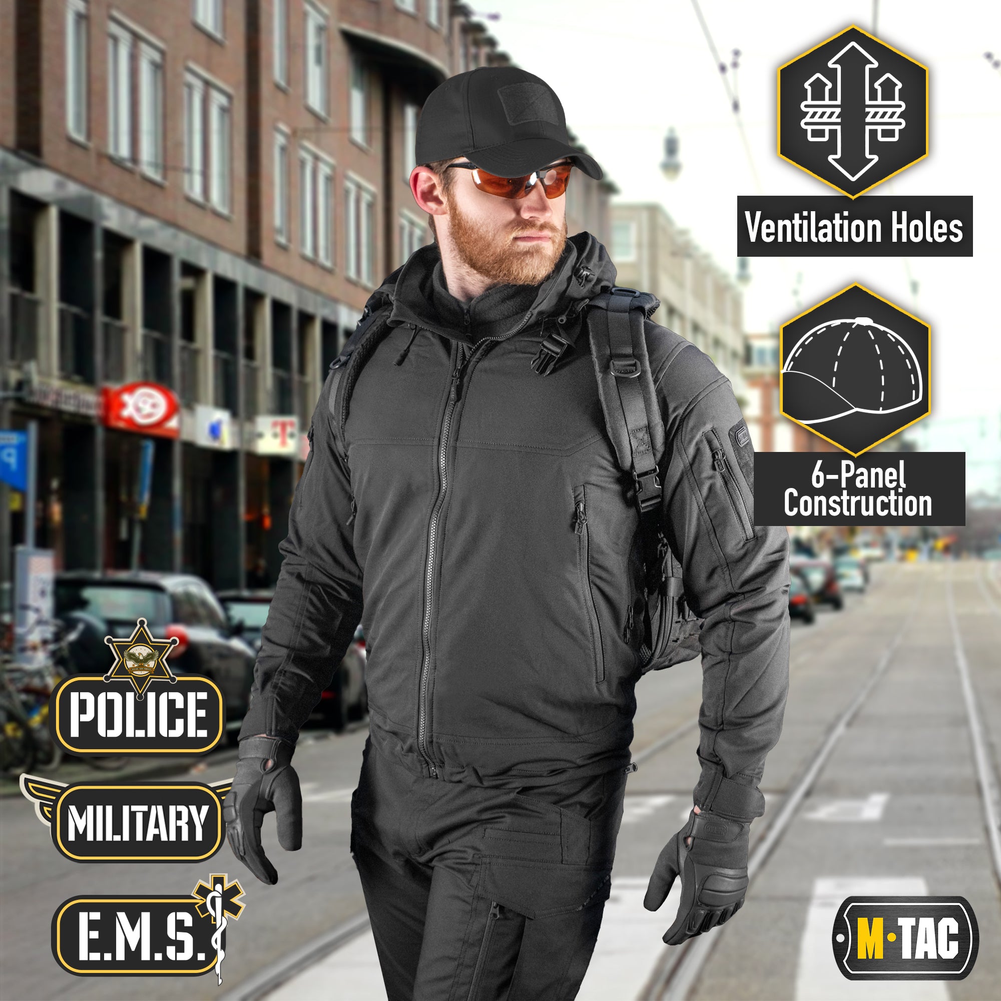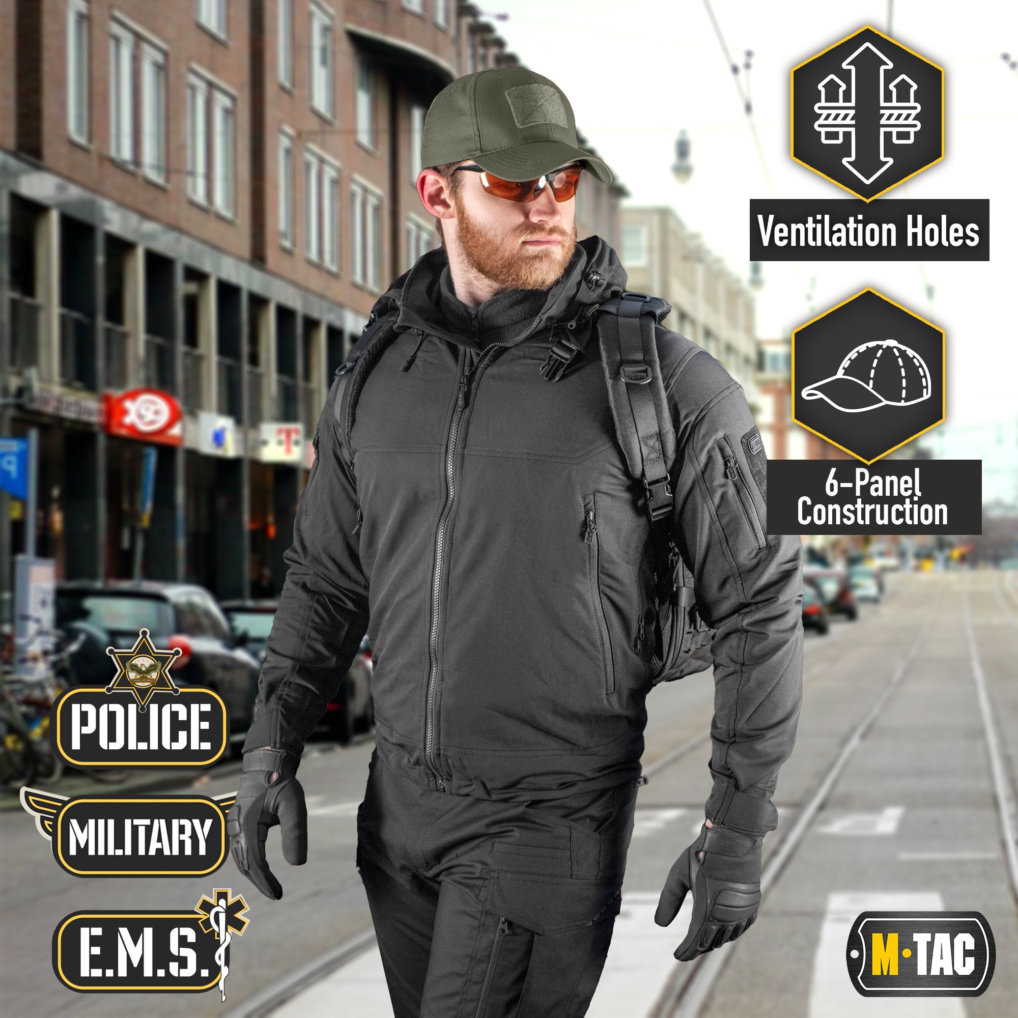 Tactical Flex baseball cap from the M-Tac brand. It has six panels. The cap is sewn from a light, plain rip-stop fabric, with a water- and mud-protective Teflon impregnation. The model has a medium fit and looks good on almost any head. The visor is dense and keeps its shape. The manufacturer added a signature panel on the back, a Velcro panel on the front, as well as an IR patch Velcro panel. The size of the cap can be adjusted with Velcro hoop&loop system. There are six ventilation eyelets on the top of the crown.Сomposition of materials- 64% cotton, 32% polyester, 4% spandex.