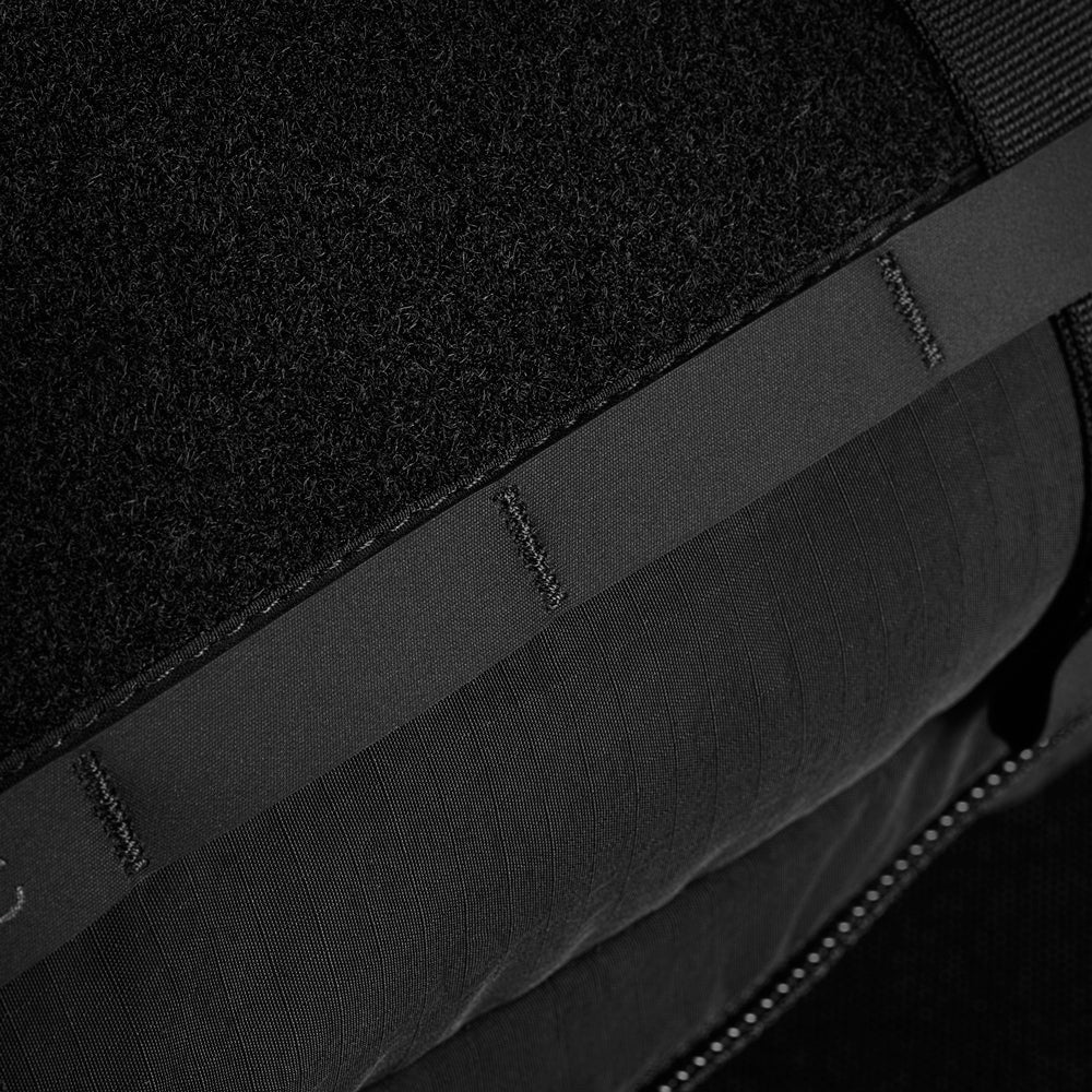The front of the bag features a spacious pocket with a Velcro panel for identifiers and patches. Additionally, two Woojin Tension Hook ties allow you to secure a lightweight windbreaker or jacket to the exterior.