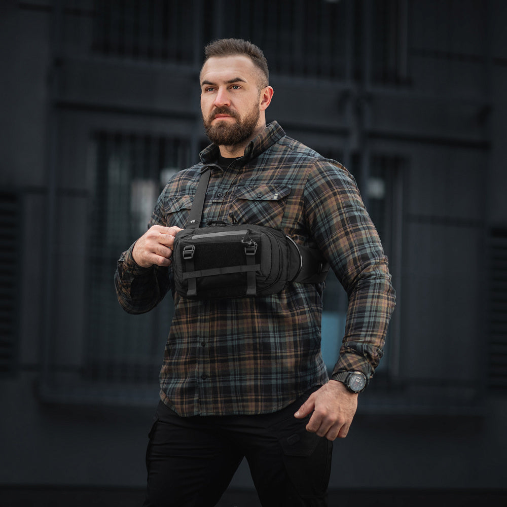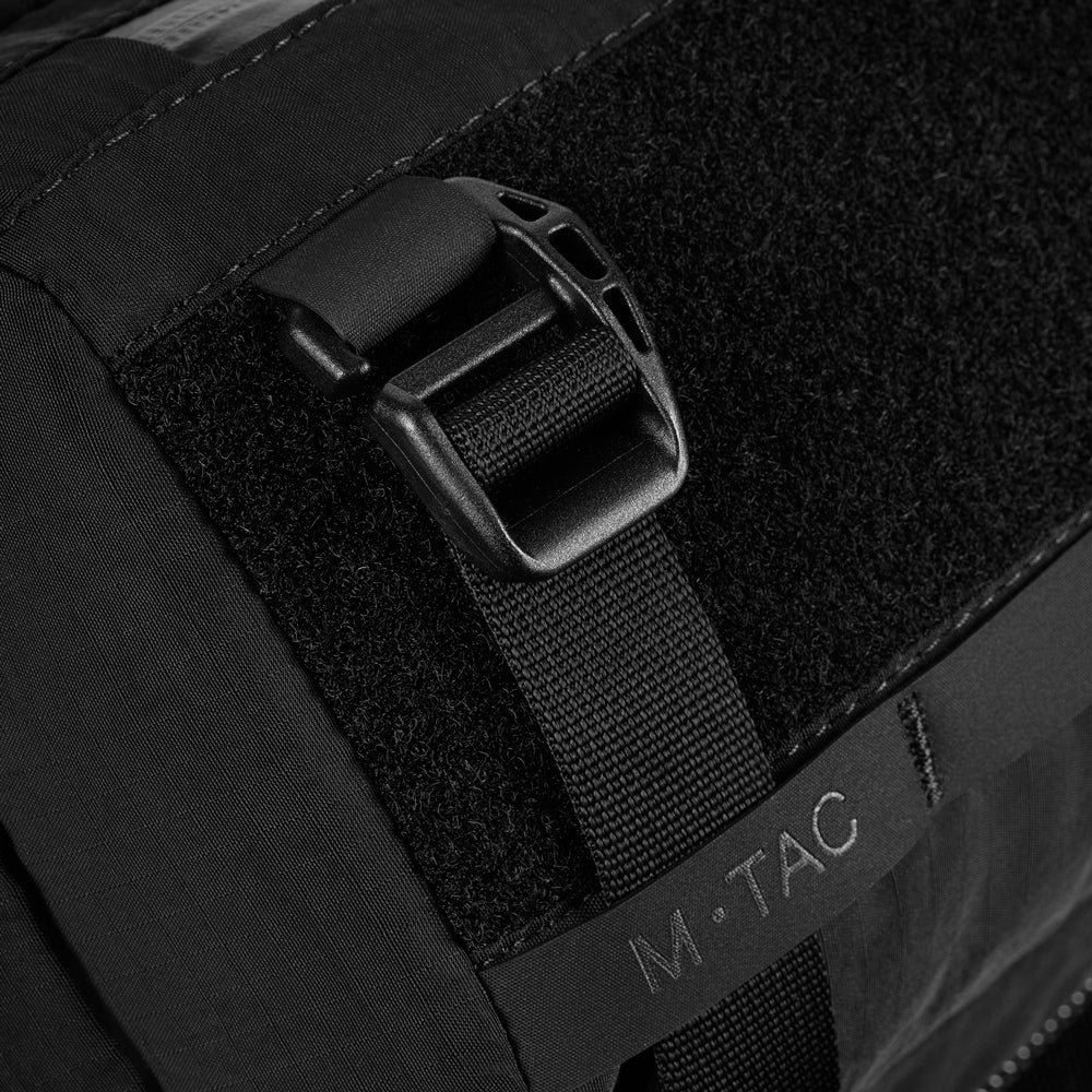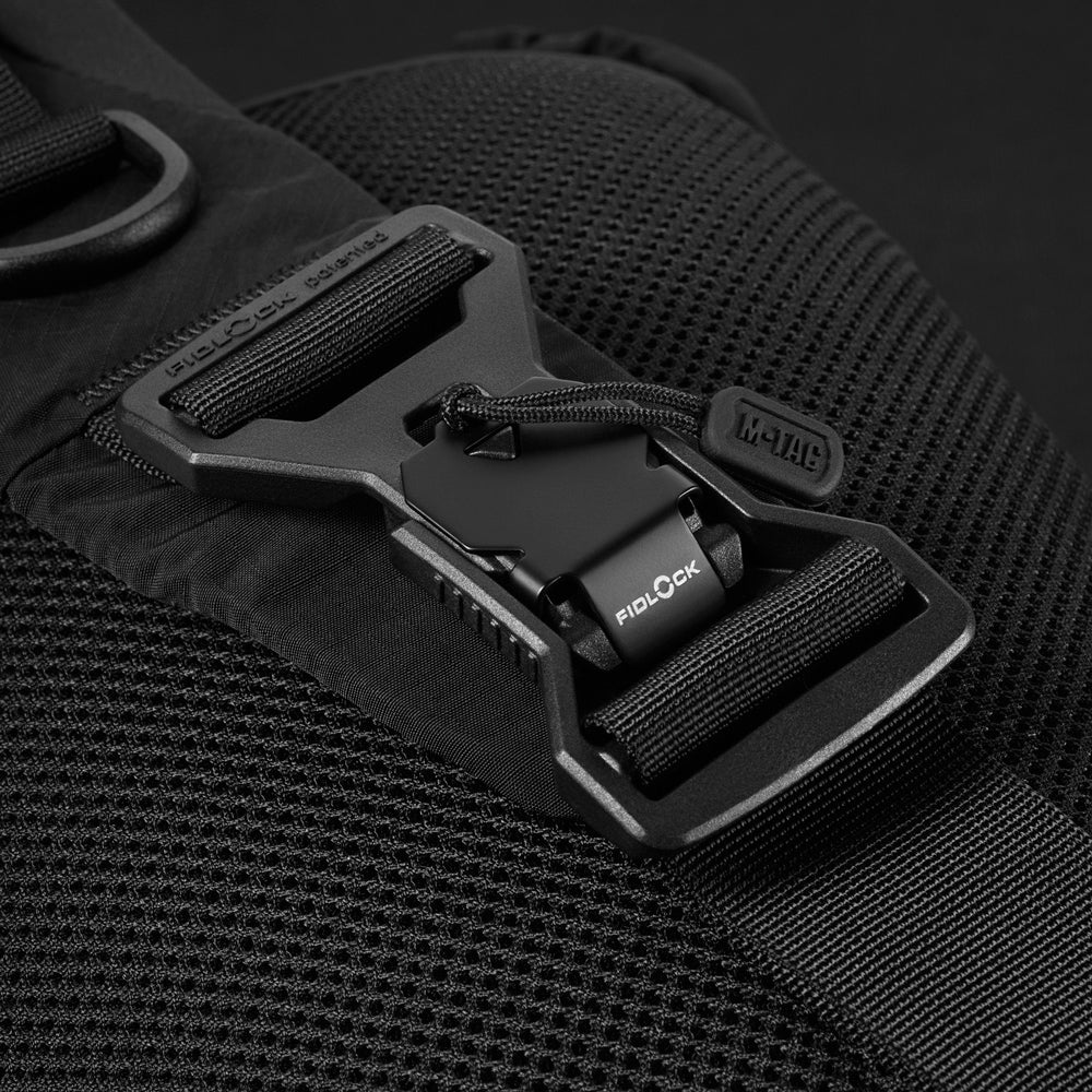 The M-Tac Civilian Sling Bag Lite-NR can be worn either vertically or horizontally thanks to its specialized strap construction and side inserts that prevent items from falling out. The strap is equipped with a high-quality Fidlock magnetic buckle and D-rings for extra gear attachment.