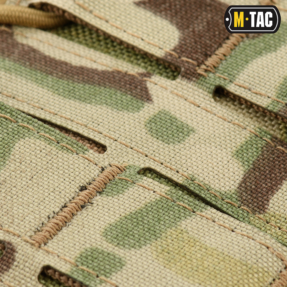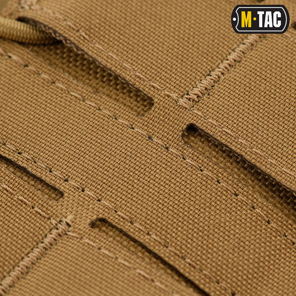 M-Tac also implemented a new external modular attachment technology: instead of traditional sewn-on PALS webbing, several rows of precision-cut holes are laser-cut into a nylon layer. This allows for compatibility with standard MOLLE gear while reducing the overall weight of the product by approximately 35%.