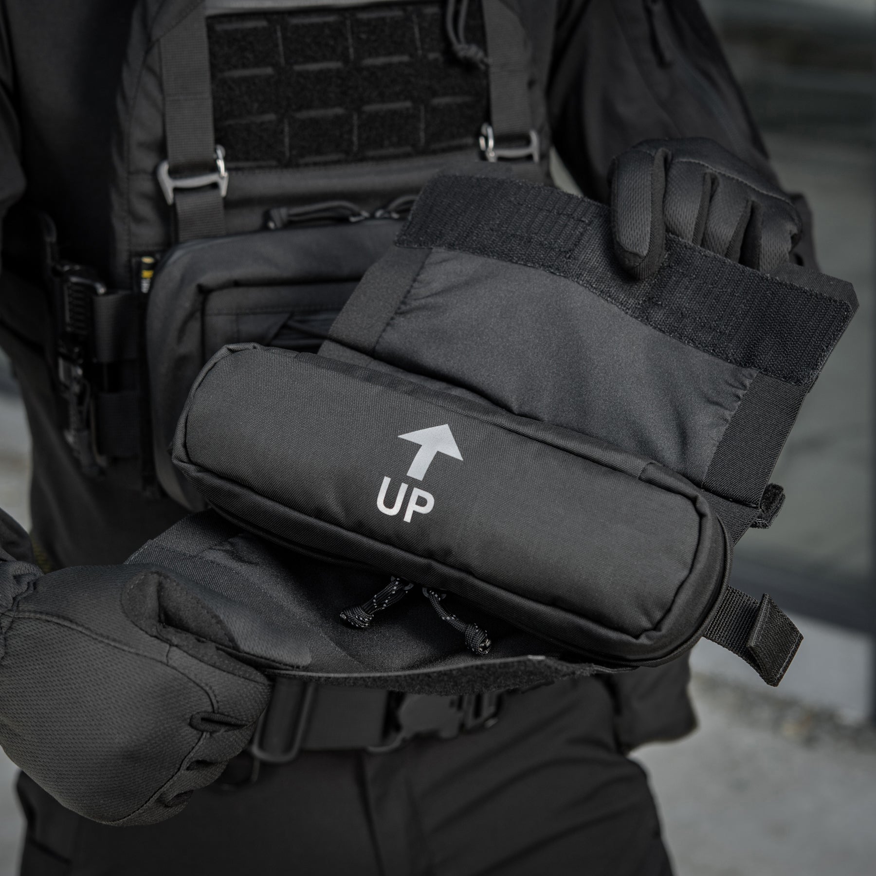 The outer shell is volume-adjustable and allows dual-side access to the IFAK. A quick-pull strap on the IFAK enables rapid deployment, and the two parts connect via VELCRO® Brand to prevent accidental loss.