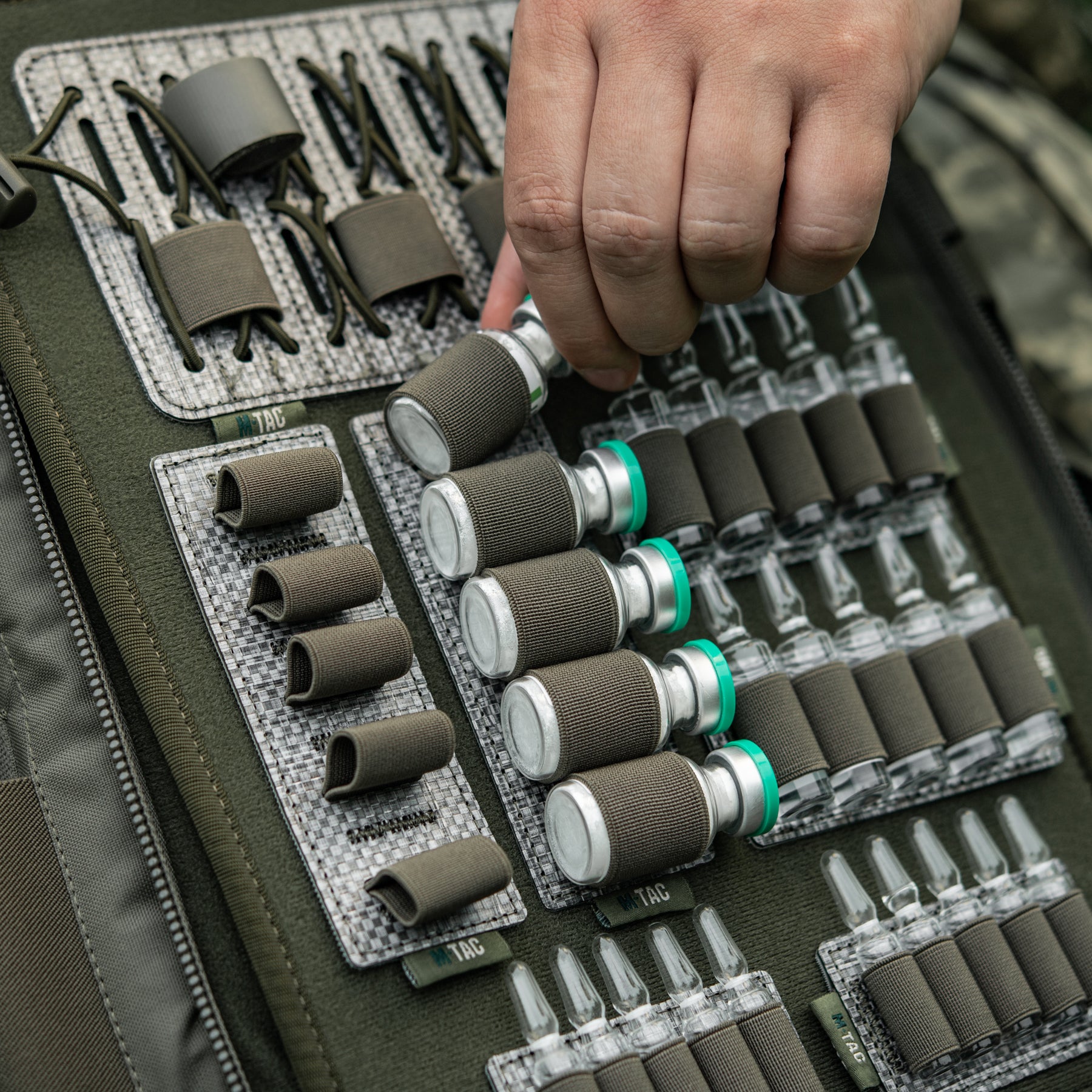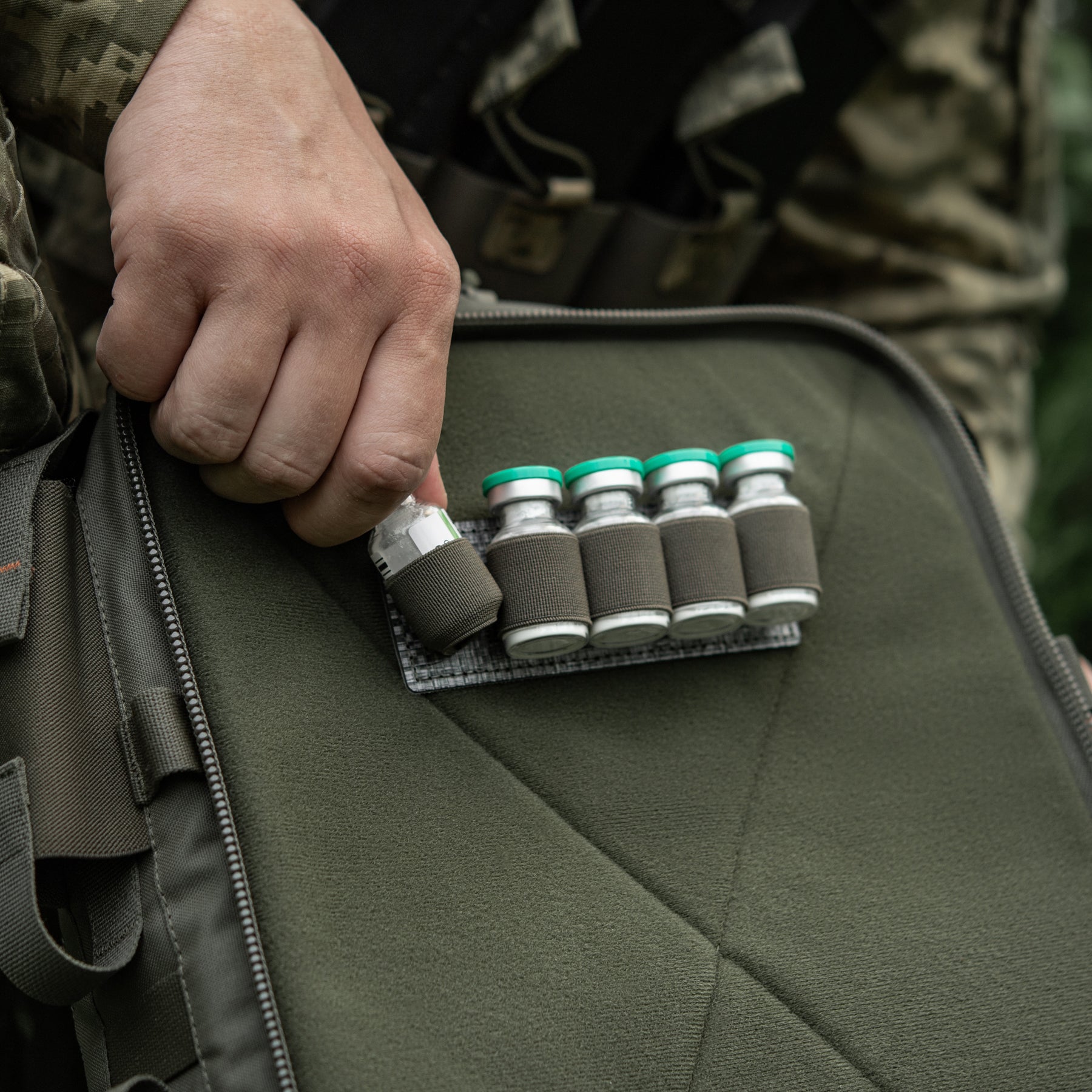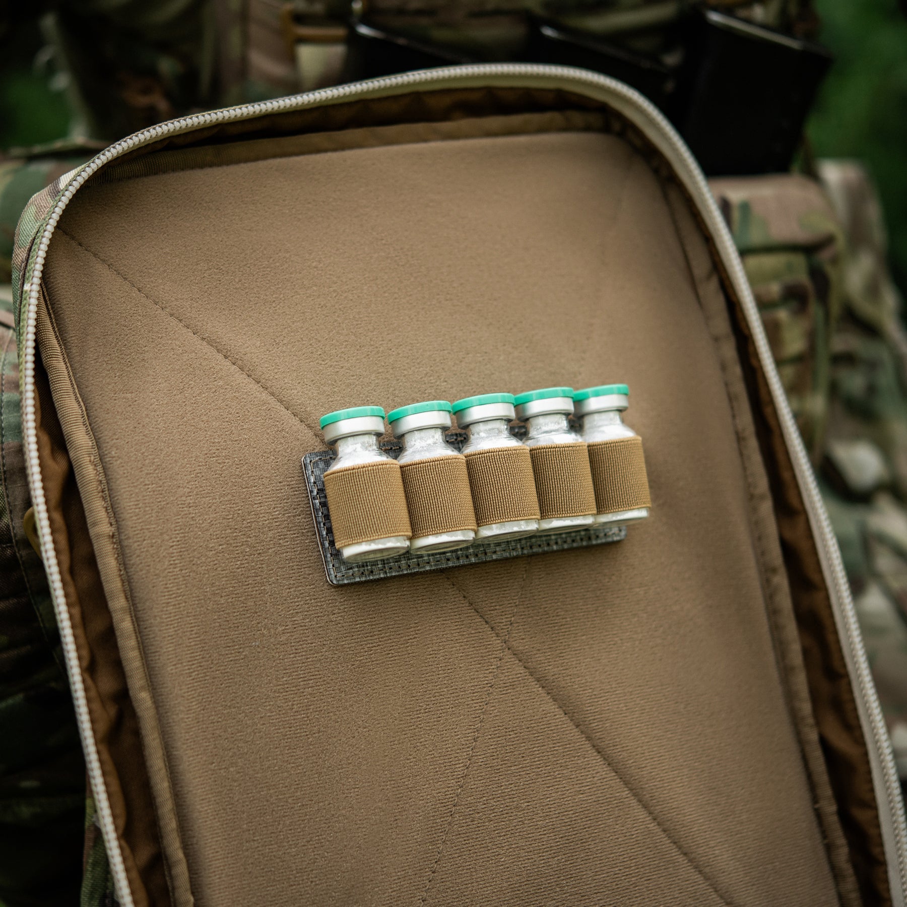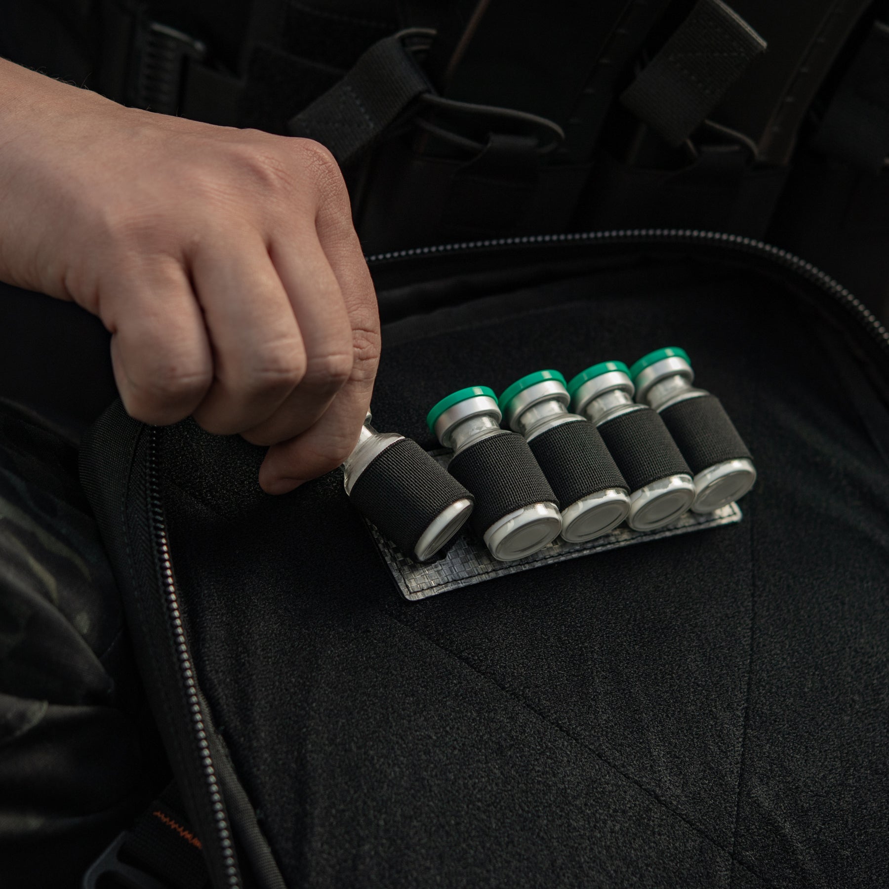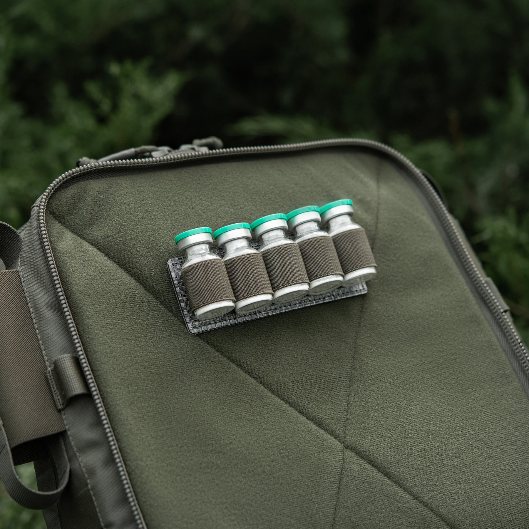 The back side of the insert is fully equipped with a hook panel, allowing you to easily adjust and secure its placement within your medical equipment according to your specific needs. The modular insert features five elastic retention bands that are sized to conveniently and securely hold 10 ml volume ampoules in place, preventing movement and damage during transport. This insert is an excellent solution for enhancing the functionality and organization of any tactical or medical pack.