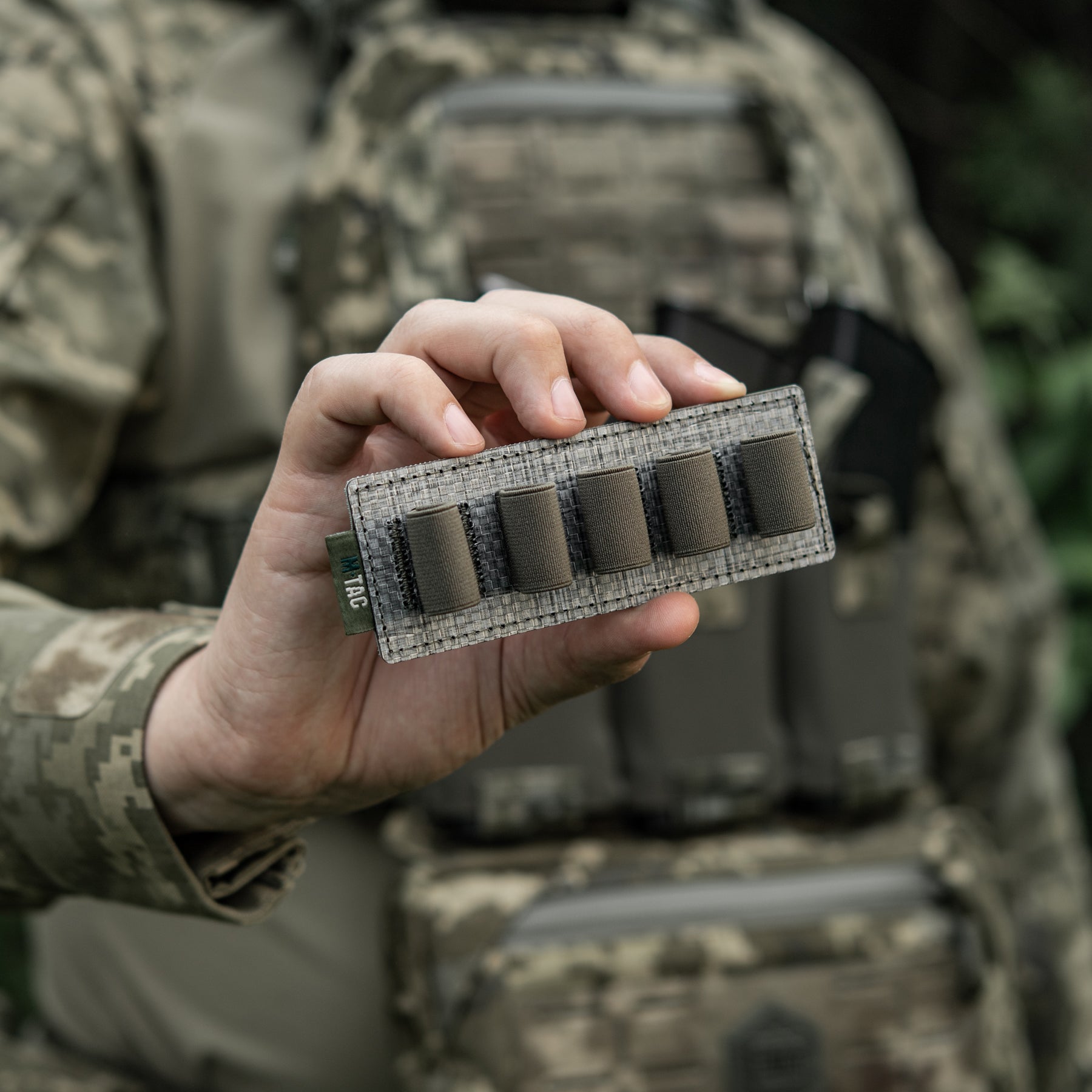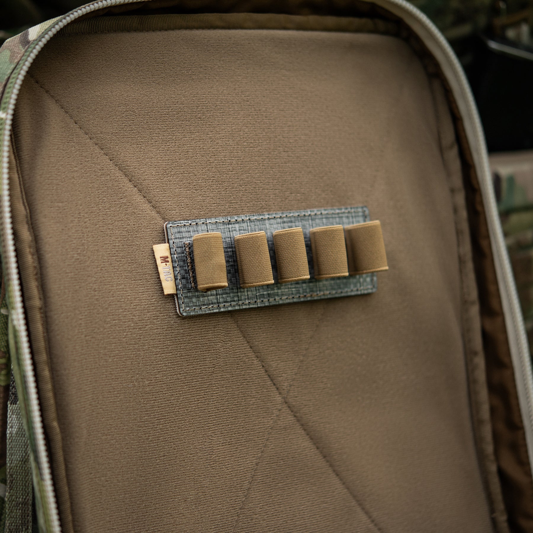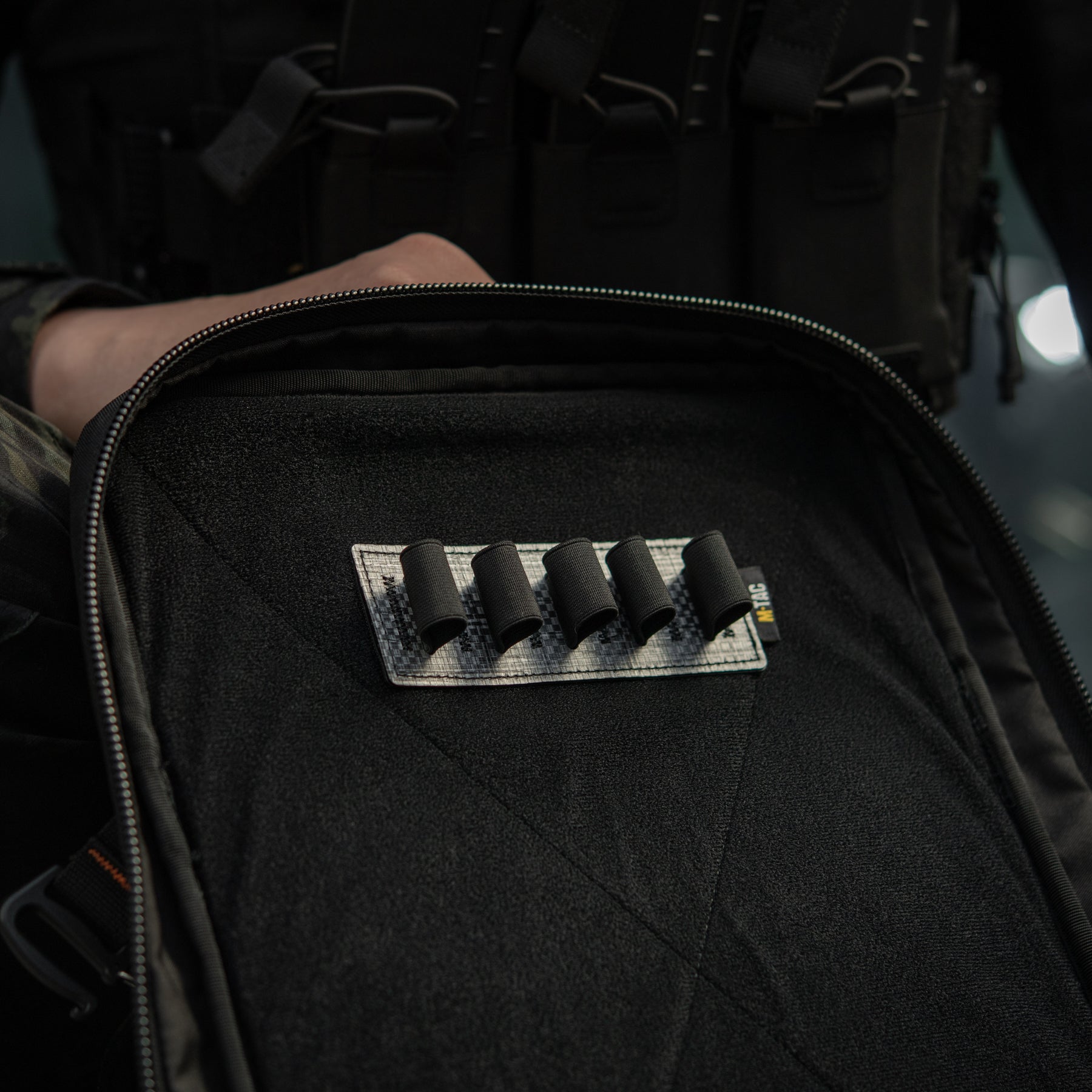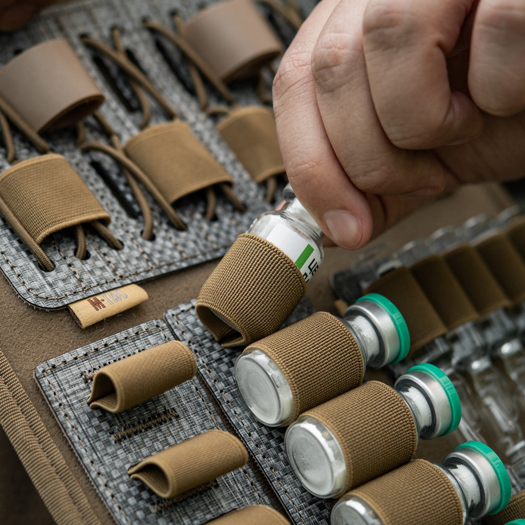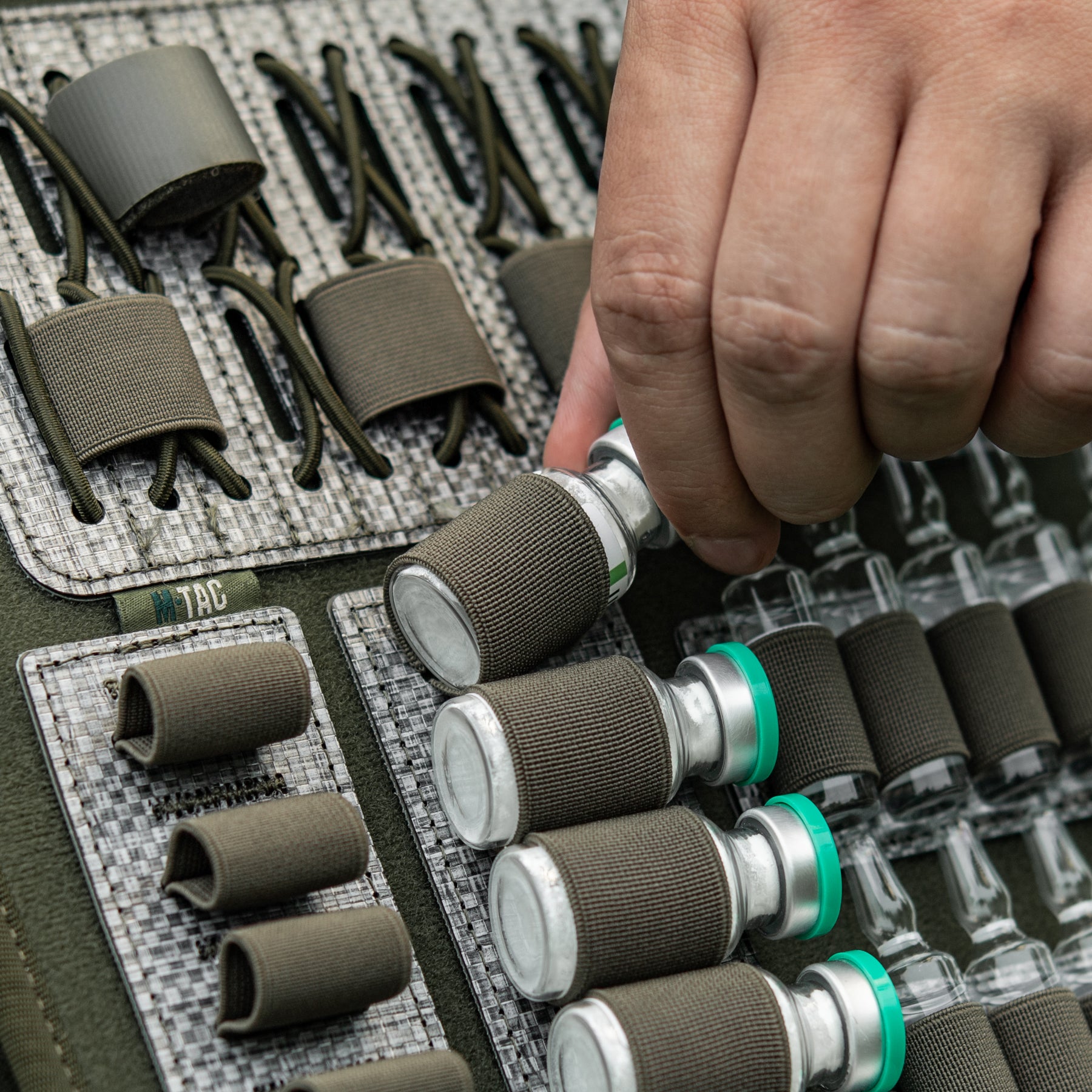 The back side of the insert is fully equipped with a hook panel, allowing you to easily adjust and secure its placement within your medical equipment according to your specific needs. The modular insert features five elastic retention bands that are sized to conveniently and securely hold 10 ml volume ampoules in place, preventing movement and damage during transport. This insert is an excellent solution for enhancing the functionality and organization of any tactical or medical pack.