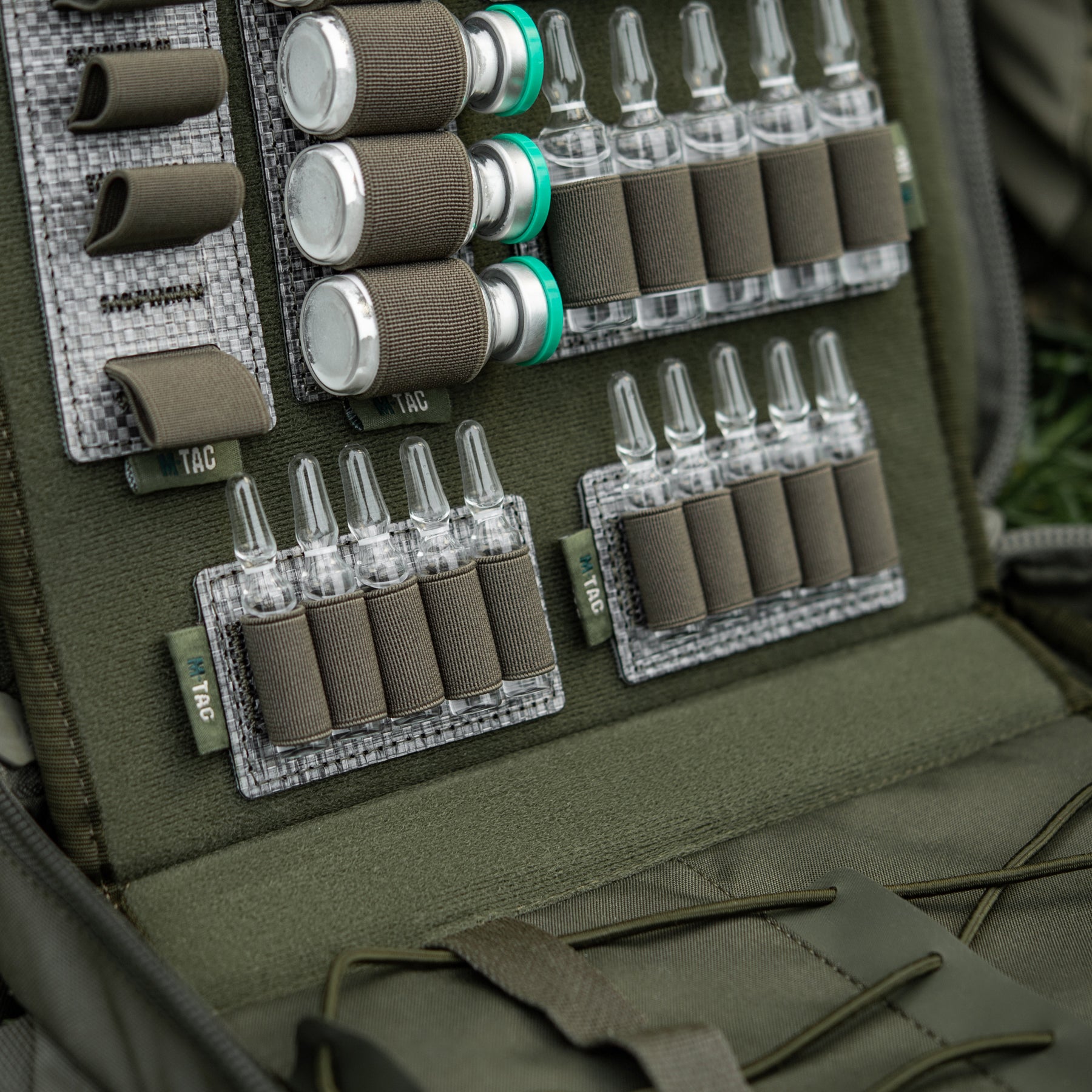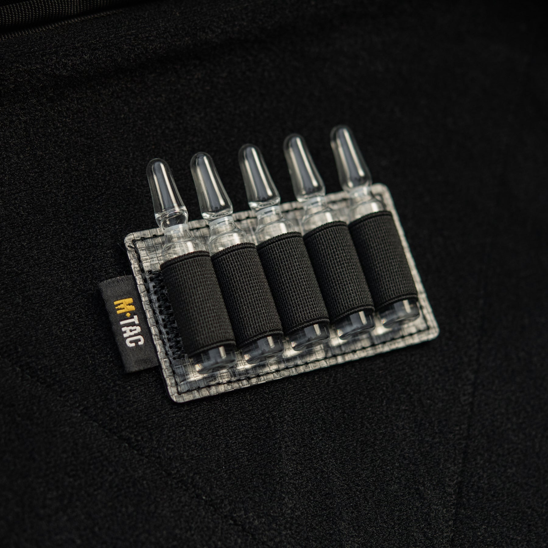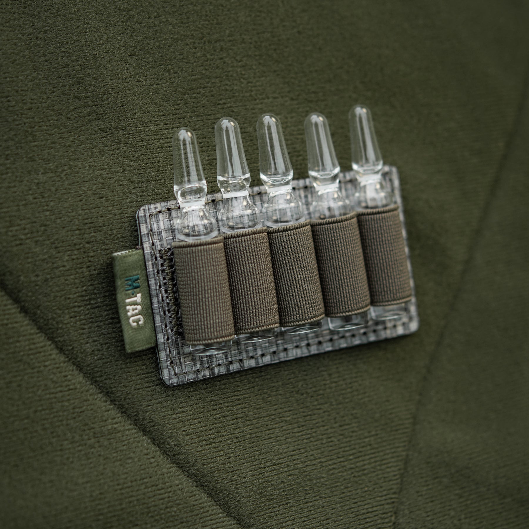 The back side of the insert is fully equipped with a hook panel, allowing you to easily adjust and secure its placement within your medical equipment according to your specific needs. The modular insert features five elastic retention bands that are sized to conveniently and securely hold 2 ml volume ampoules in place, preventing movement and damage during transport. This insert is an excellent solution for enhancing the functionality and organization of any tactical or medical pack.