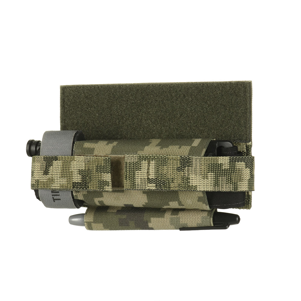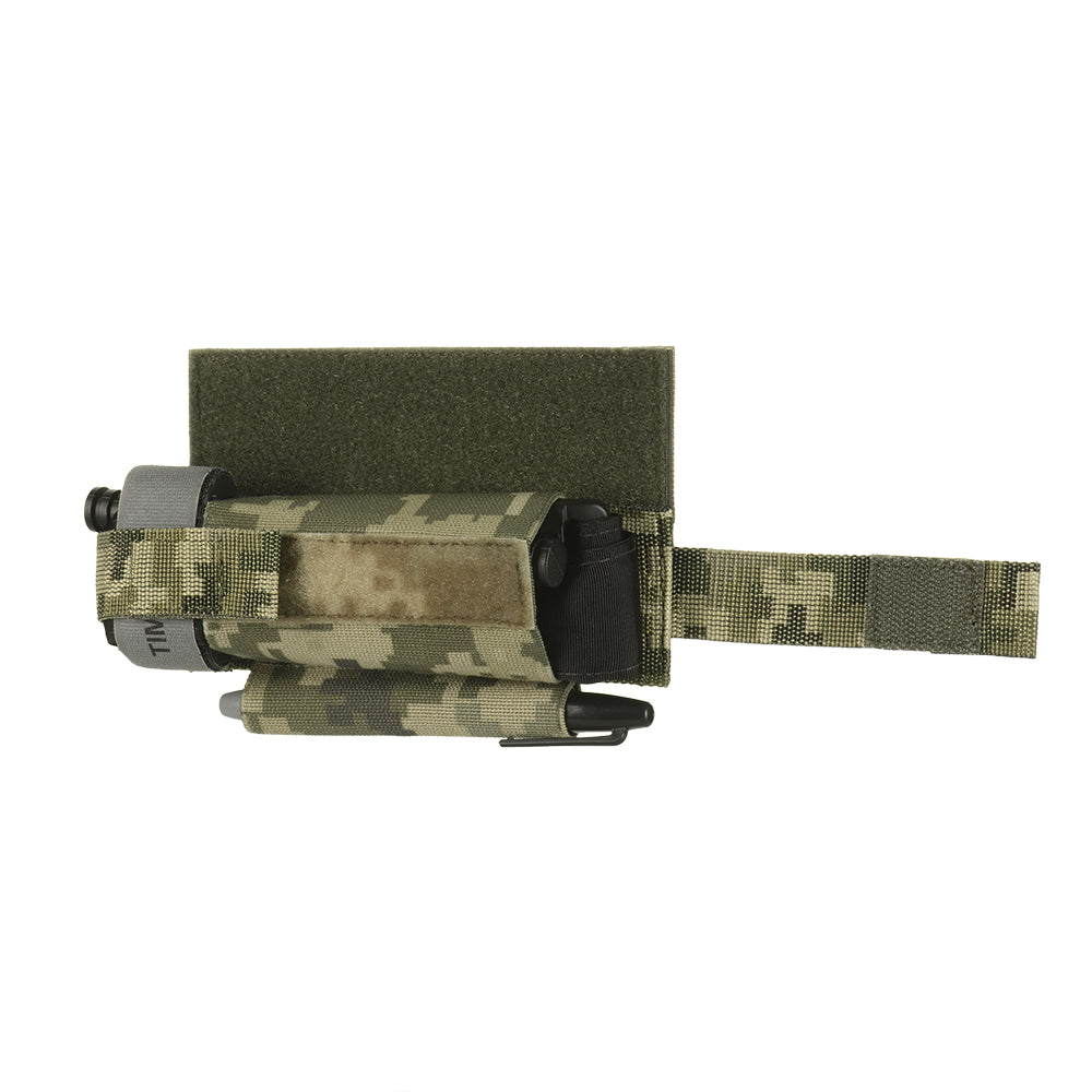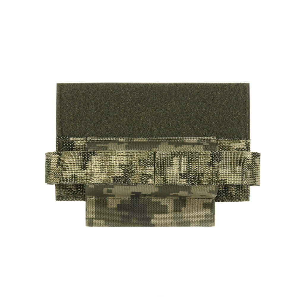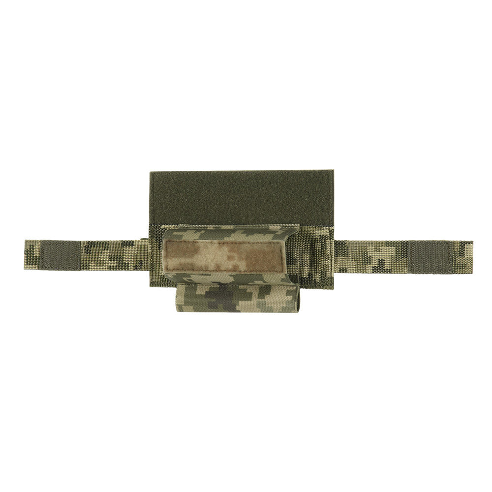 This model is designed to attach to the front loop panel under the flap of a plate carrier. It allows the tourniquet to be positioned on the left side, the right side, or directly beneath the plate carrier panel. Additionally, an elastic loop is provided at the bottom for carrying a marker.