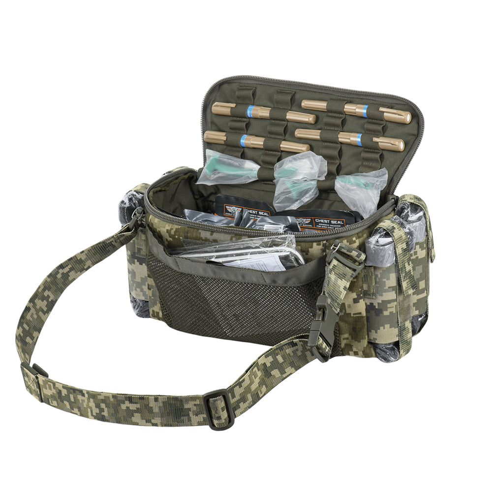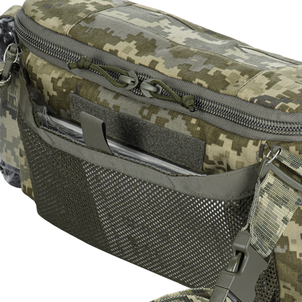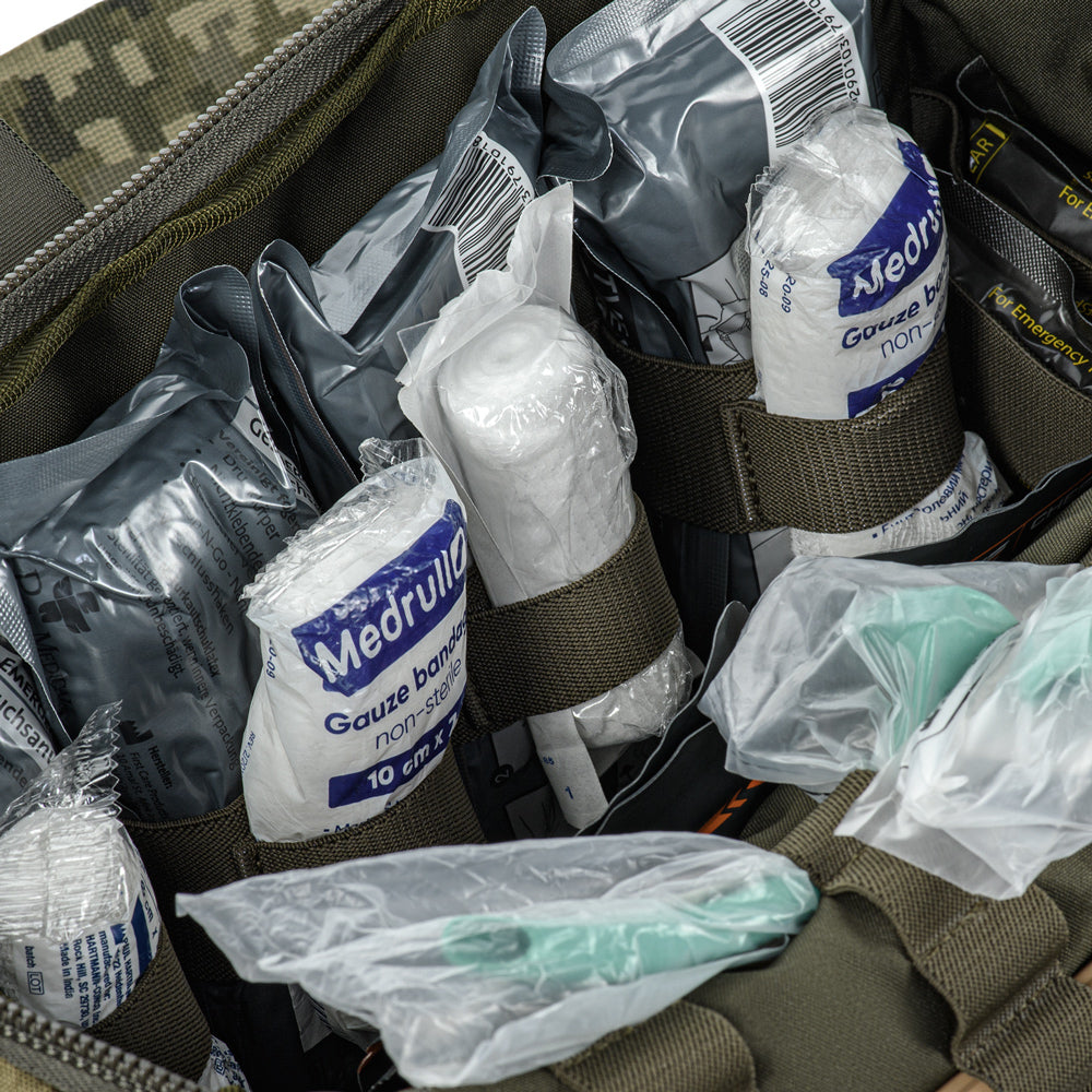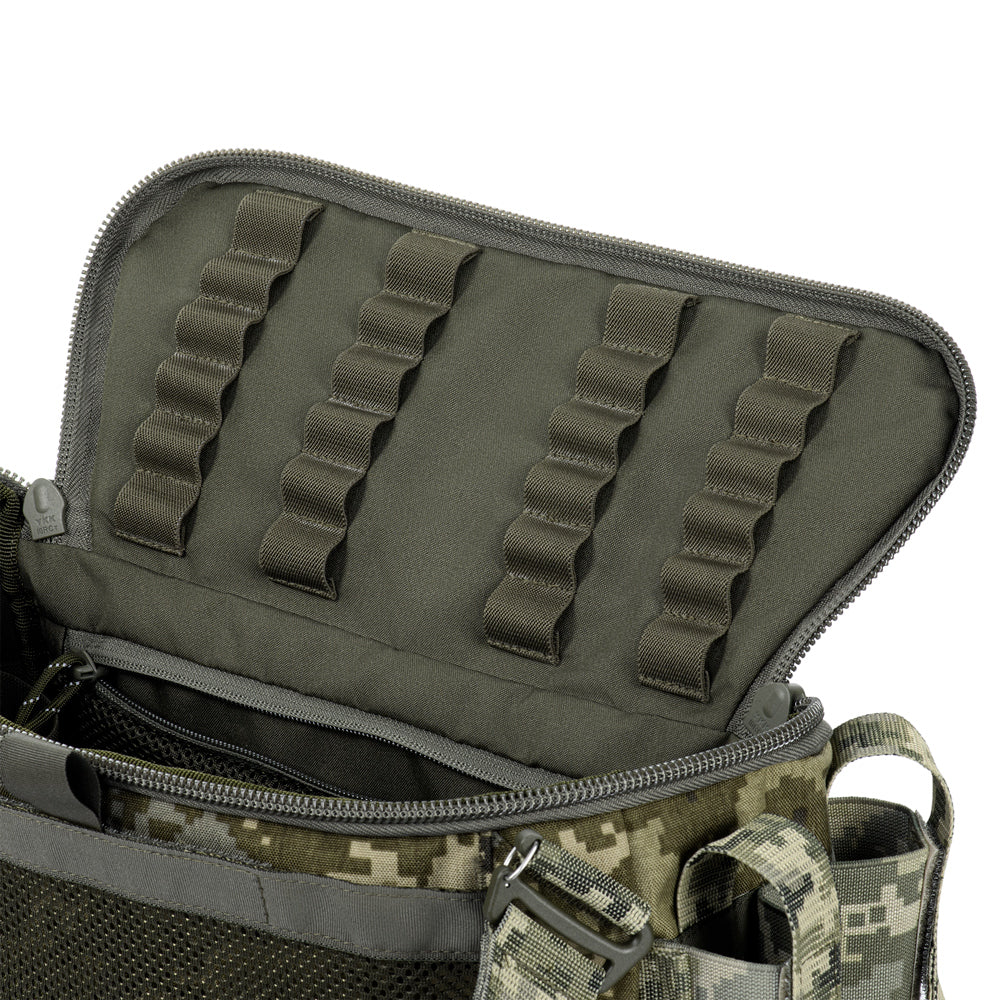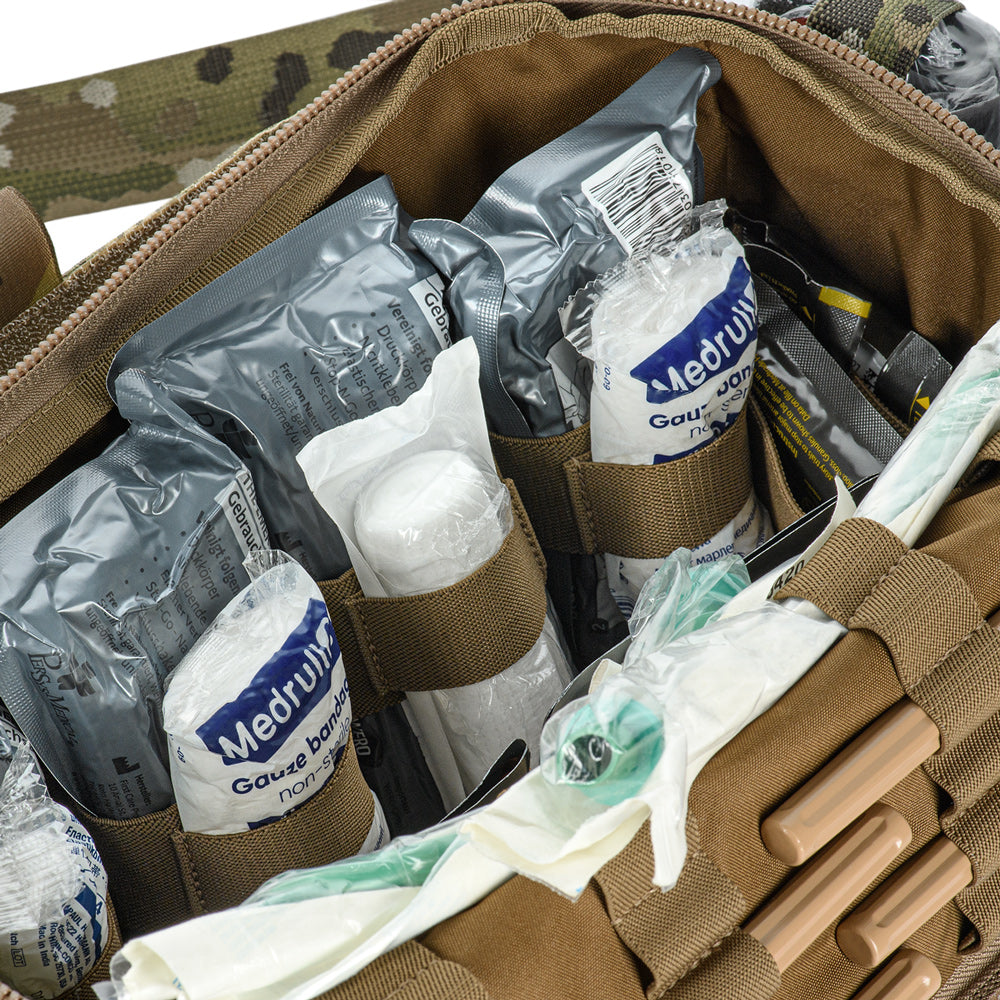 The Elite medical bag features a single main compartment equipped with an organizer specifically adapted to the MARCH algorithm (used in the TCCC – Tactical Combat Casualty Care concept, applied at the second stage of care: Tactical Field Care, or in the yellow/green zone). The back and side sections of the organizer are designed to store first-level medical supplies related to “M” (Massive bleeding), while the flap and front sections are intended for second and third levels — “A” (Airway Management) and “R” (Respiration). A large inner mesh pocket provides additional space for essential medical equipment.
