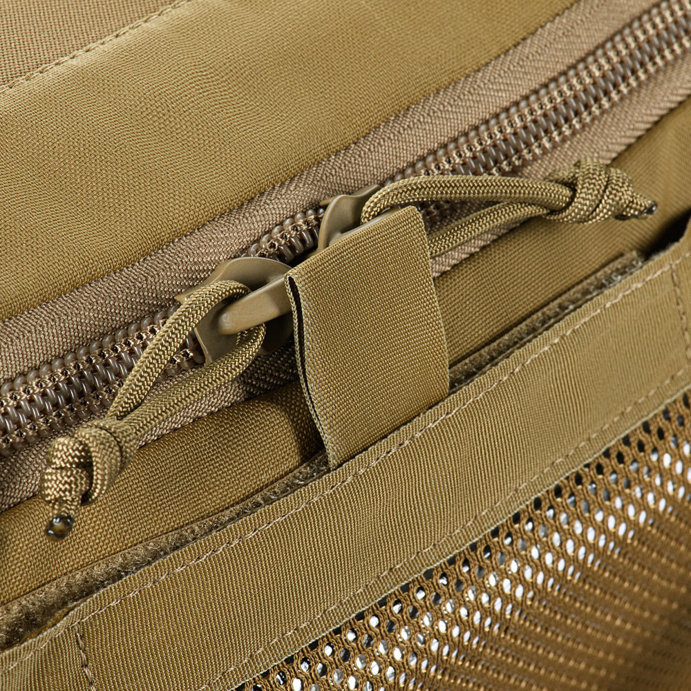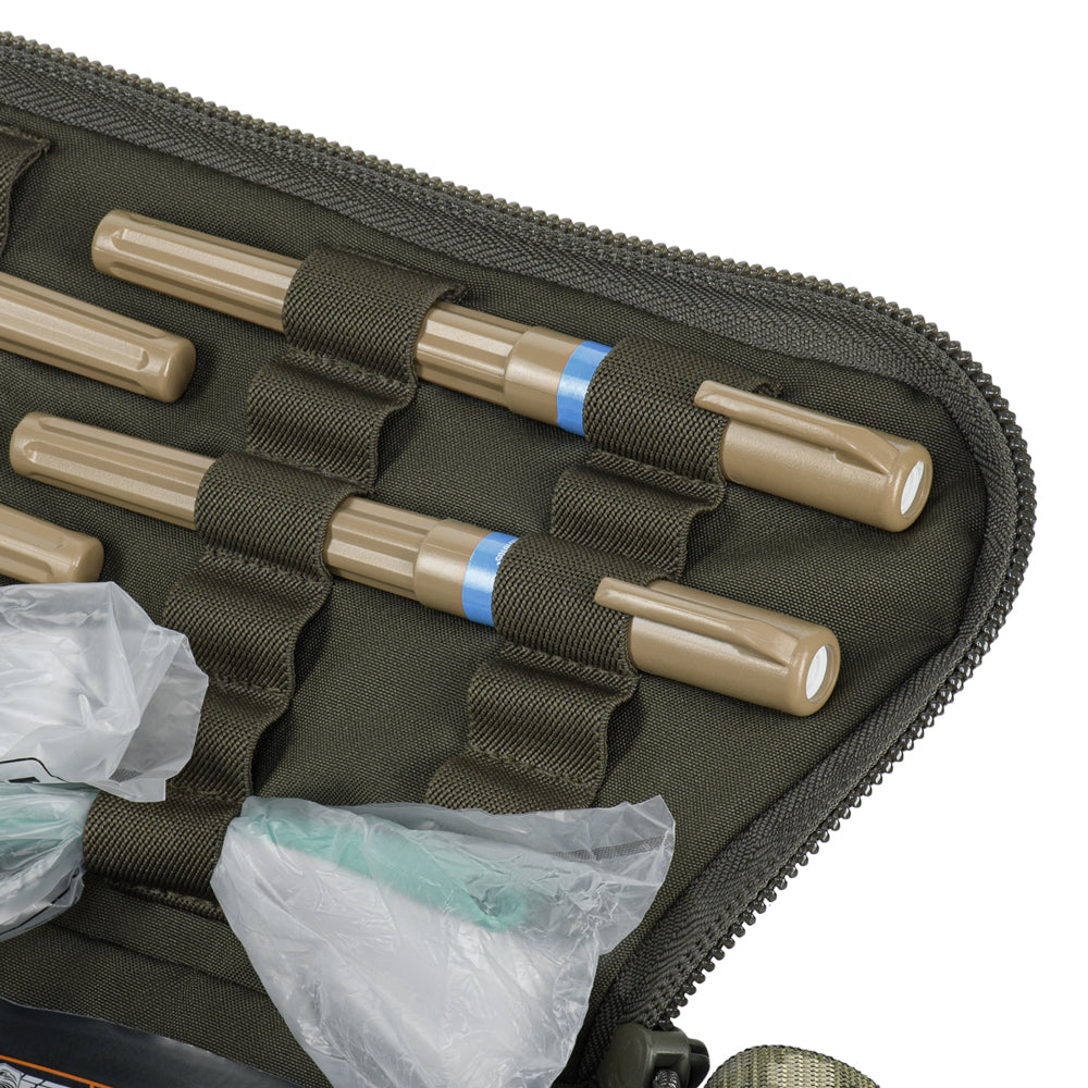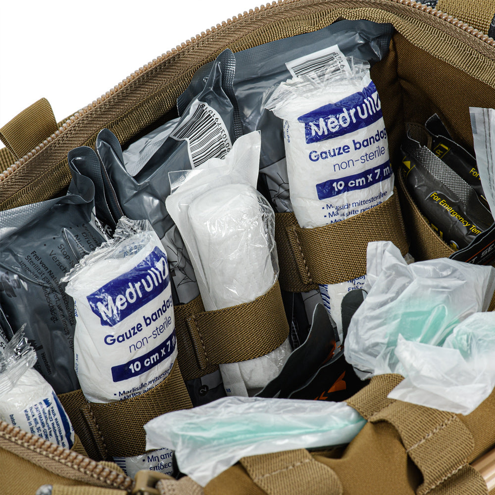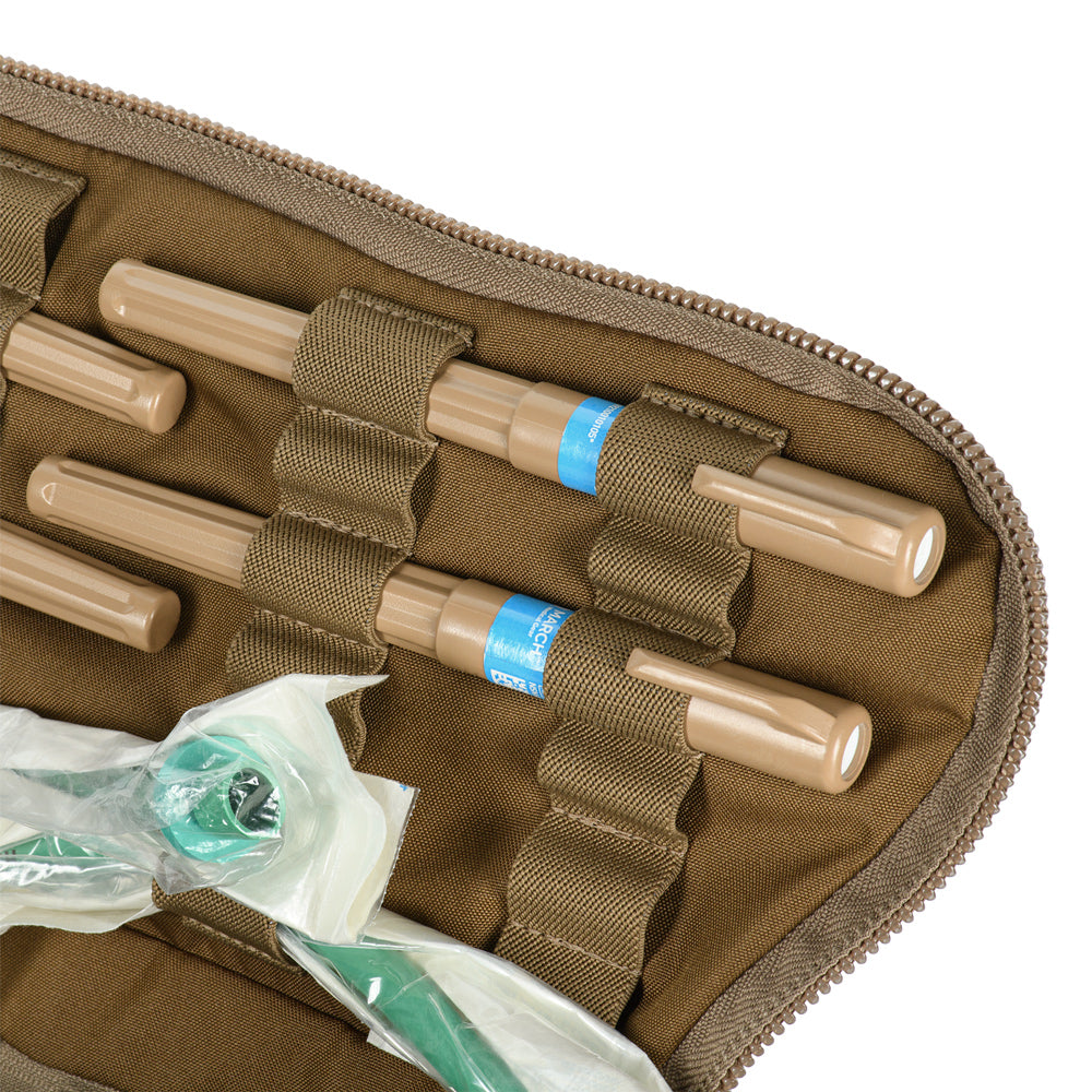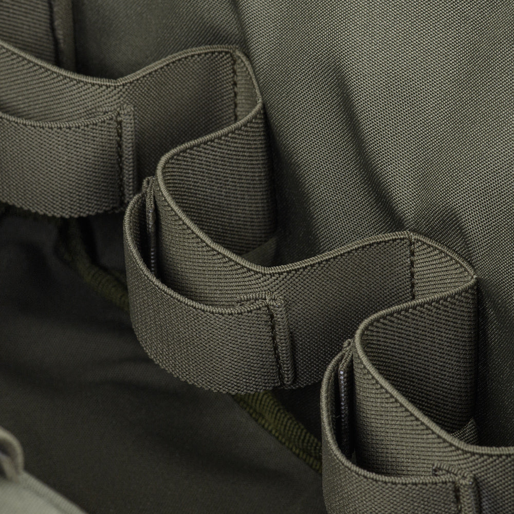 The Elite medical bag features a single main compartment equipped with an organizer specifically adapted to the MARCH algorithm (used in the TCCC – Tactical Combat Casualty Care concept, applied at the second stage of care: Tactical Field Care, or in the yellow/green zone). The back and side sections of the organizer are designed to store first-level medical supplies related to “M” (Massive bleeding), while the flap and front sections are intended for second and third levels — “A” (Airway Management) and “R” (Respiration). A large inner mesh pocket provides additional space for essential medical equipment.