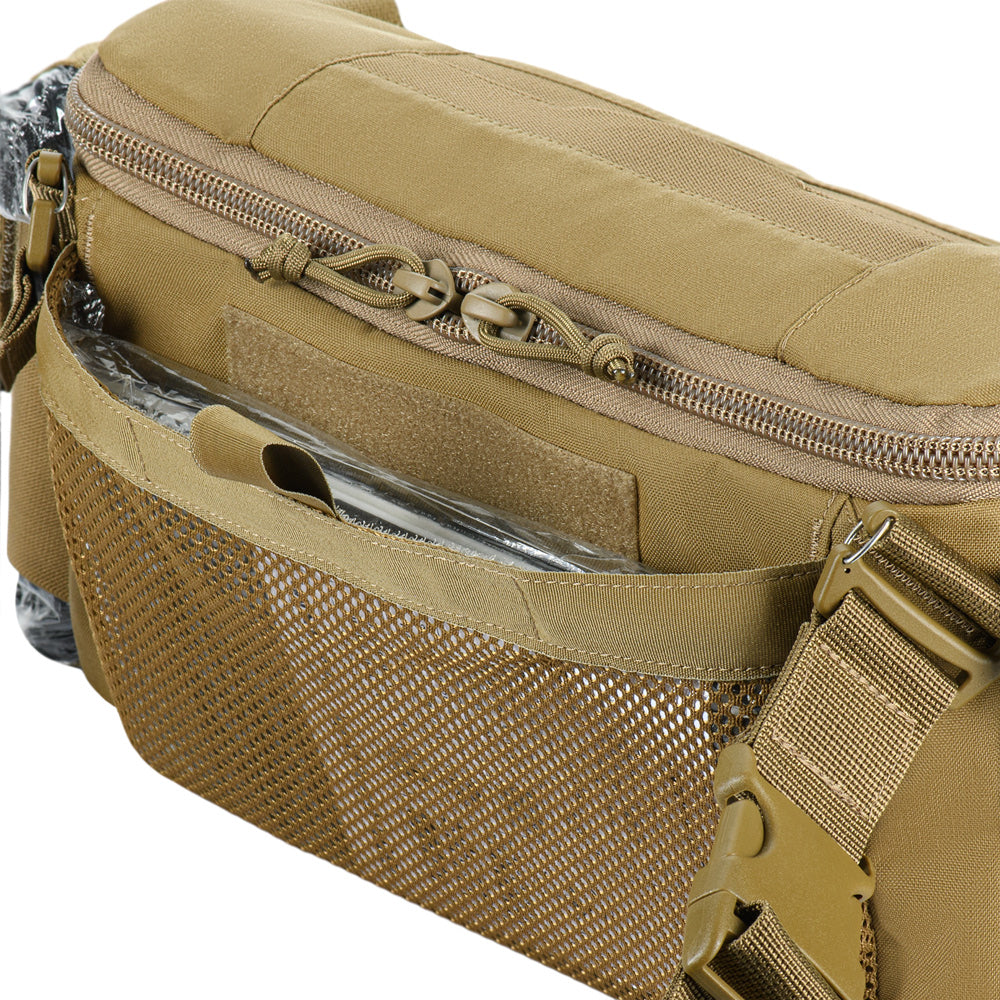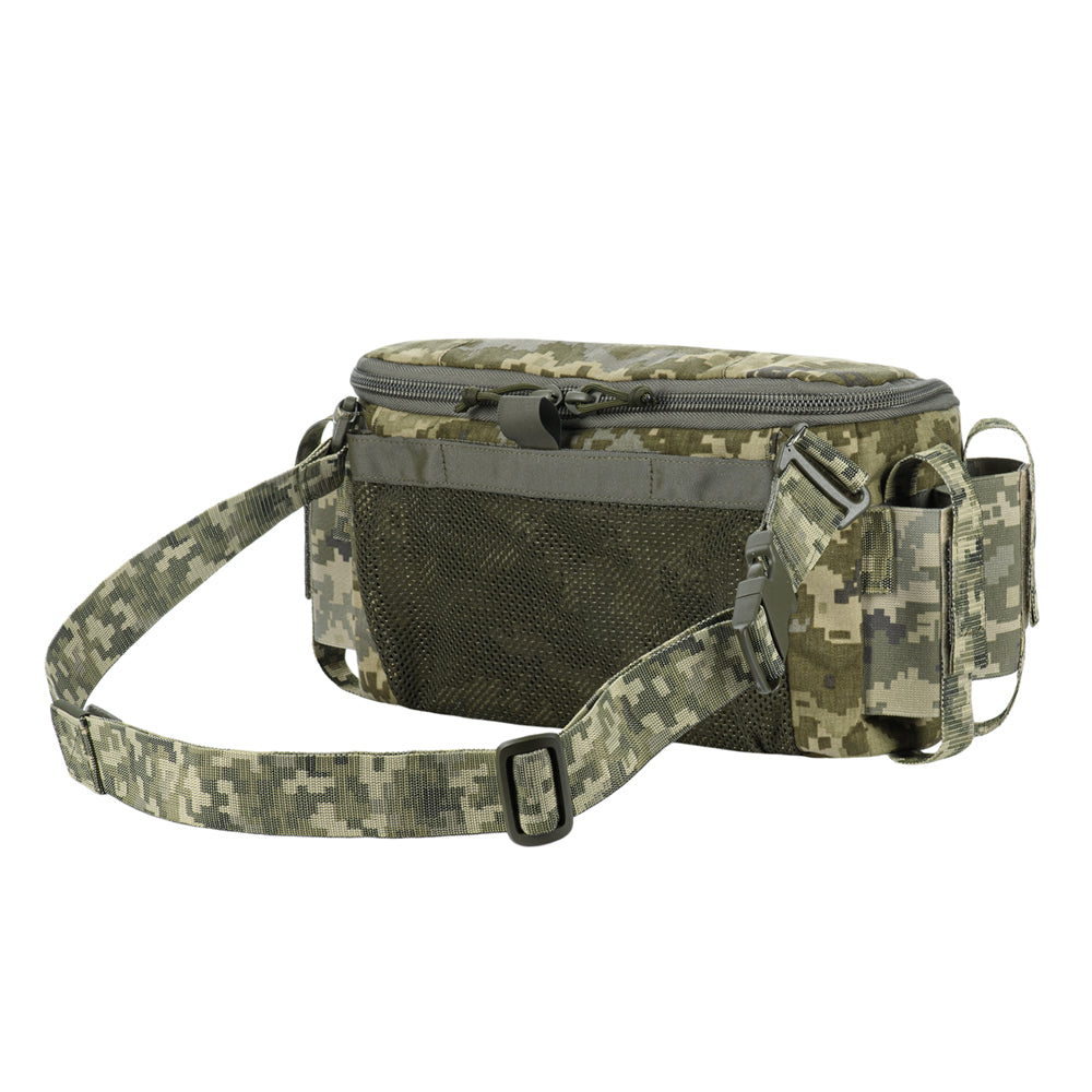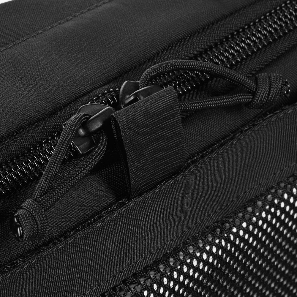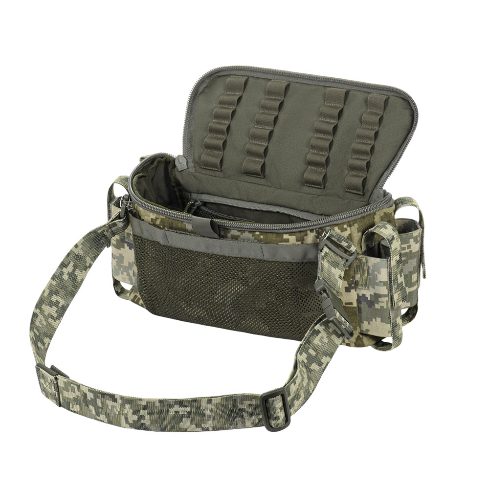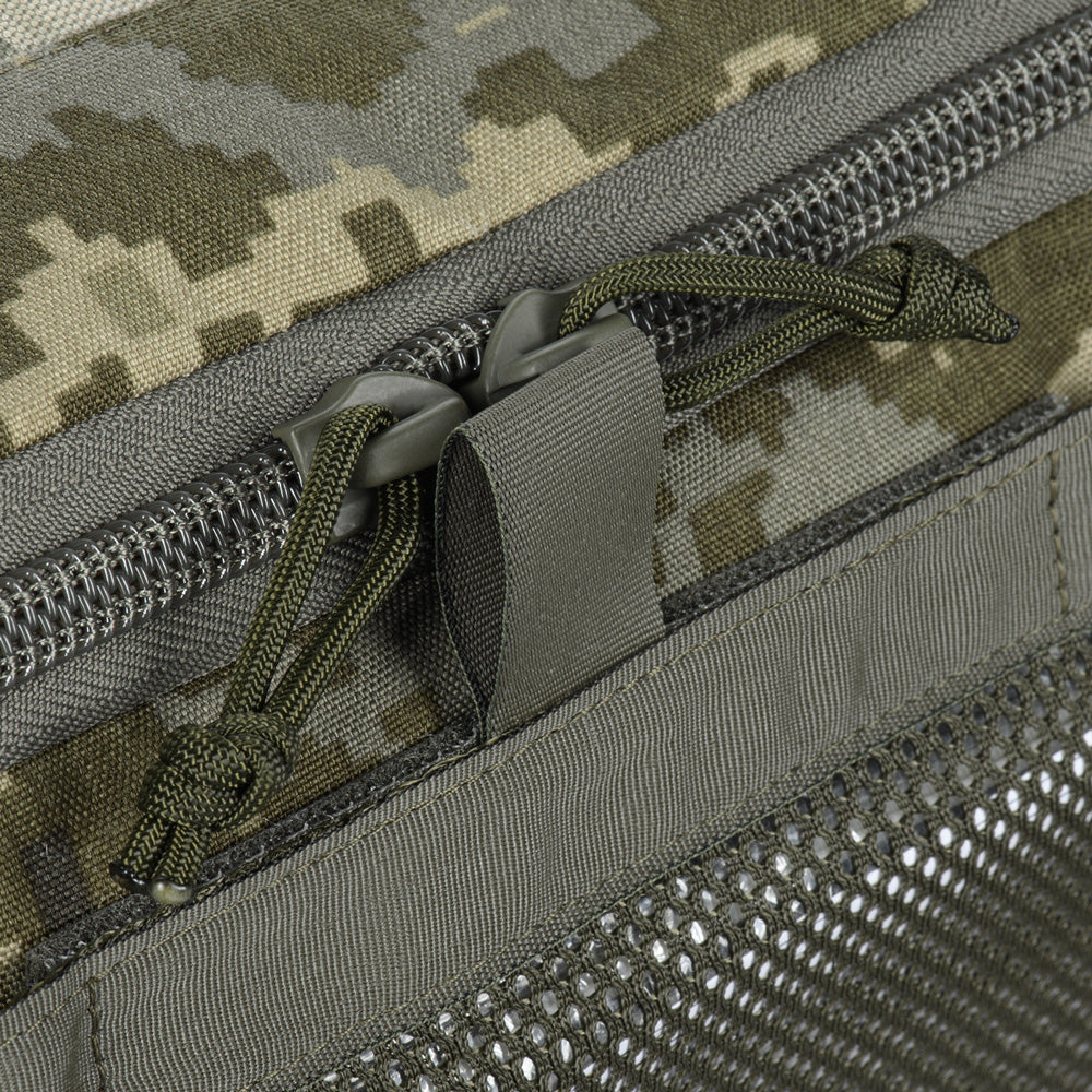 The Elite medical bag features a single main compartment equipped with an organizer specifically adapted to the MARCH algorithm (used in the TCCC – Tactical Combat Casualty Care concept, applied at the second stage of care: Tactical Field Care, or in the yellow/green zone). The back and side sections of the organizer are designed to store first-level medical supplies related to “M” (Massive bleeding), while the flap and front sections are intended for second and third levels — “A” (Airway Management) and “R” (Respiration). A large inner mesh pocket provides additional space for essential medical equipment.