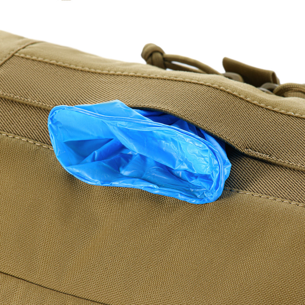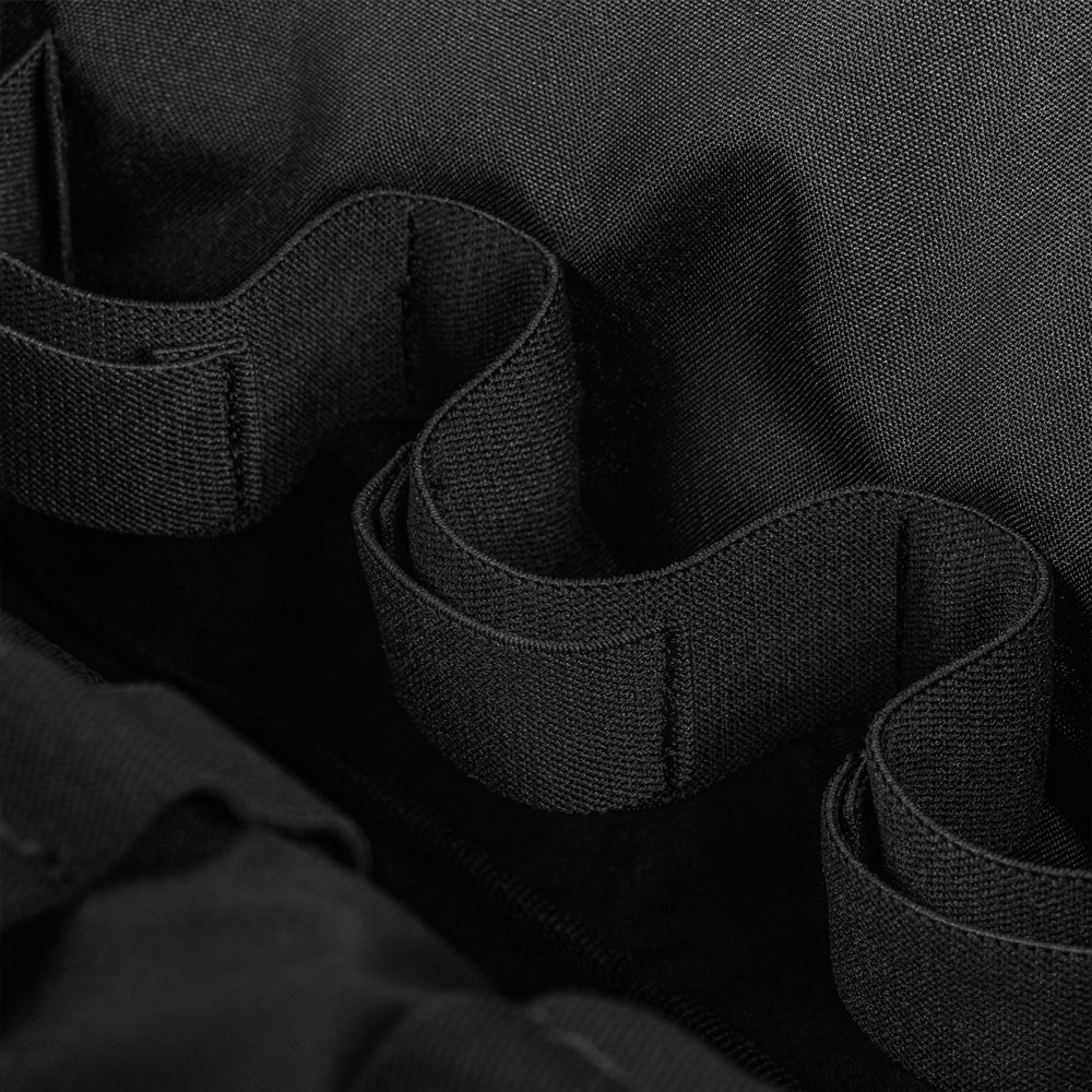 On the front panel, there is a dedicated shears holder, secured with webbing and a buckle. Each side of the bag includes four integrated tourniquet pouches, while elastic webbing inside ensures both reliable fixation and quick access to contents. The top flap integrates a pouch for medical gloves (optimized for up to 5 pairs). Front and rear compartments are designed to hold immobilization splints.
