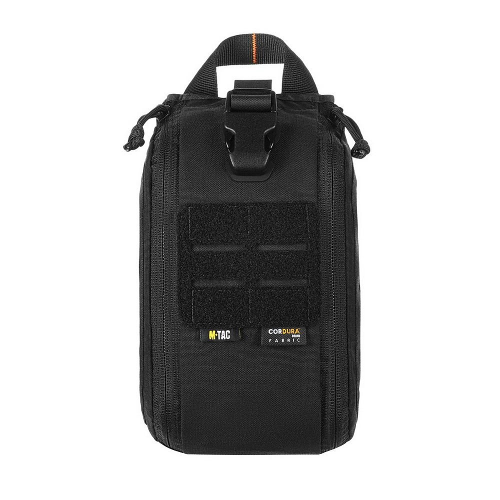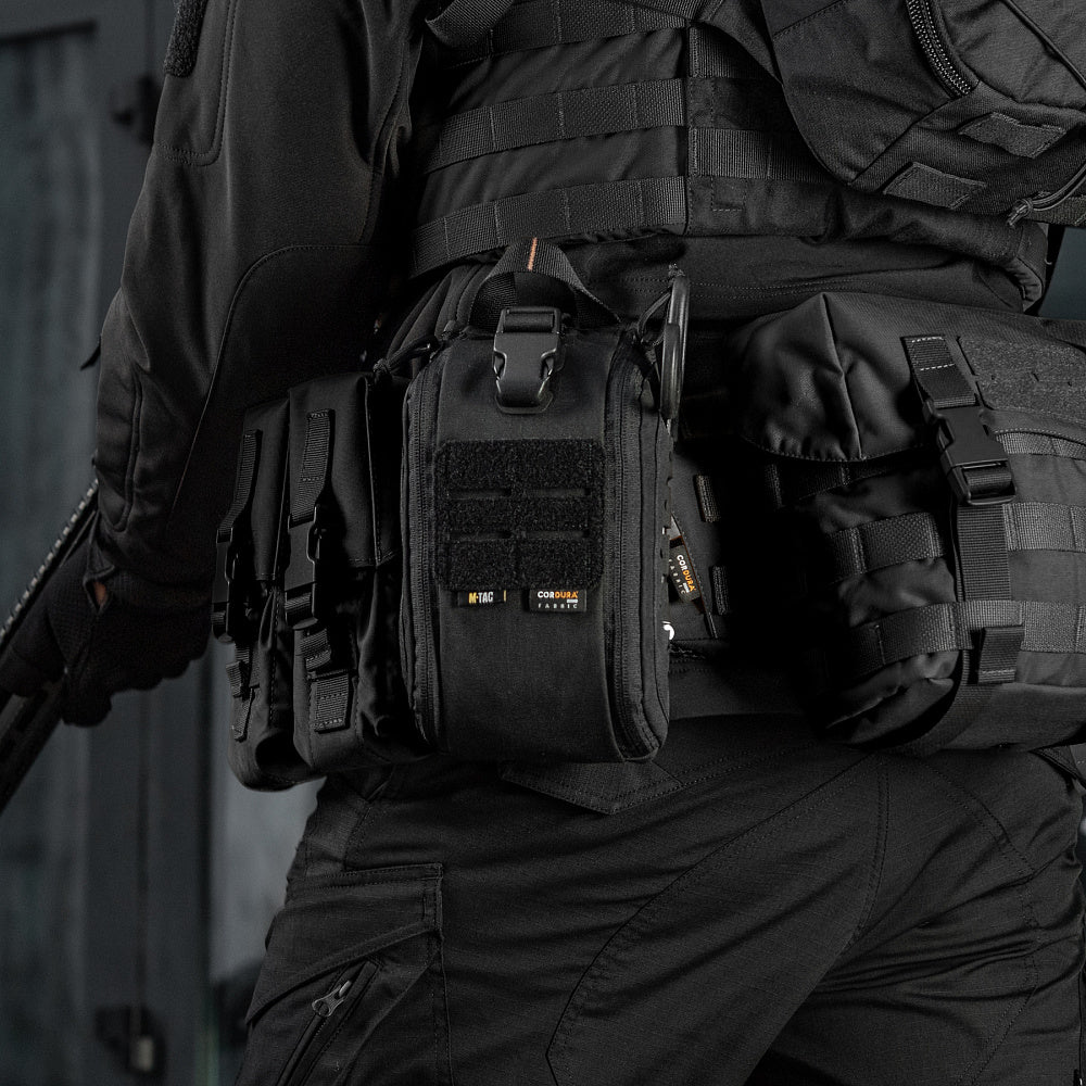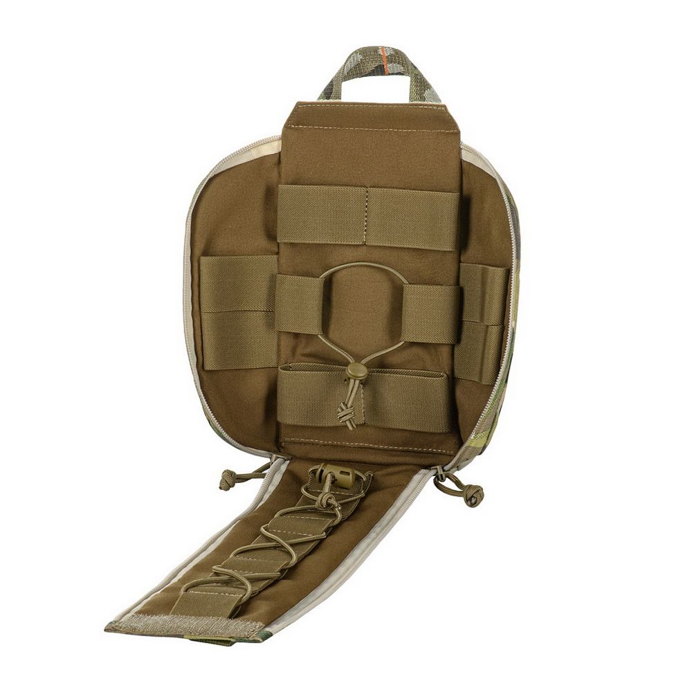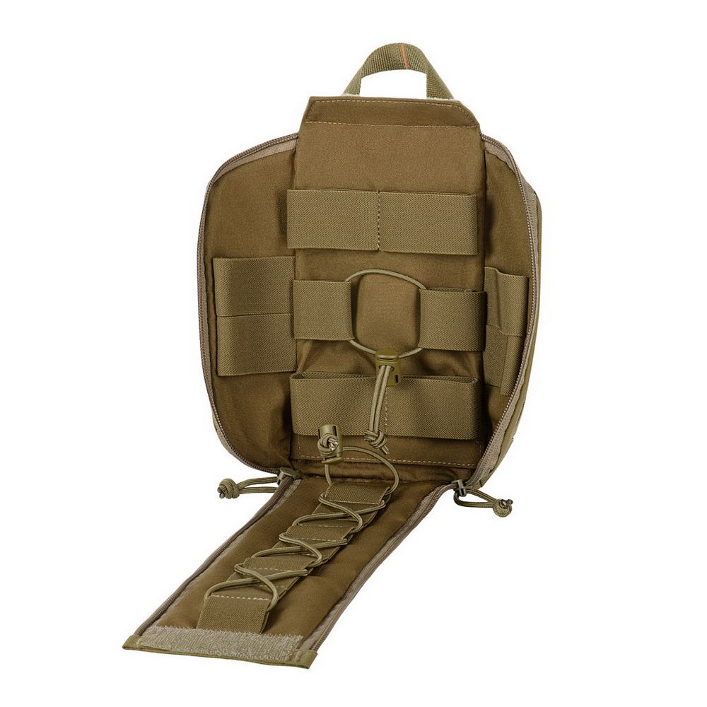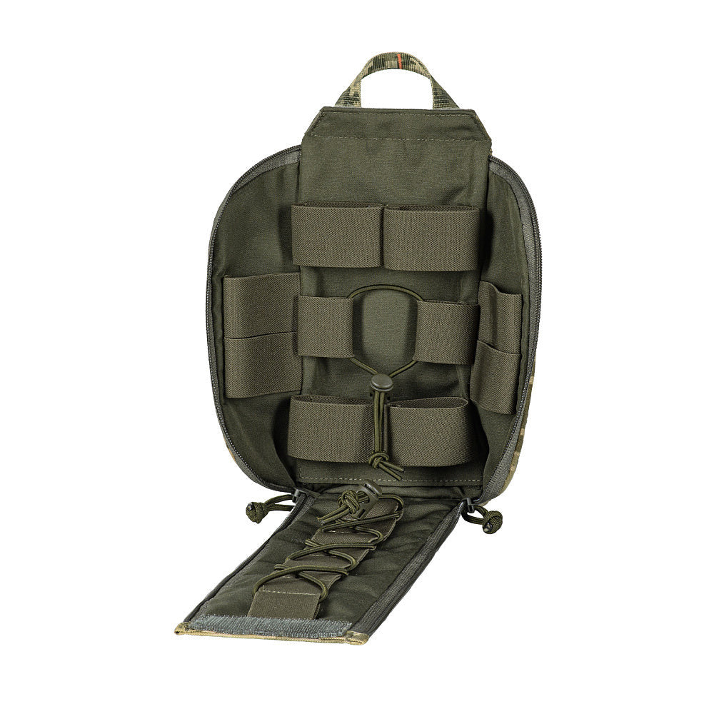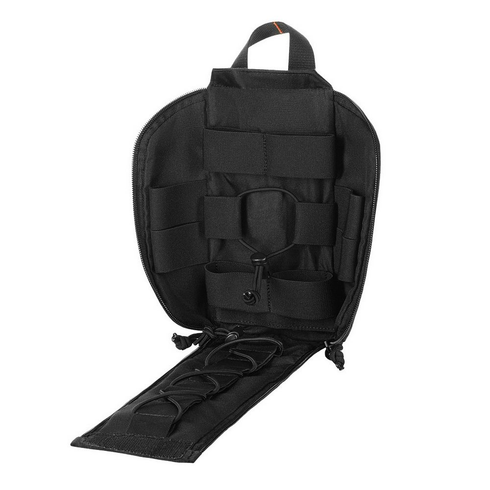 The pouch features a single compartment with an ultra-reliable dual YKK® zipper, which opens in a suitcase-style layout, granting full access to the interior. Inside, there's a well-organized layout made of elastic loops for securing medical supplies. A VELCRO® Brand tab with a pull strap simplifies opening the pouch, while an additional quick-release strap with a buckle allows for fast detachment in emergency situations. A sturdy handle ensures comfortable hand carrying.