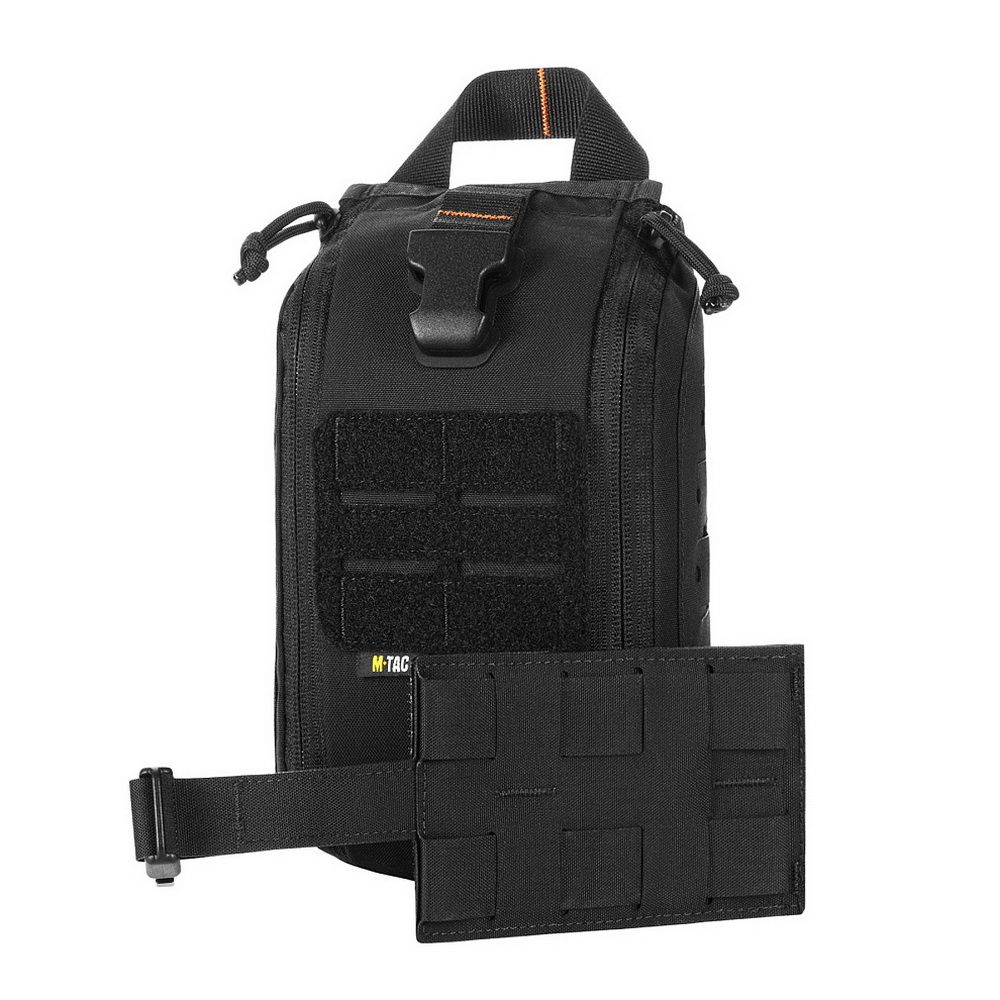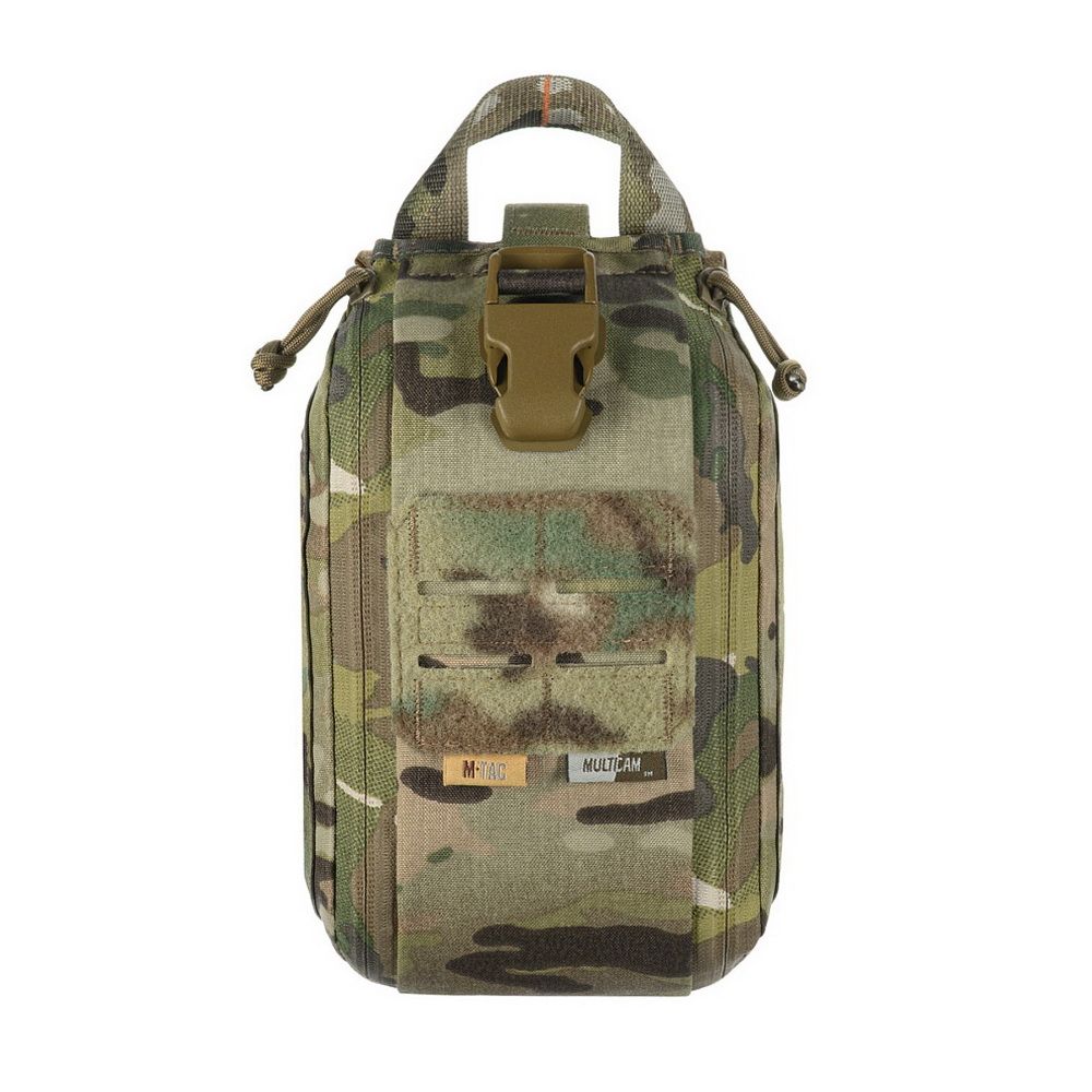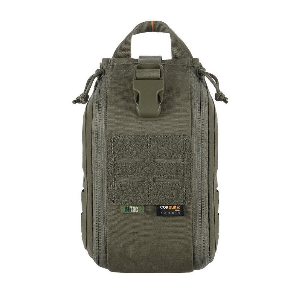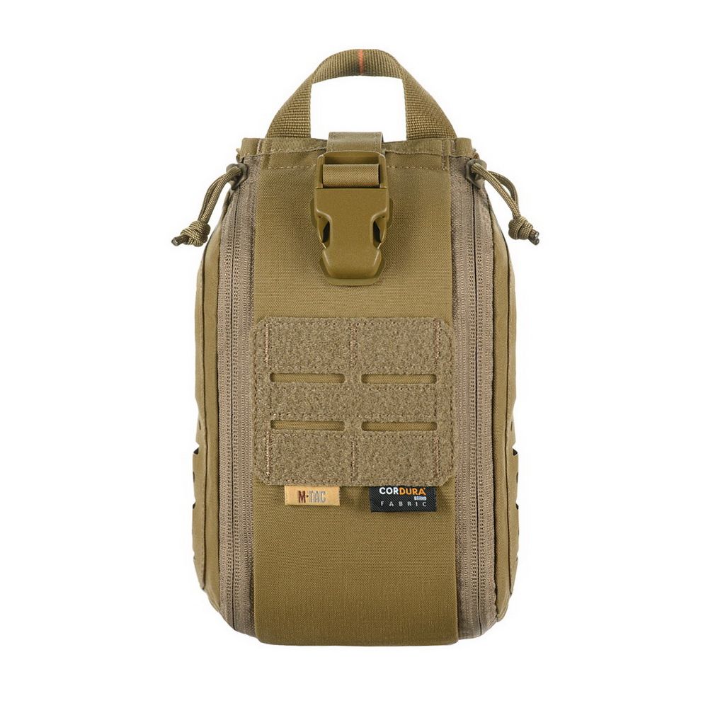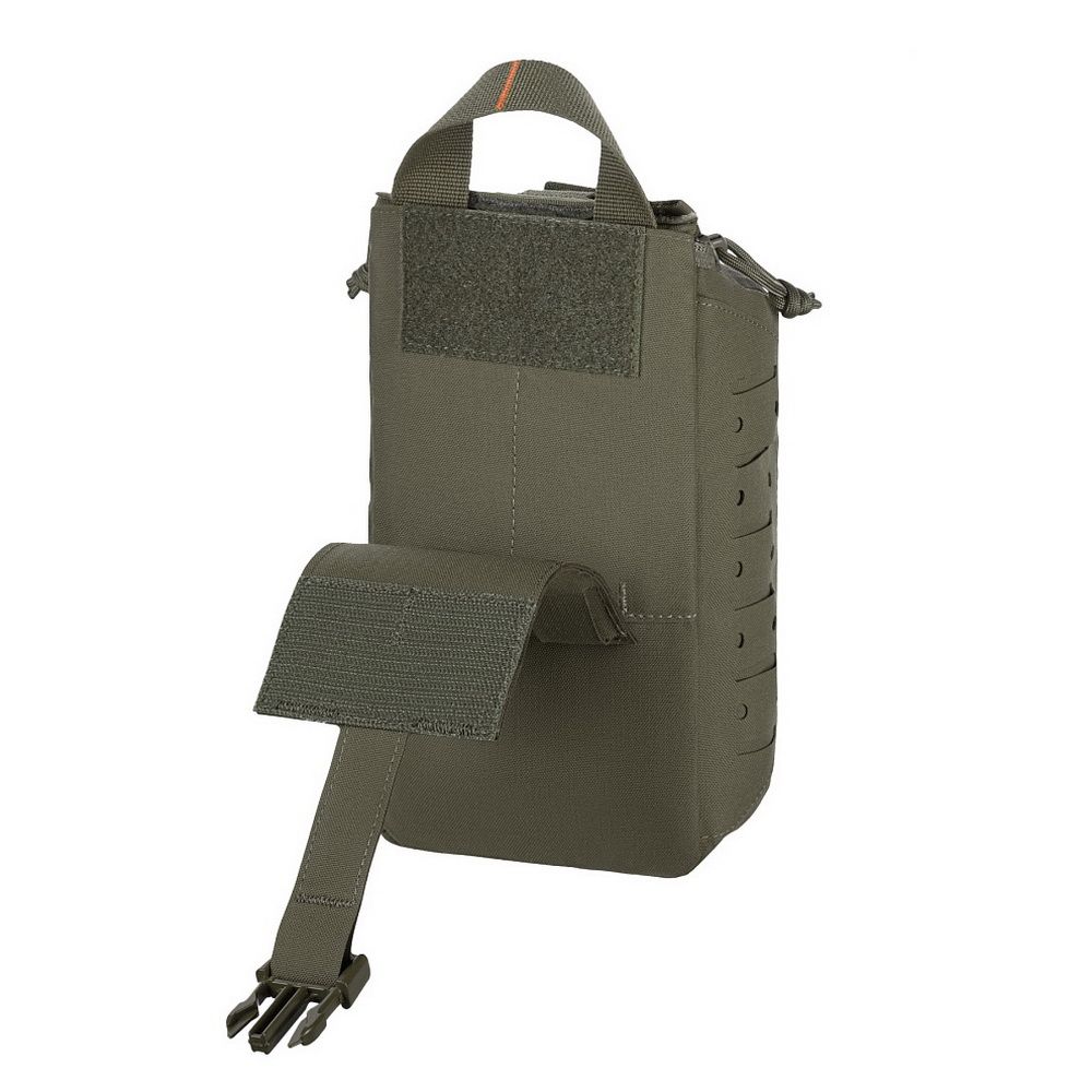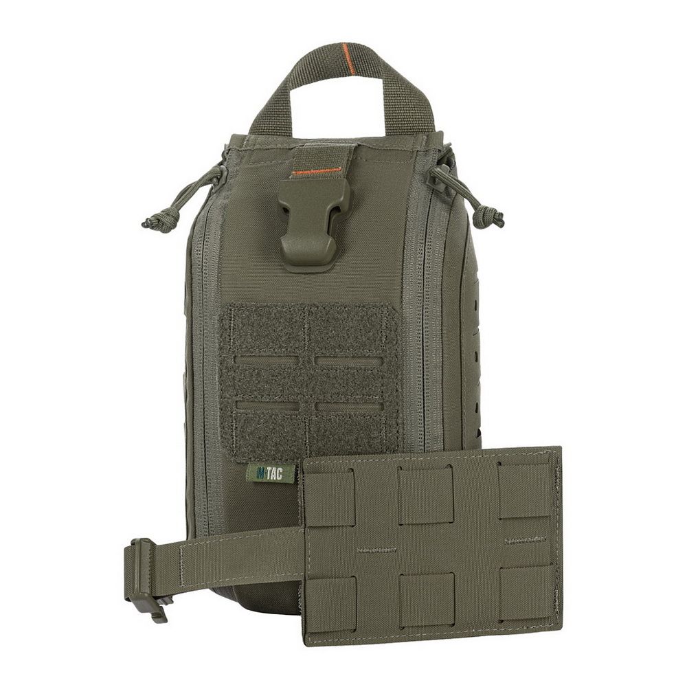 The pouch features a single compartment with an ultra-reliable dual YKK® zipper, which opens in a suitcase-style layout, granting full access to the interior. Inside, there's a well-organized layout made of elastic loops for securing medical supplies. A VELCRO® Brand tab with a pull strap simplifies opening the pouch, while an additional quick-release strap with a buckle allows for fast detachment in emergency situations. A sturdy handle ensures comfortable hand carrying.