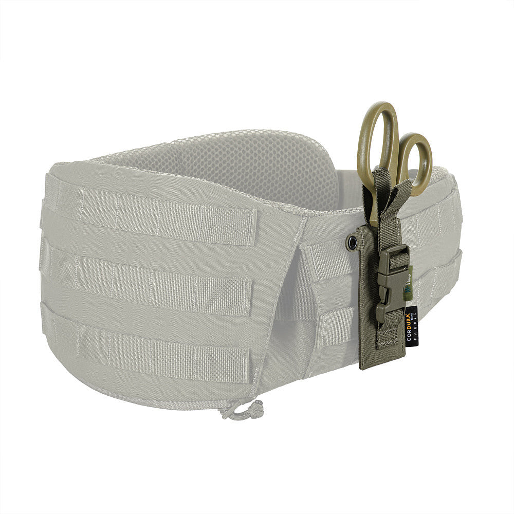 The pouch reliably holds the shears in place with a Woojin buckle strap. The strap is adjustable, allowing it to fit scissors of various sizes. On the side, there is a special grommet for attaching a retention lanyard or other compatible gear.