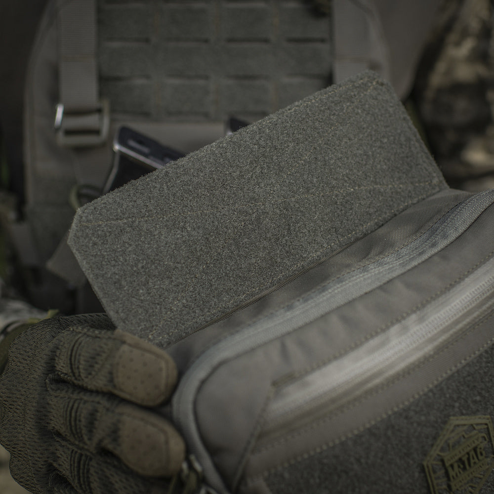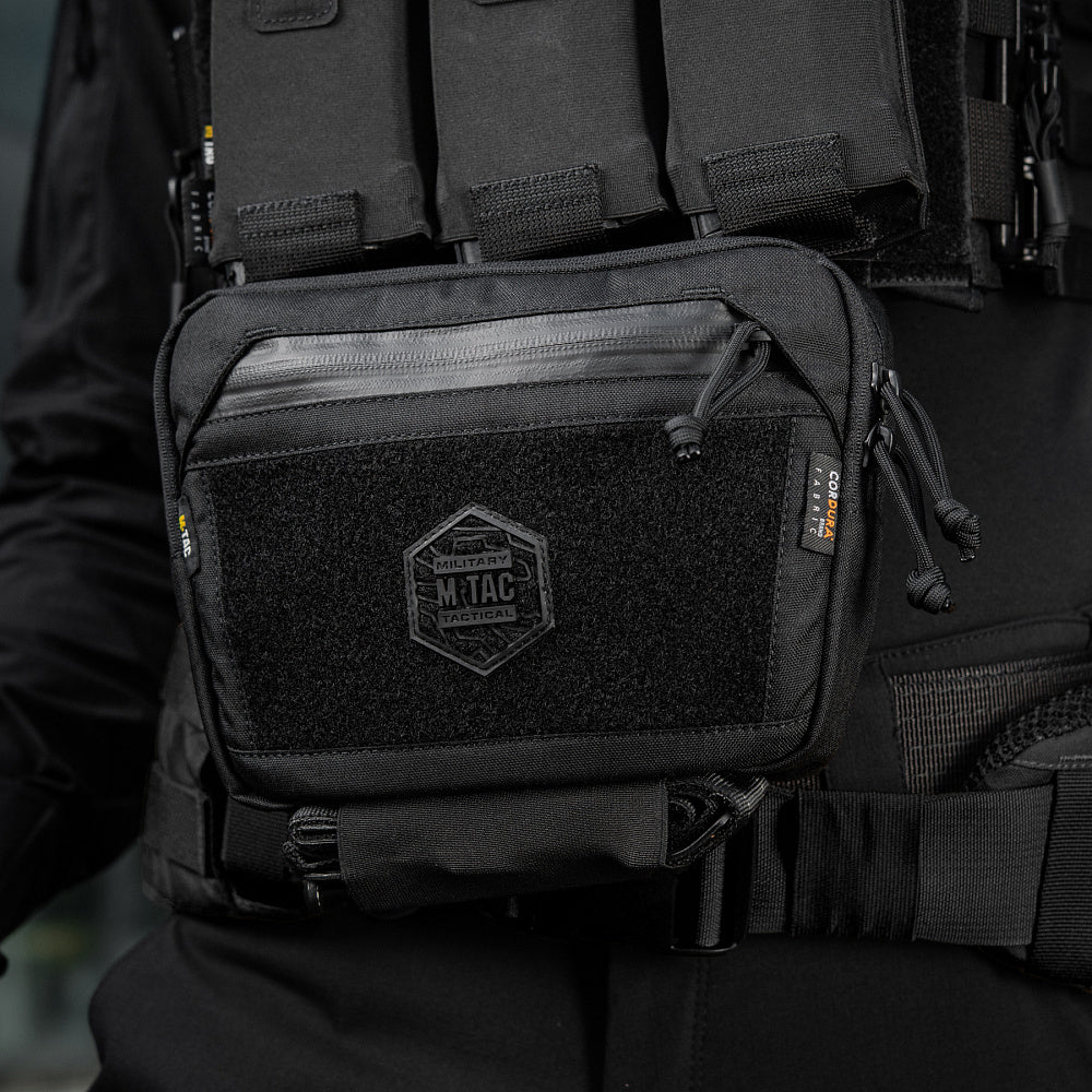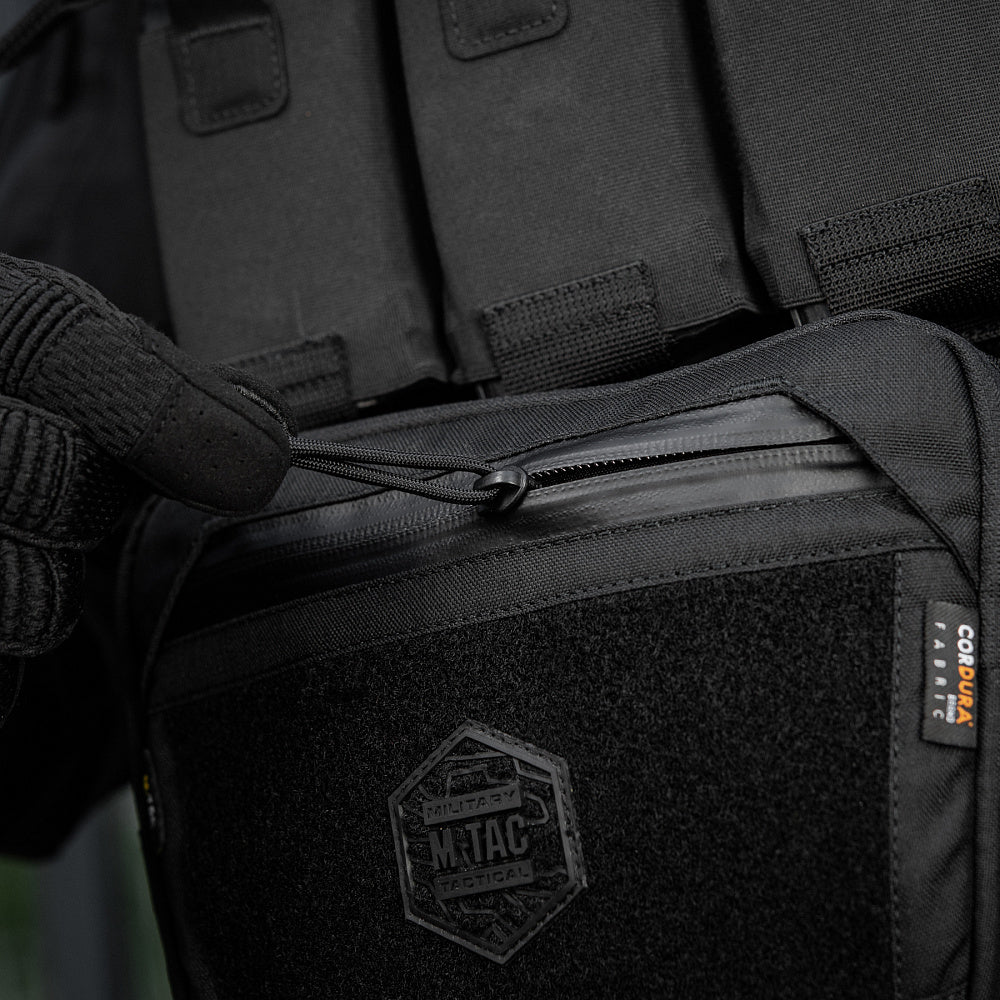 The lower bag includes three compartments for organizing essential items. The front features a Velcro panel with a signature M-Tac hexagon logo. The rear section accommodates an M-Tac Class 1A ballistic package (not included), adding optional ballistic protection. An elastic tourniquet holder is integrated at the bottom for quick emergency access.