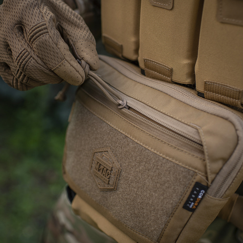Made from Cordura 500D, it provides excellent resistance to abrasion and heavy loads. YKK® zippers ensure durability and reliable performance in all conditions. A full-length Velcro mounting strap allows attaching the bag directly to the Velcro panel under a plate carrier flap, increasing overall functionality.