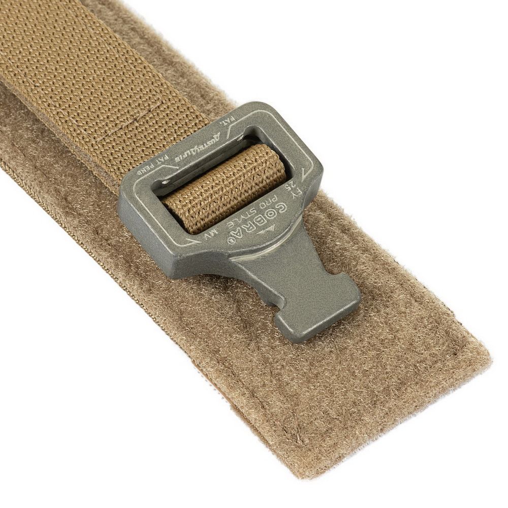 The Range Belt Cobra Buckle Gen. IV consists of two adjustable belts—an inner and an outer one. The outer belt is made from Tegris thermoplastic composite and is covered with Cordura Squadron, a lightweight, ultra-strong, and tear-resistant fabric. The inner belt is also made from Cordura Squadron and features Velcro and a metal oval ring for size adjustment and secure fixation of items, preventing them from slipping.