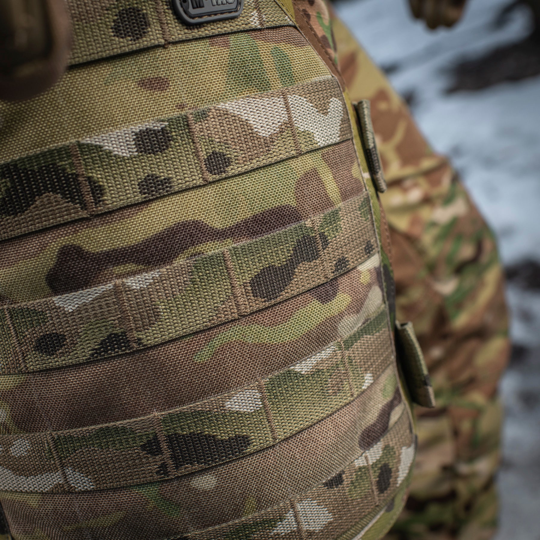 The panel includes five rows of MOLLE webbing, allowing you to attach mission-critical equipment such as a pistol holster, magazine pouches, grenade pouches, a medical pouch, a radio pouch, and other accessories.